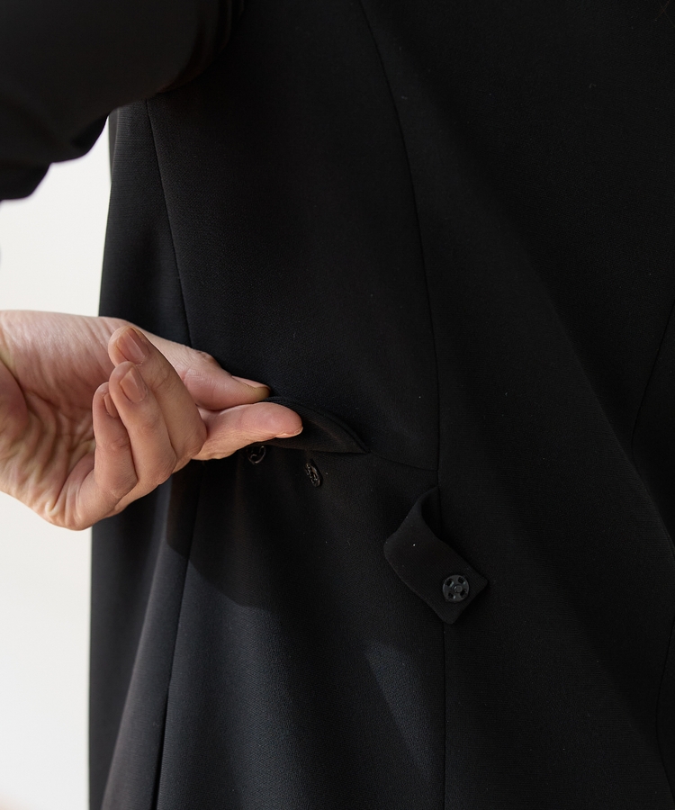前身頃の切替に沿ってファスナーで開閉でき、着脱がラクラク。