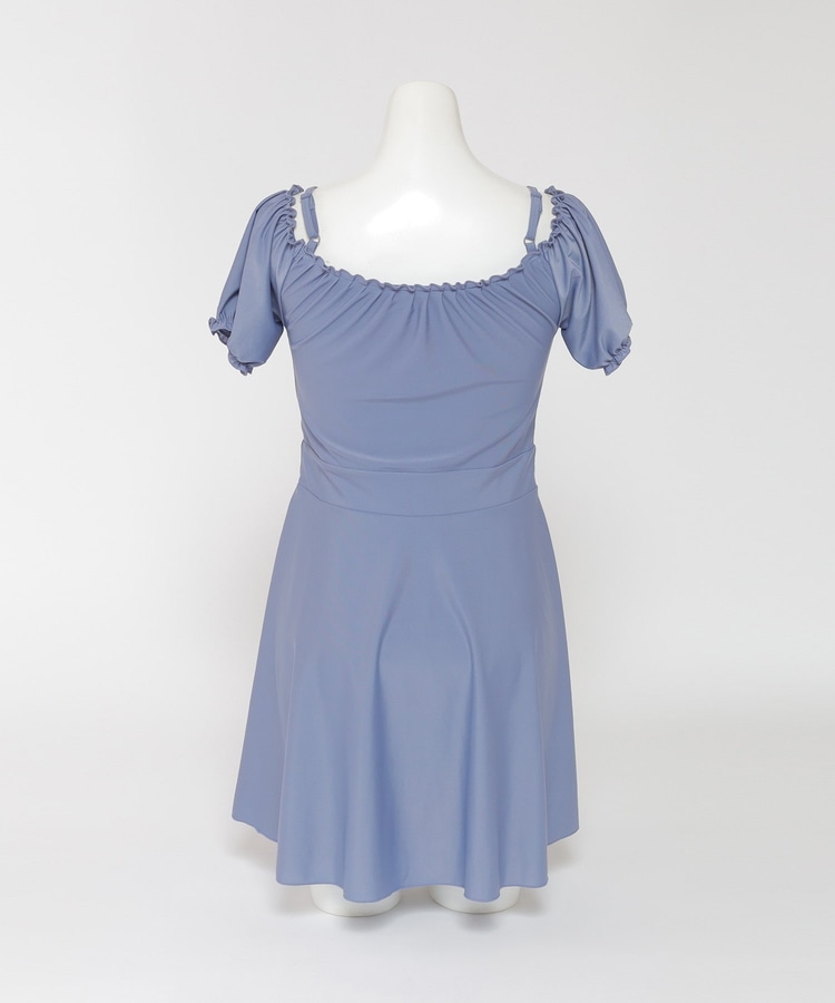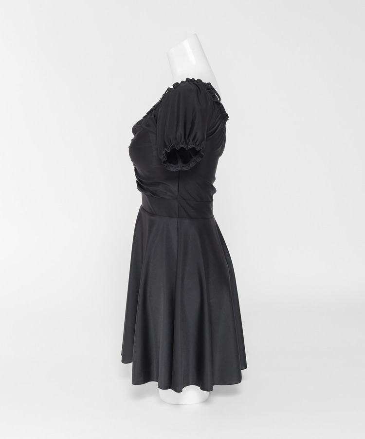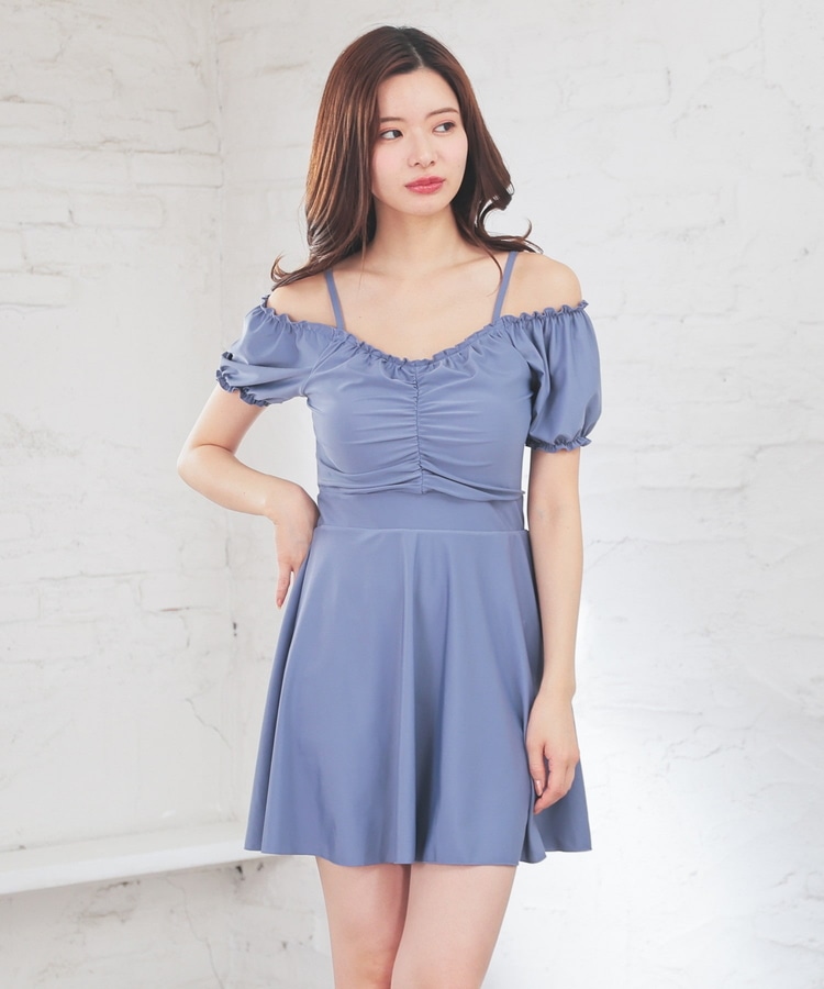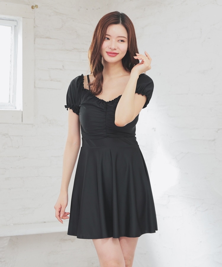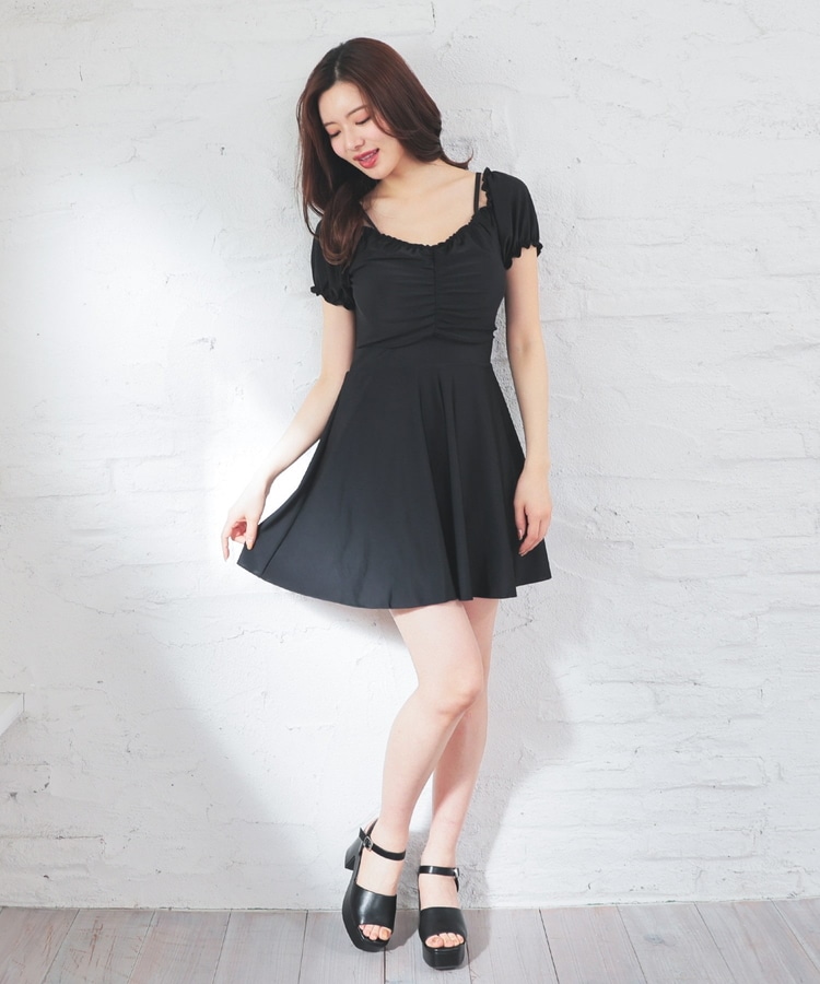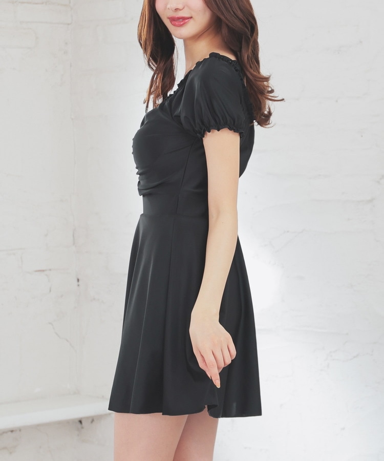 ふんわり広がるフレアシルエットに、胸元のギャザーがアクセント。