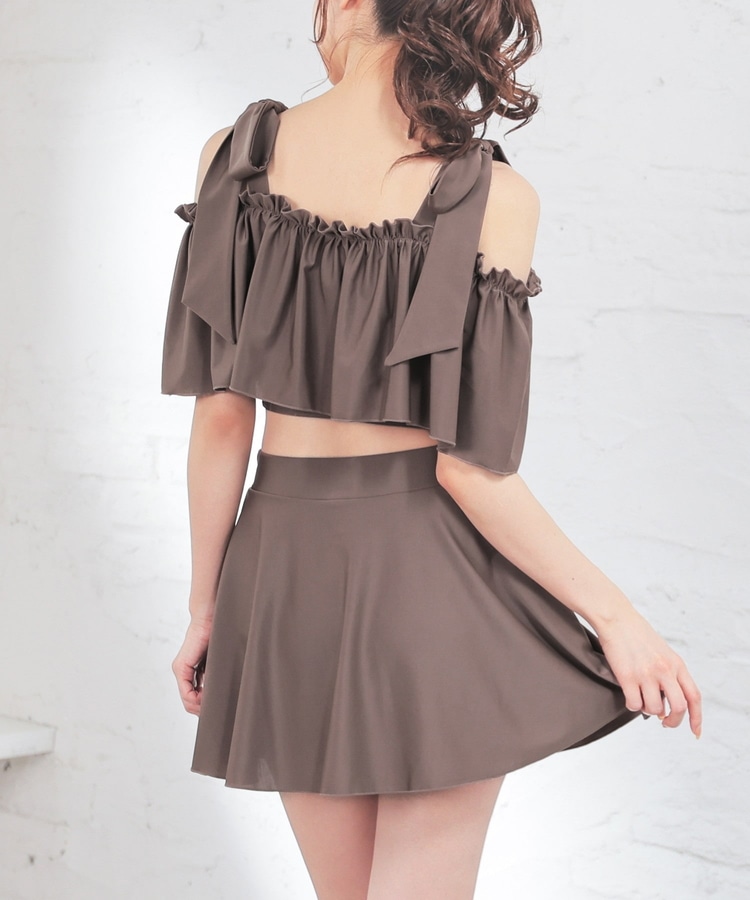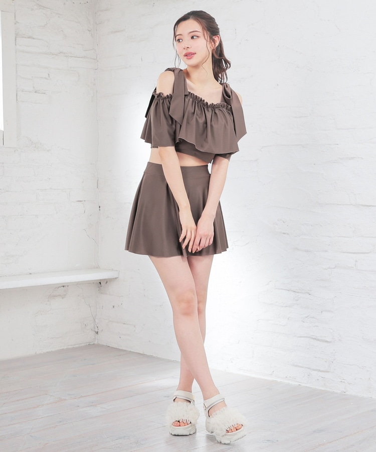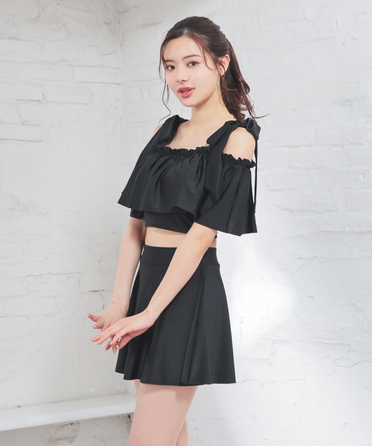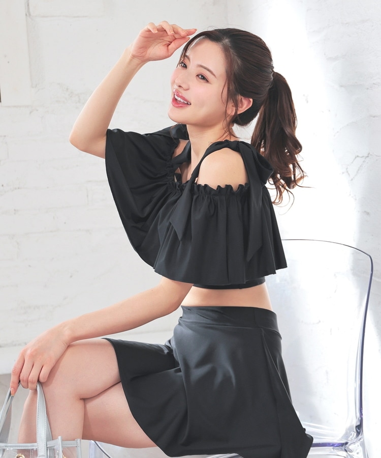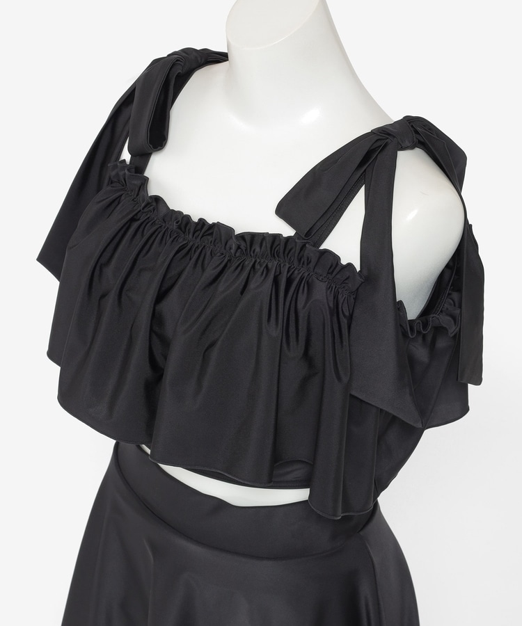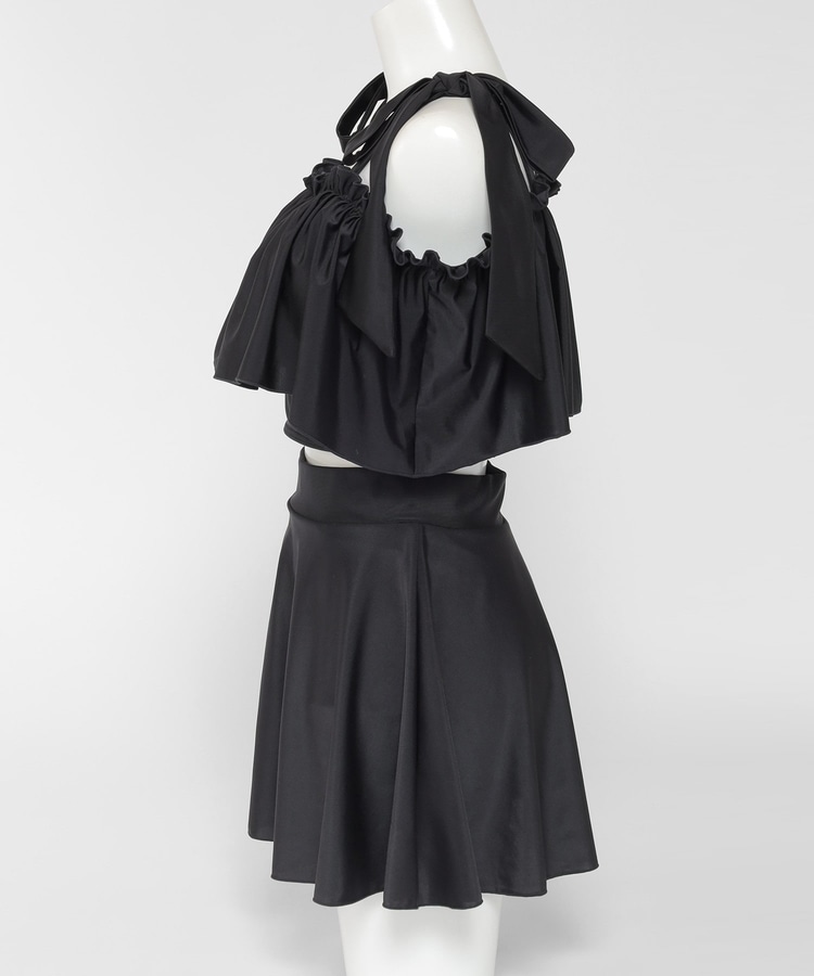 トップスは肩を隠して着用もでき、デコルテや肩・背中を美しく演出するオフショルダー型。