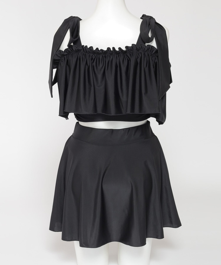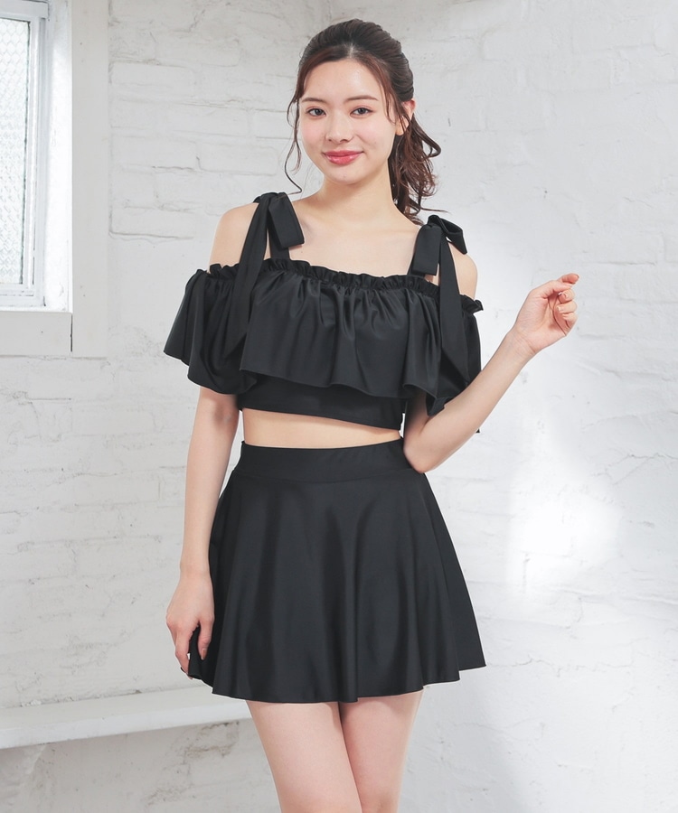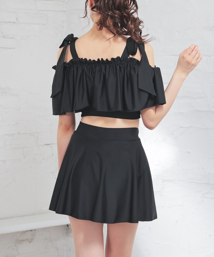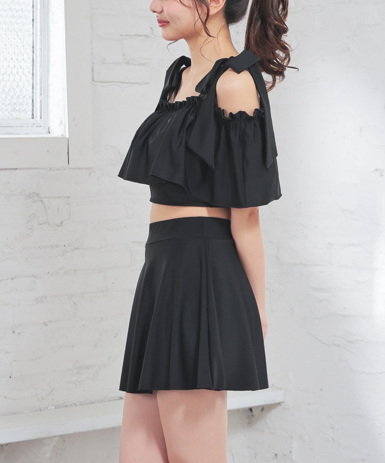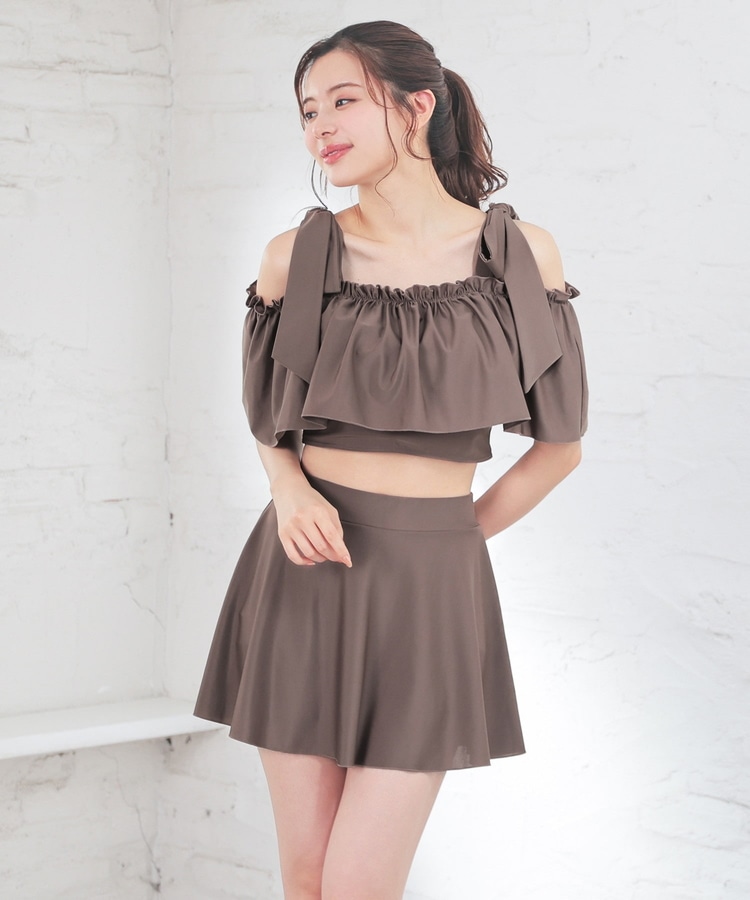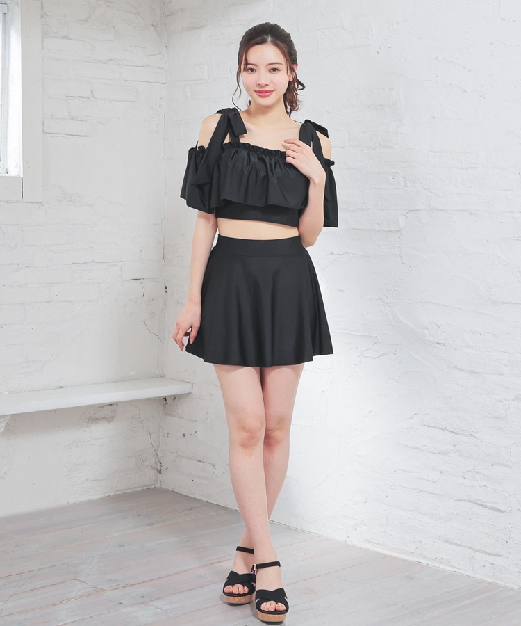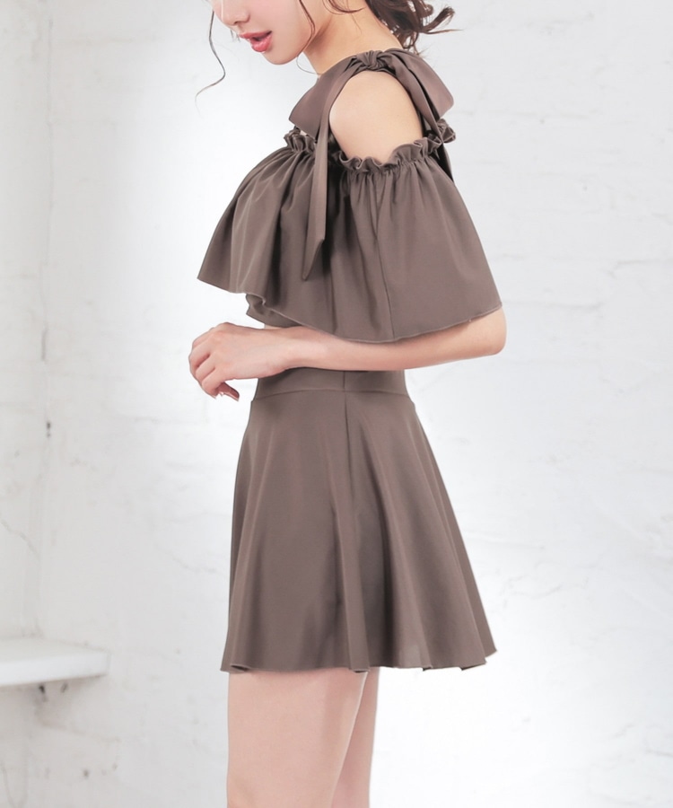トップスは肩を隠して着用もでき、デコルテや肩・背中を美しく演出するオフショルダー型。