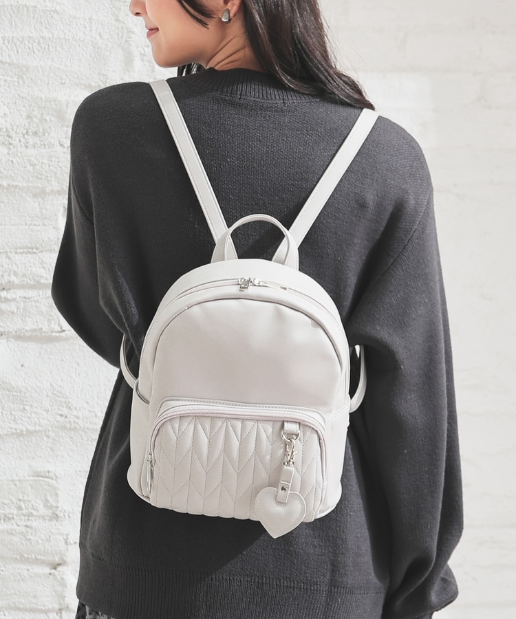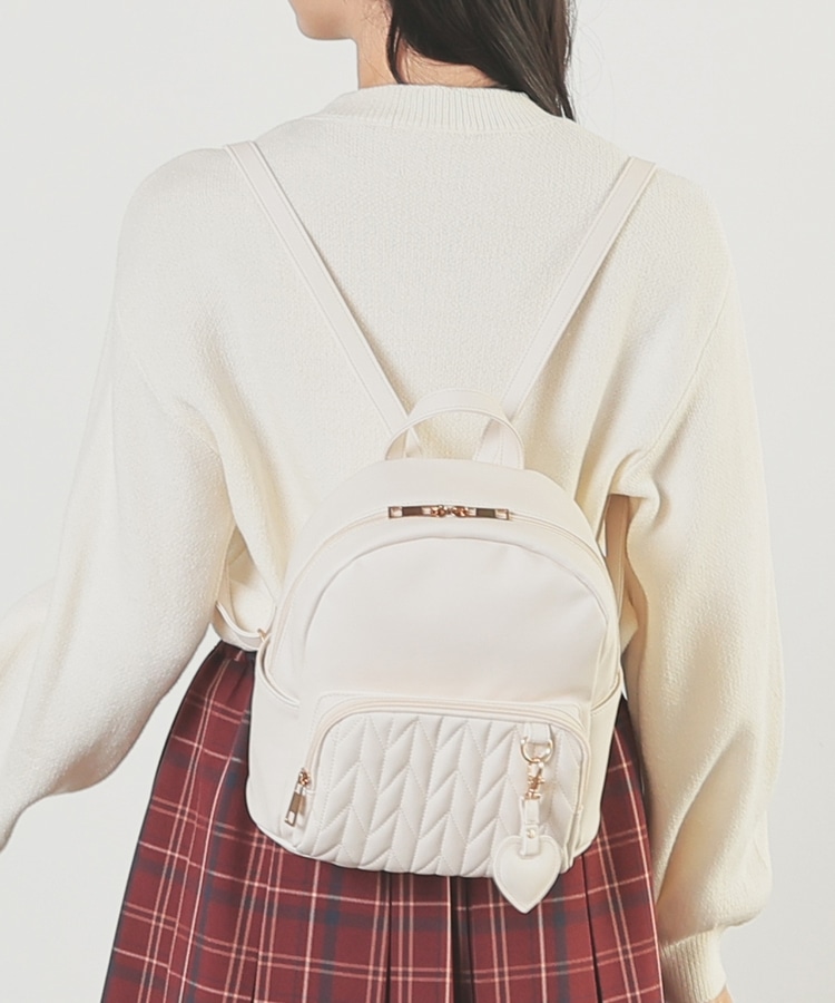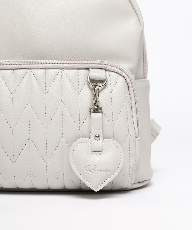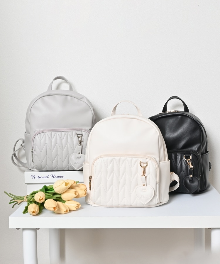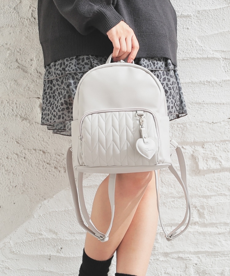 ポケットのステッチとハートモチーフのチャームがアクセント。