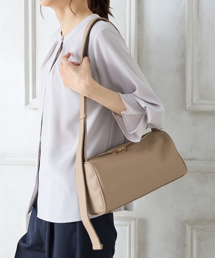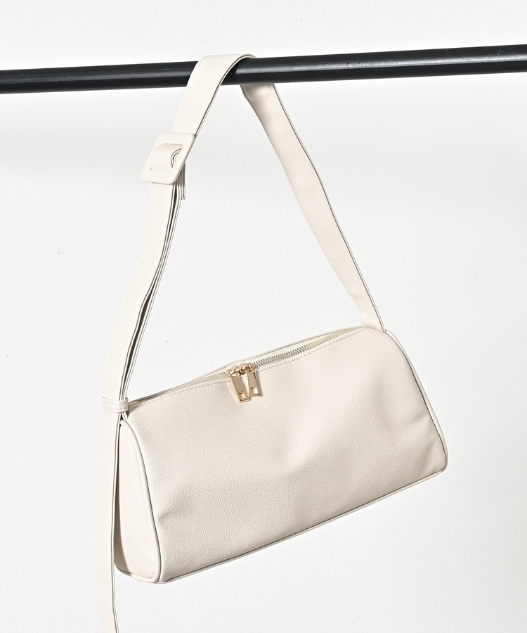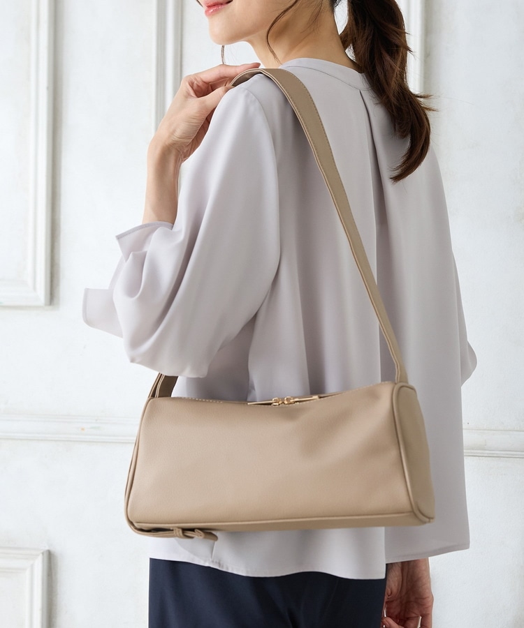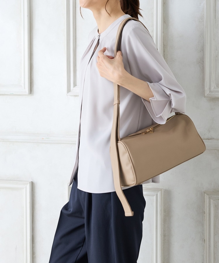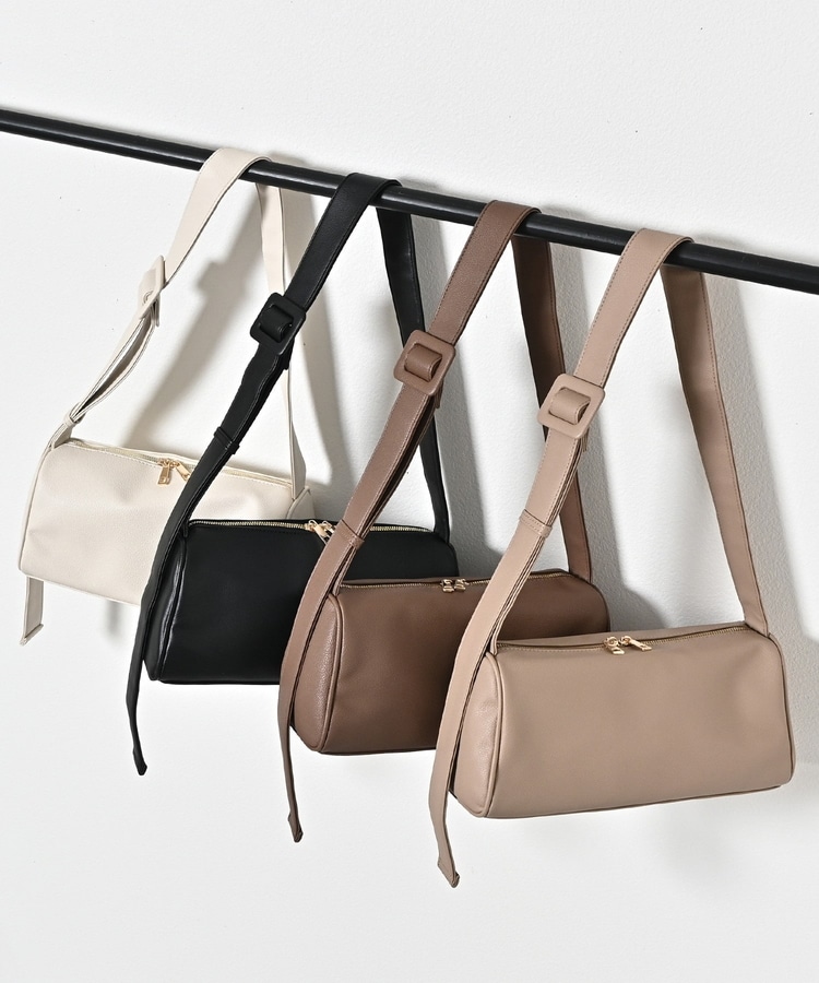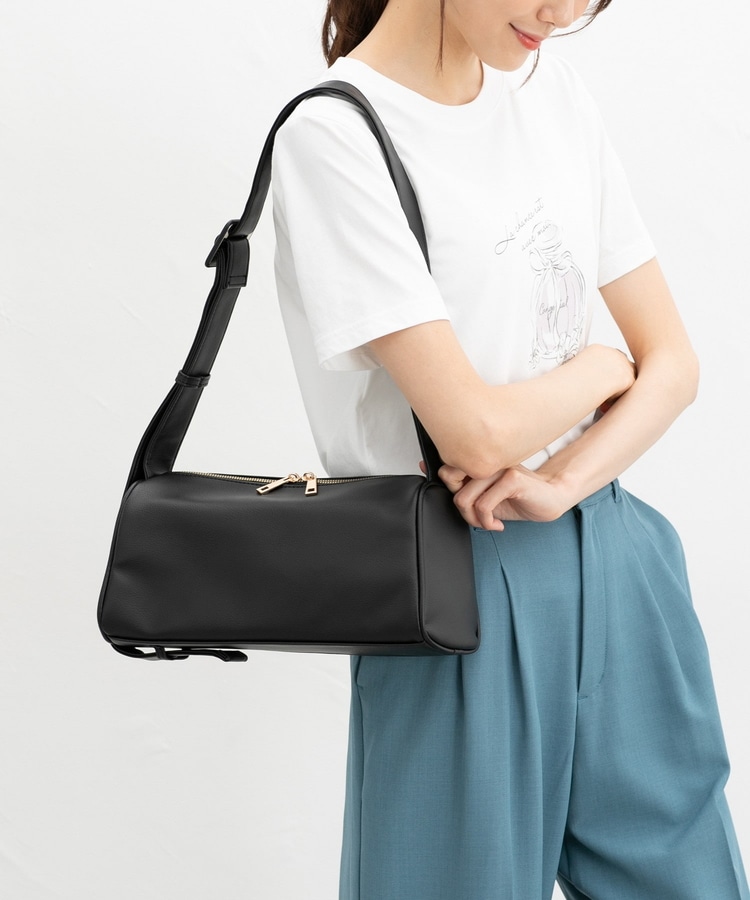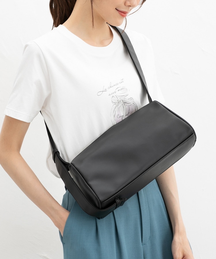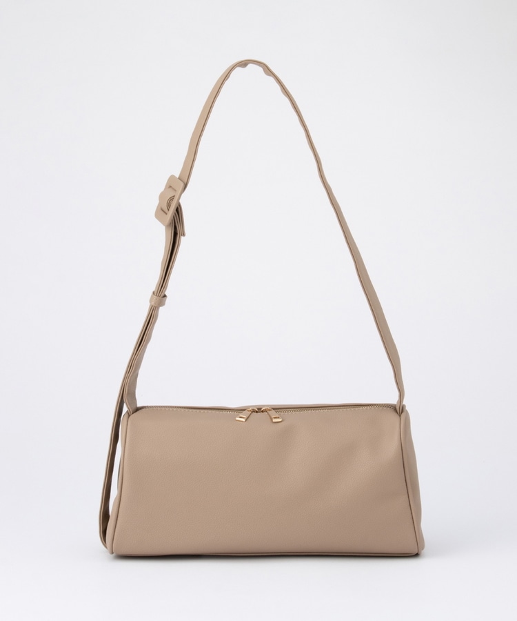 長さ調整可能なショルダーは、縮めたときに端を底面のループに通してすっきり収納可能。