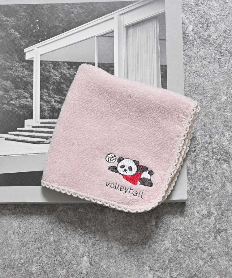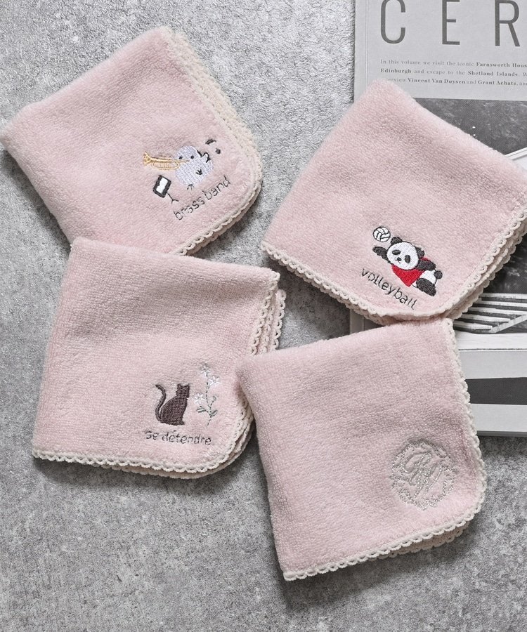 アニマルやロゴなどのキュートな刺繍とレースの縁取りがフェミニンなデザイン。