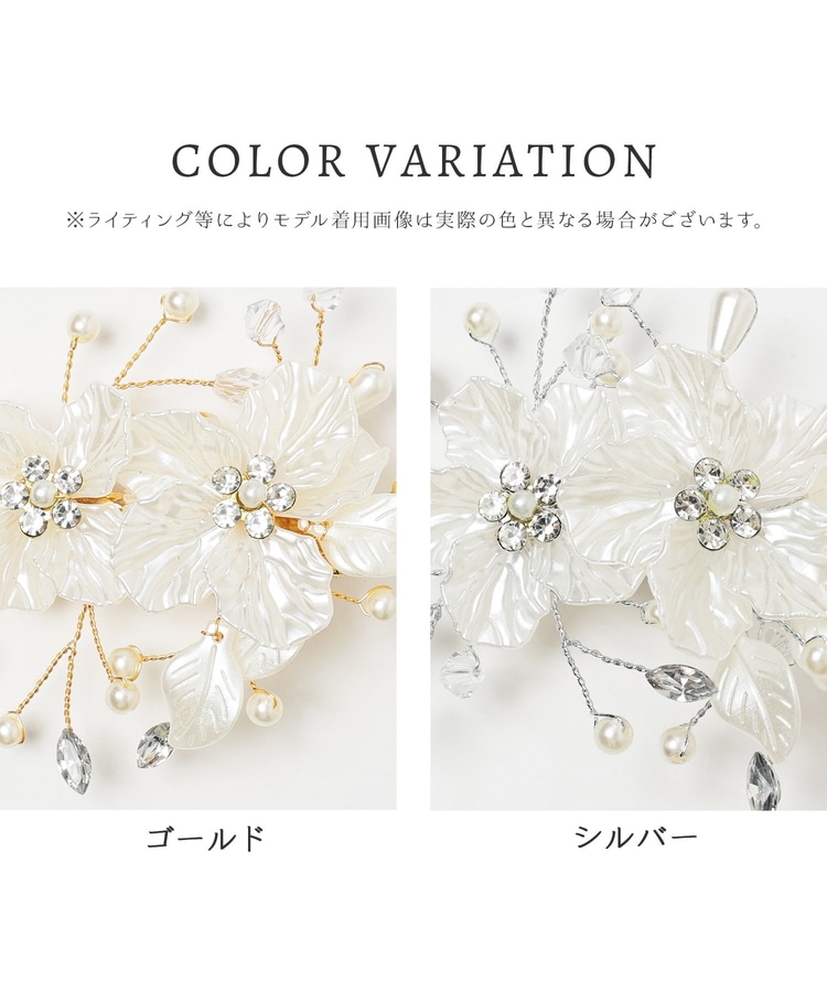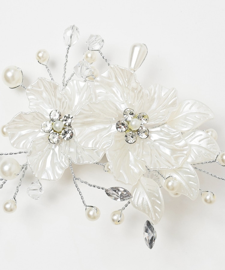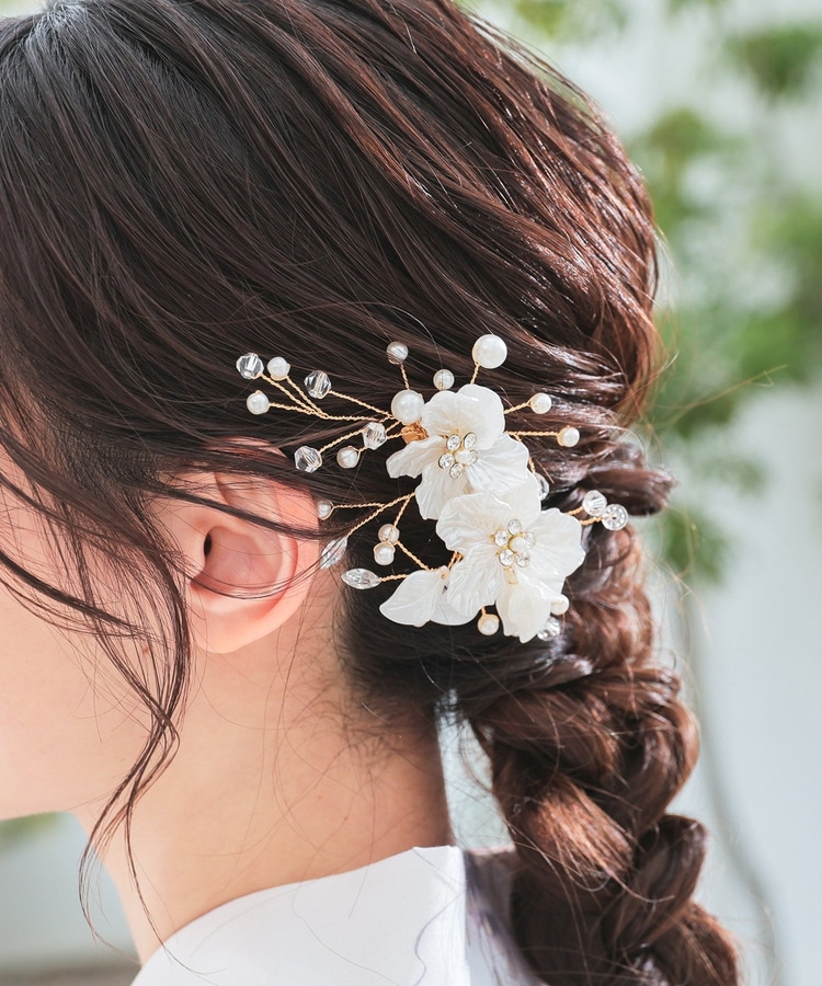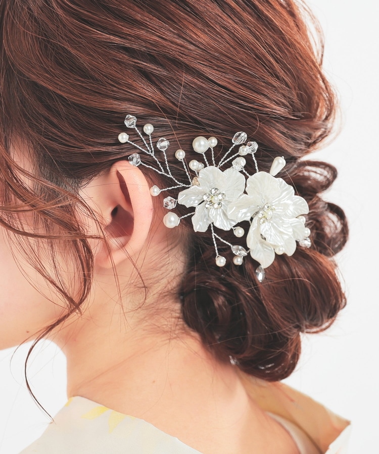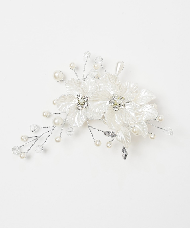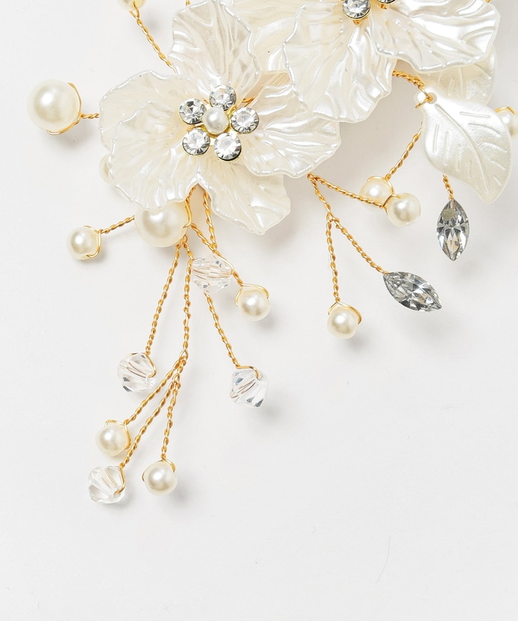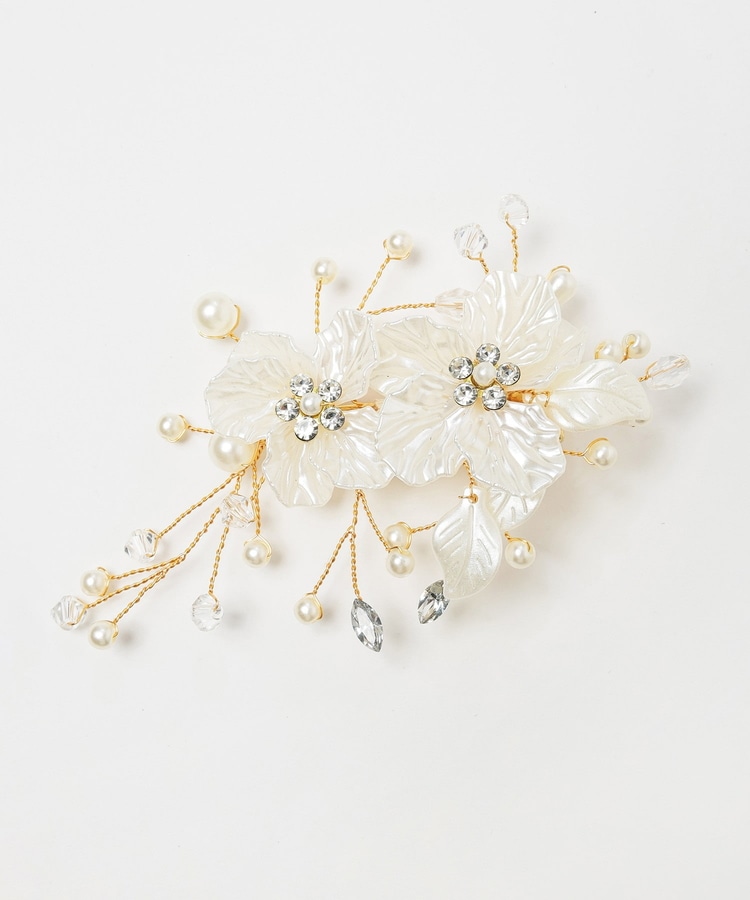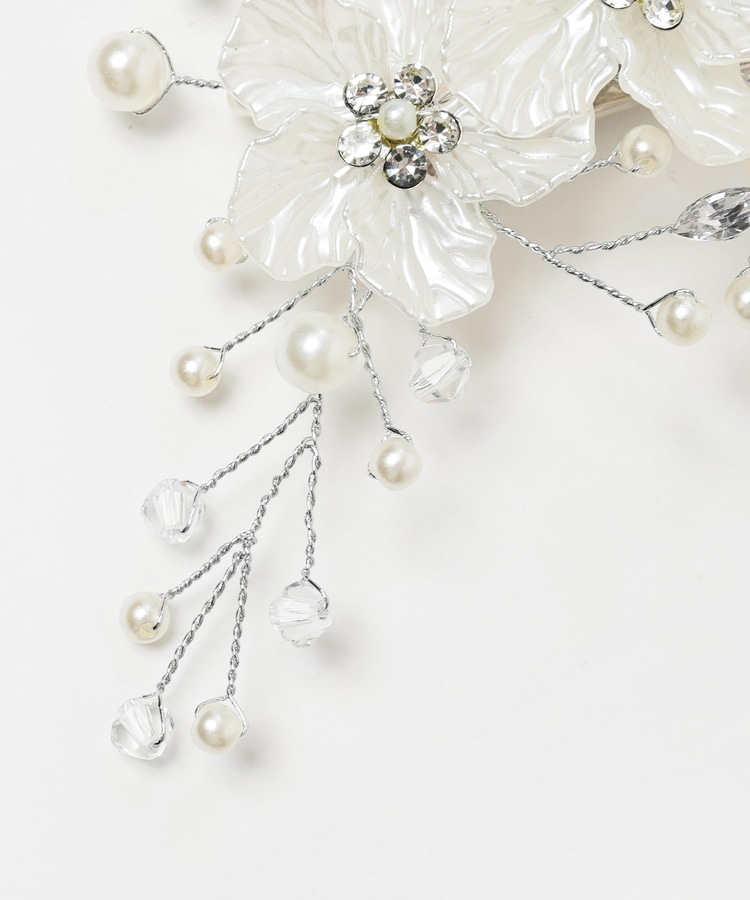 光沢のある花びらにパールビーズやビジューを添えた上品なデザイン。