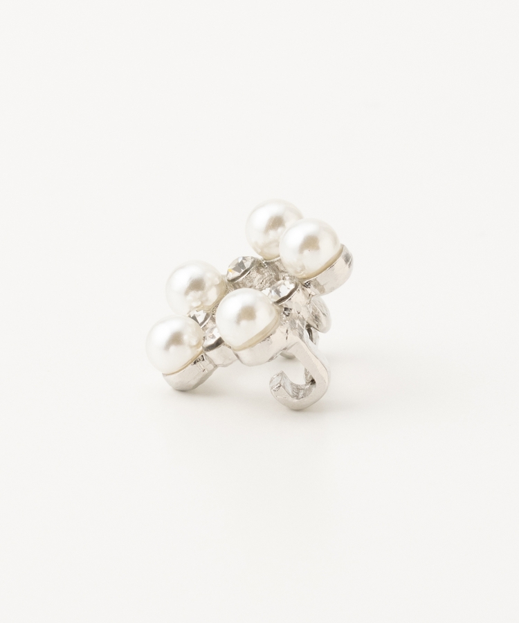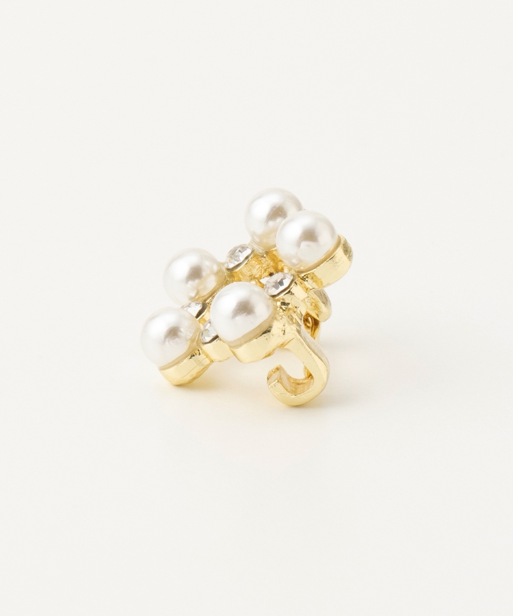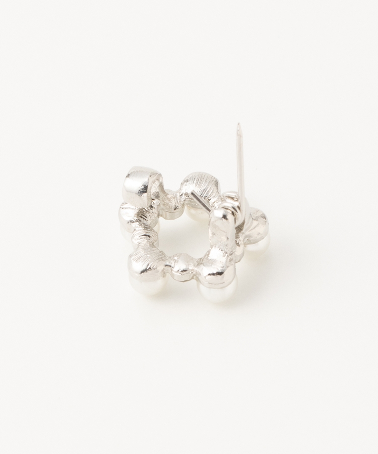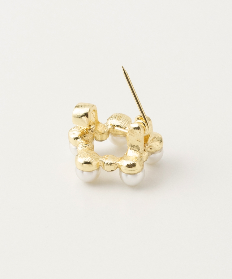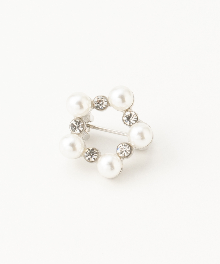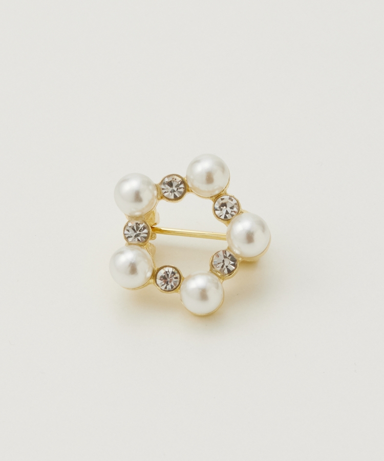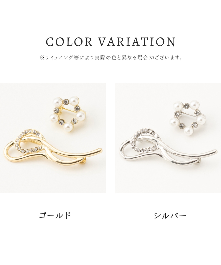 フェイクパールとビジューの丸型ブローチと、カーブラインにビジューを添えたブローチの2点セット。
