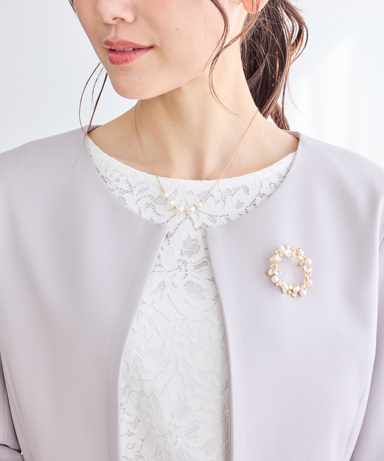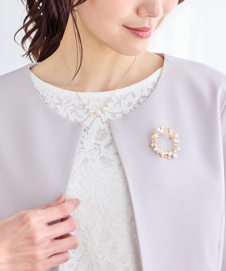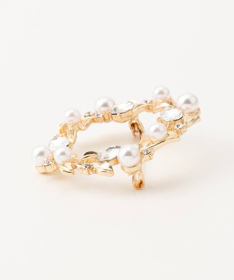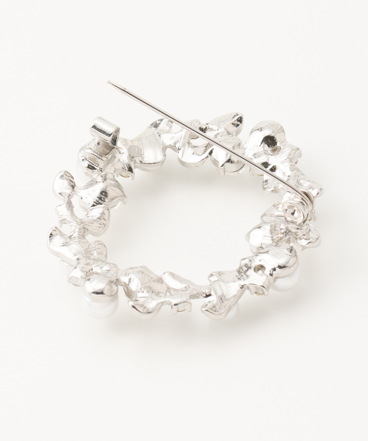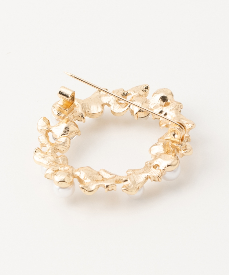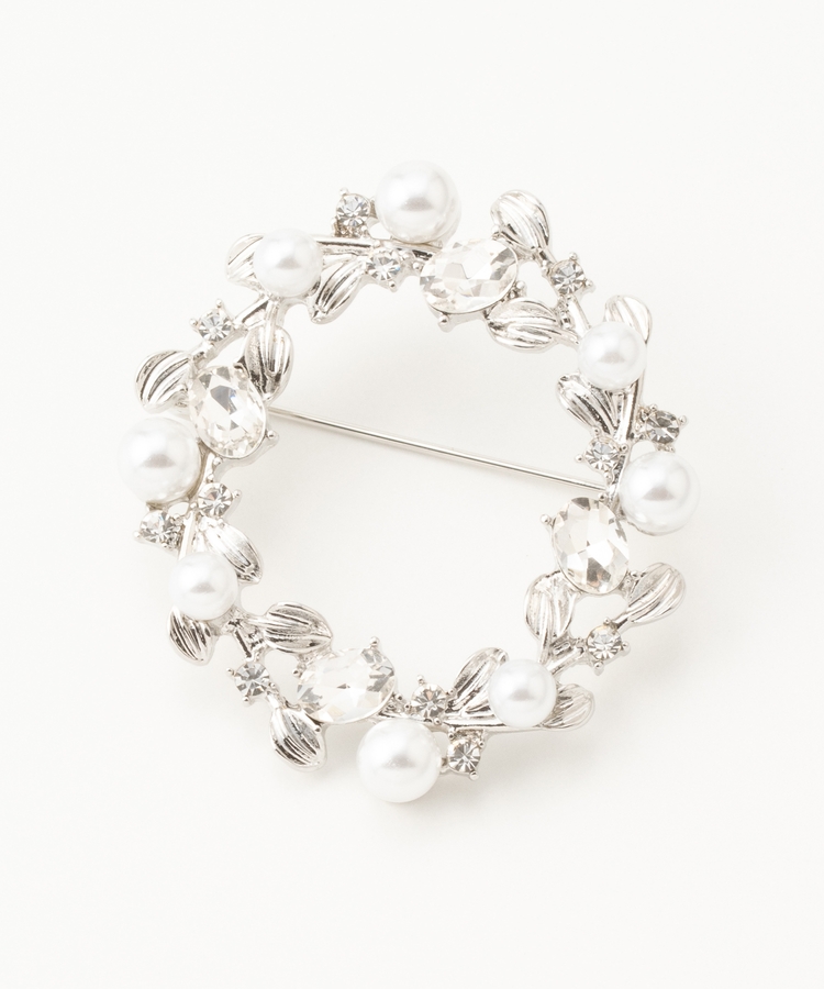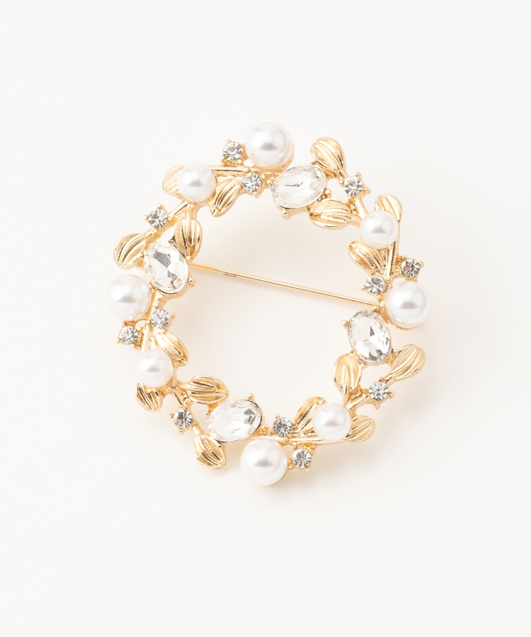 フェイクパールやビジューをあしらったリース風モチーフがエレガントなブローチ。