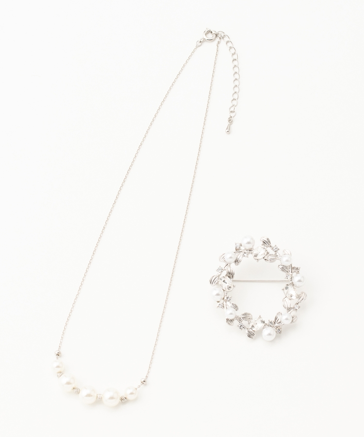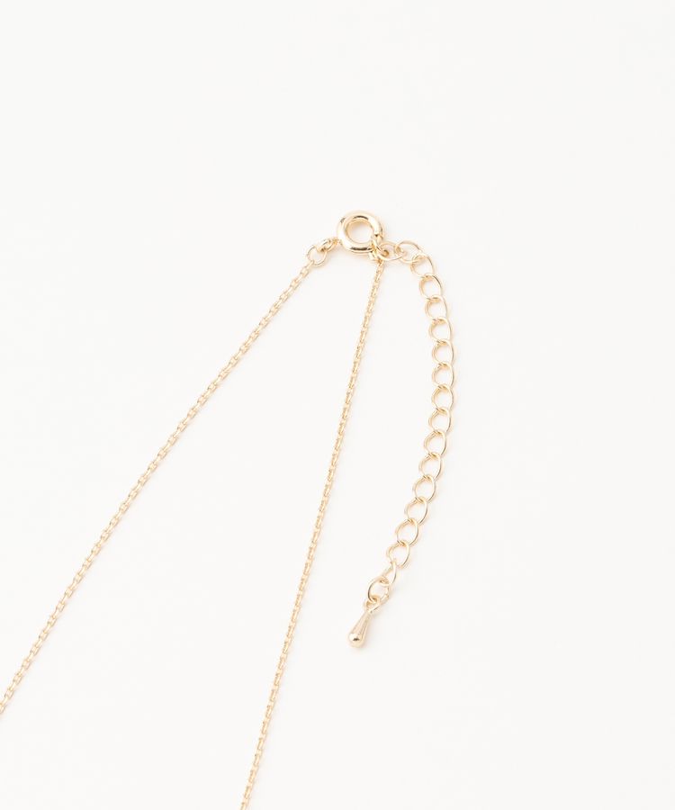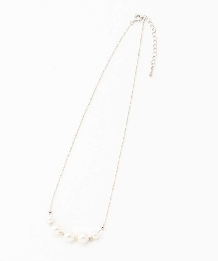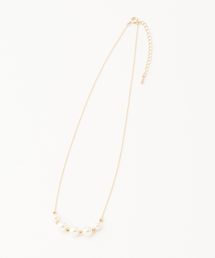 ネックレスは華奢なチェーンに大小のフェイクパールとメタルボールを添えた、上品なデザイン。