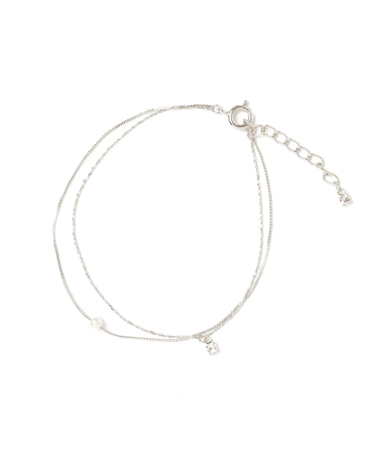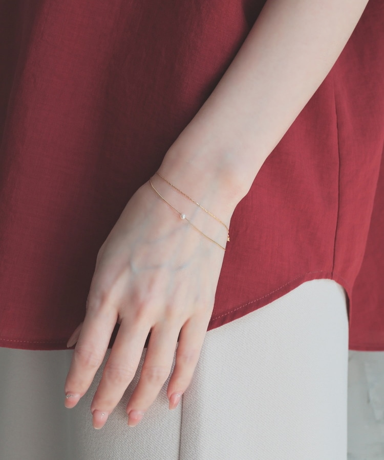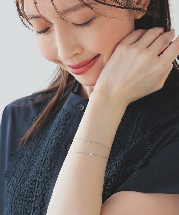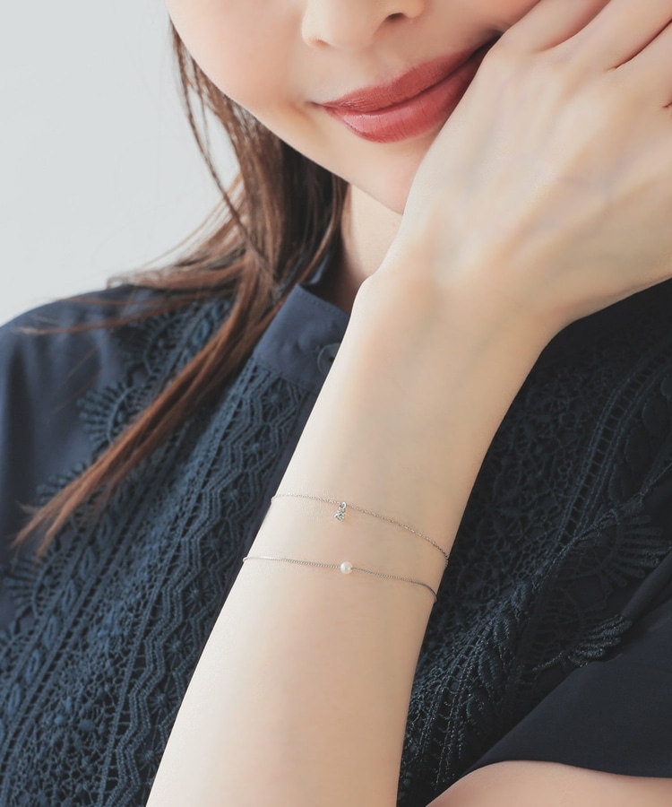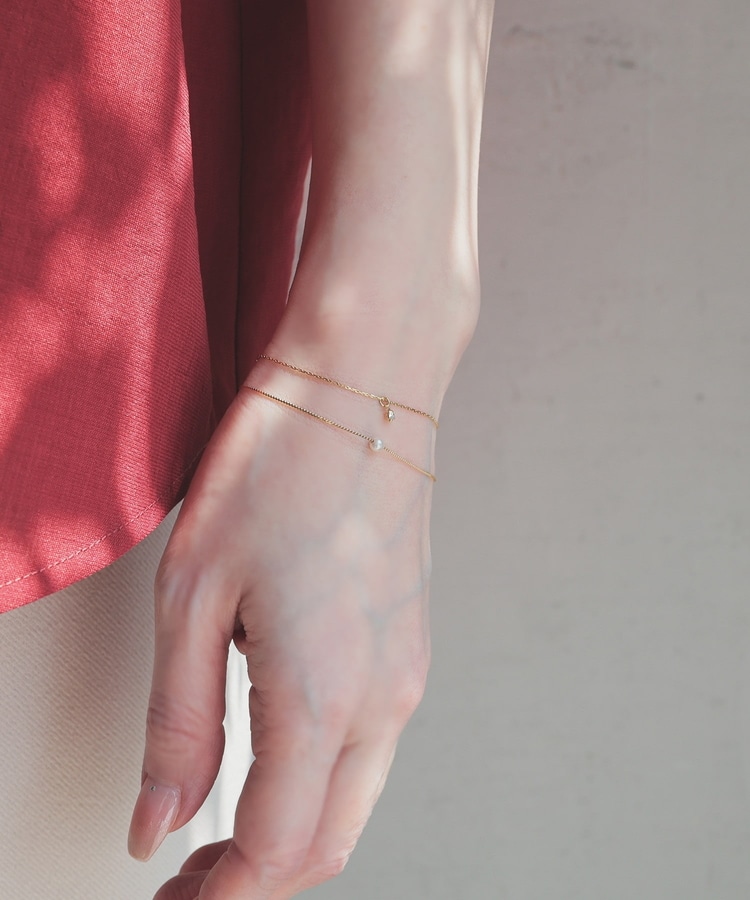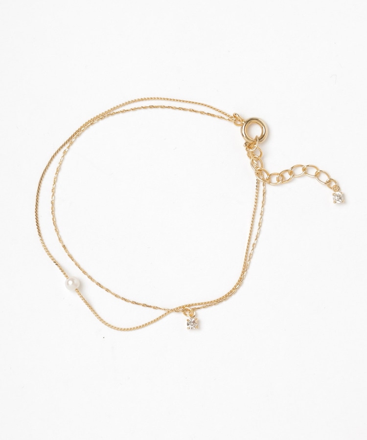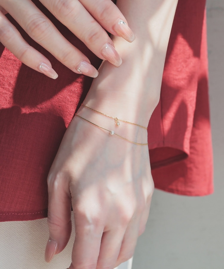2連の細めチェーンに1粒のビジューと1粒のパール風ビーズを添えた、手首の華奢見せを叶える上品なデザイン。