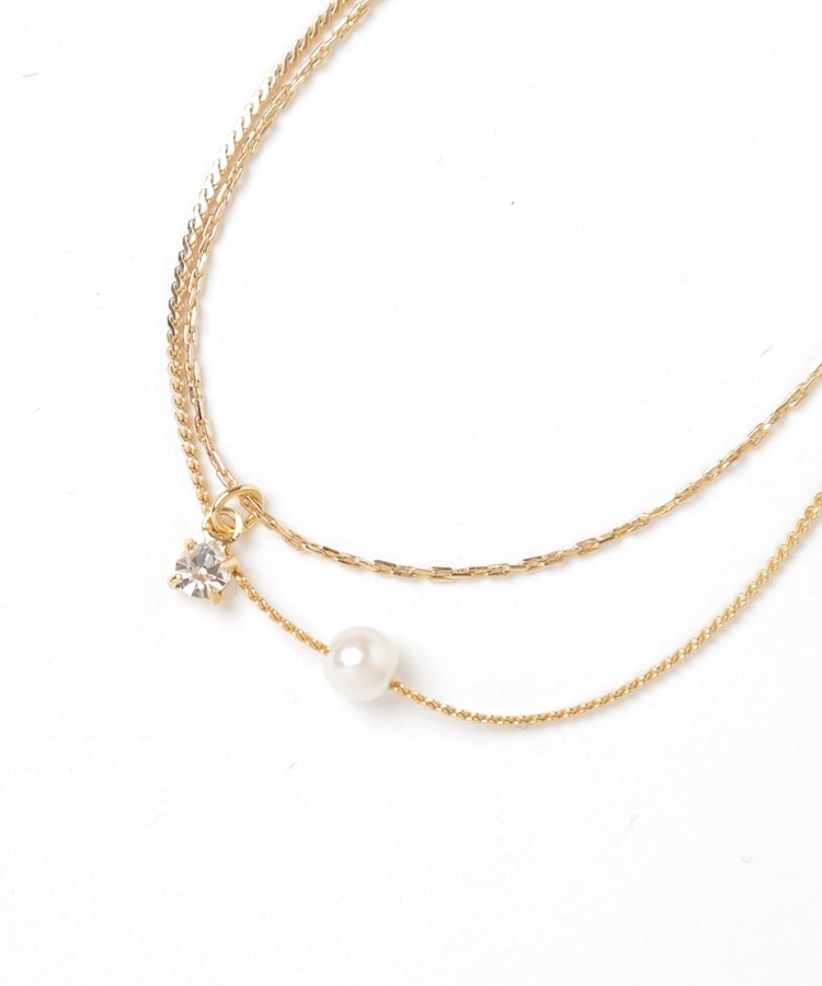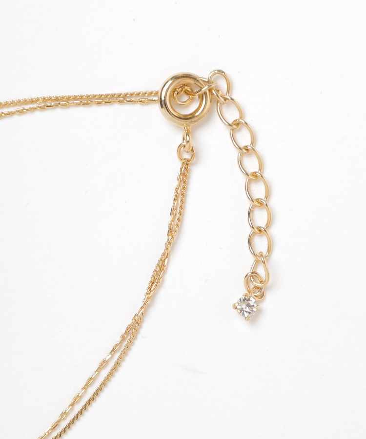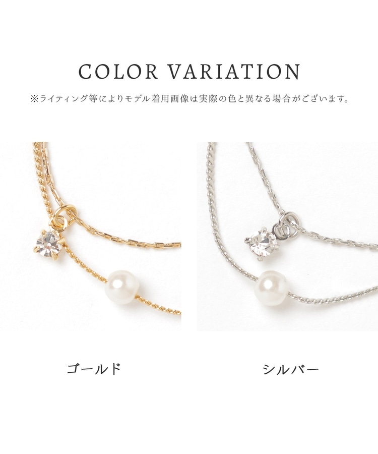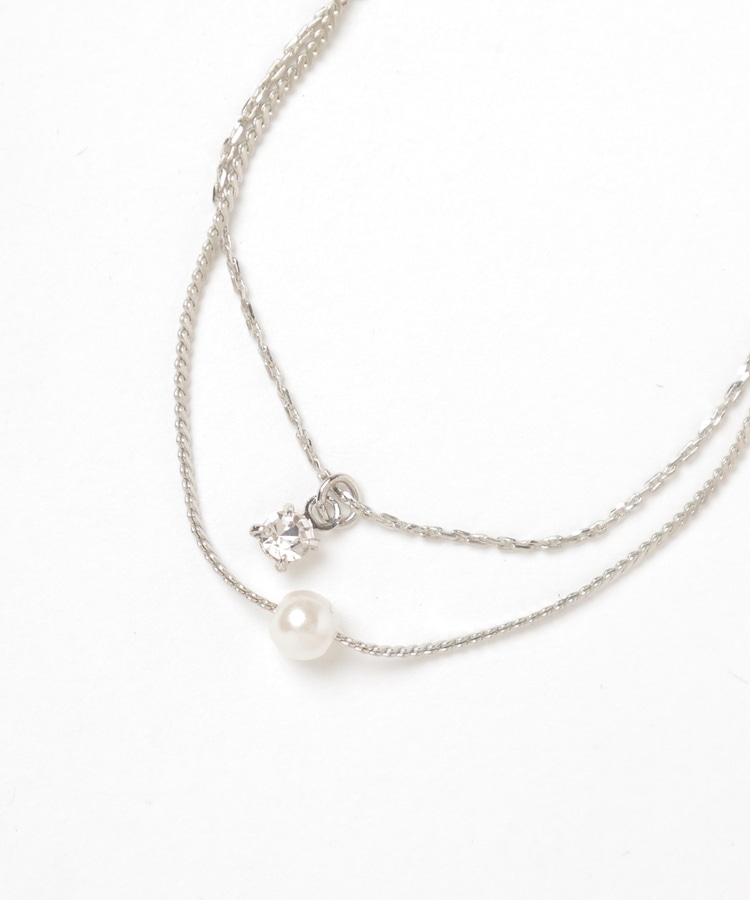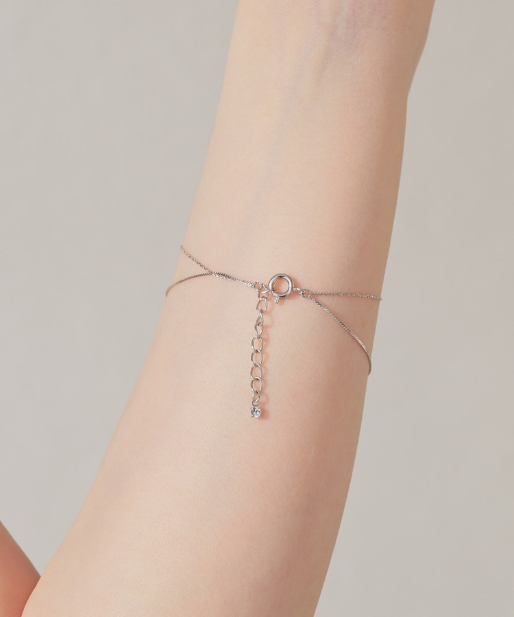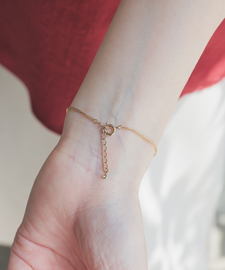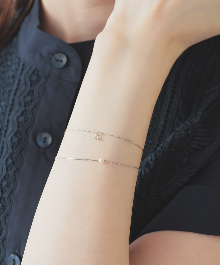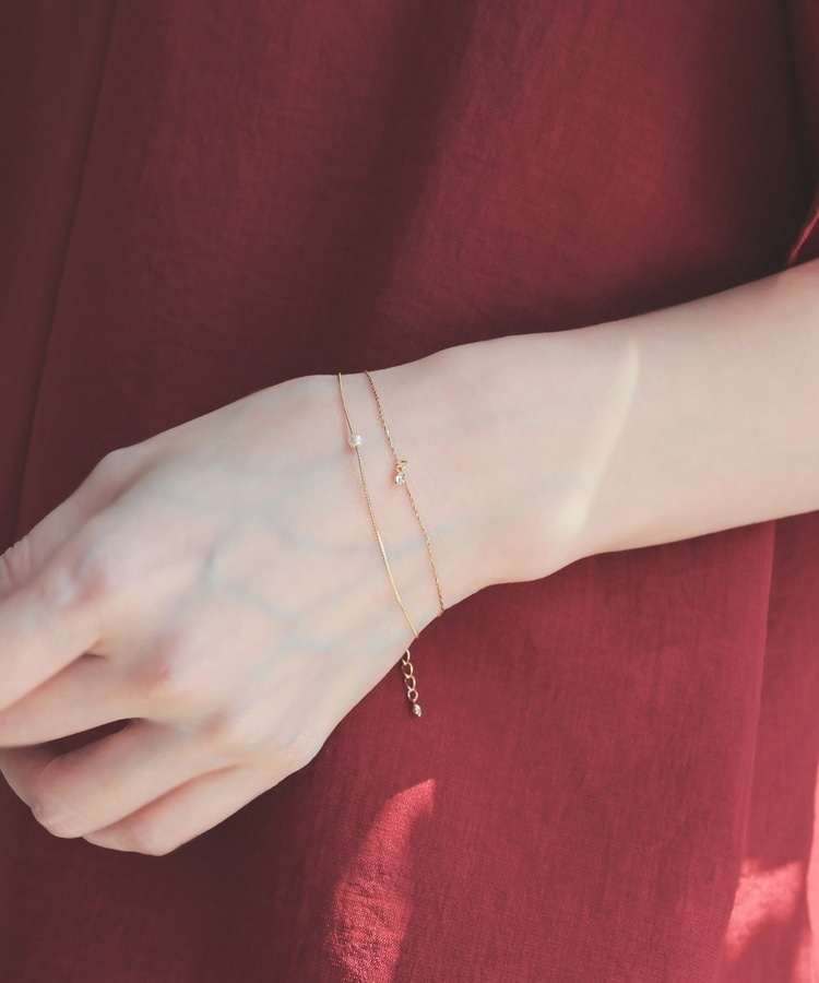 2連の細めチェーンに1粒のビジューと1粒のパール風ビーズを添えた、手首の華奢見せを叶える上品なデザイン。