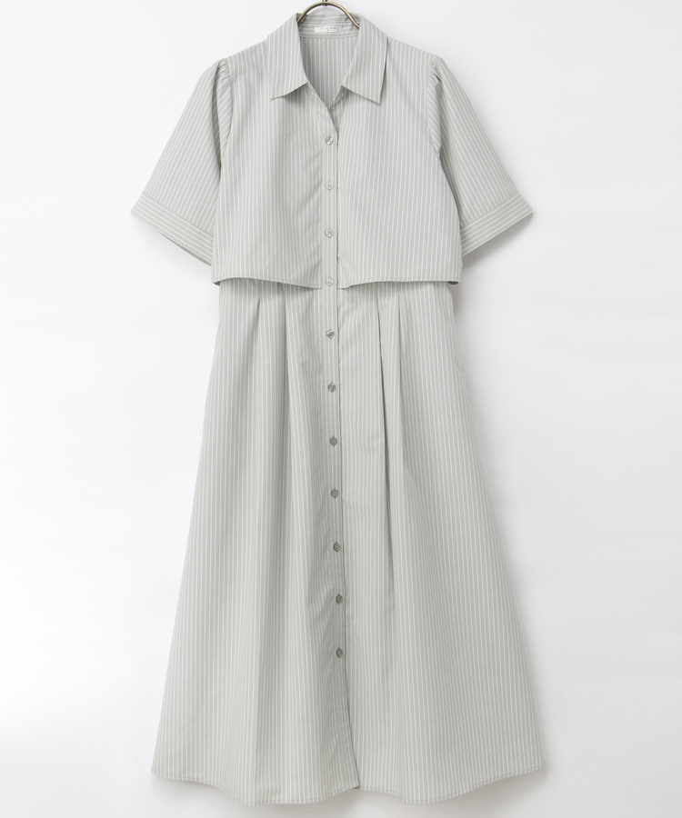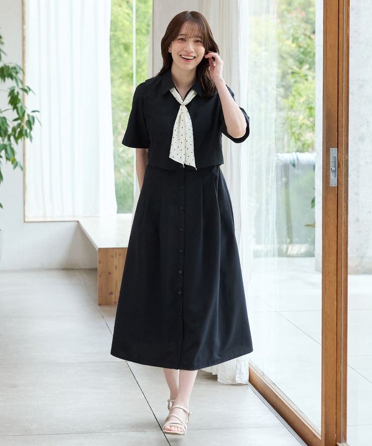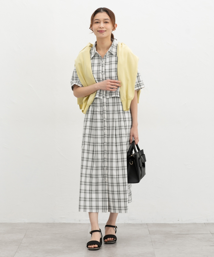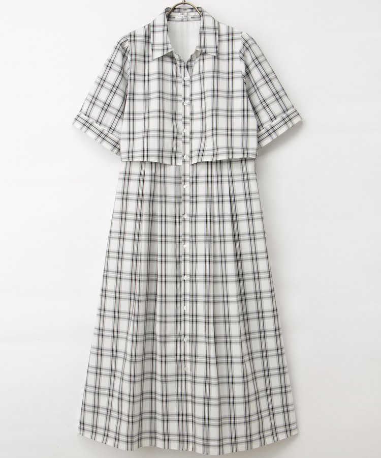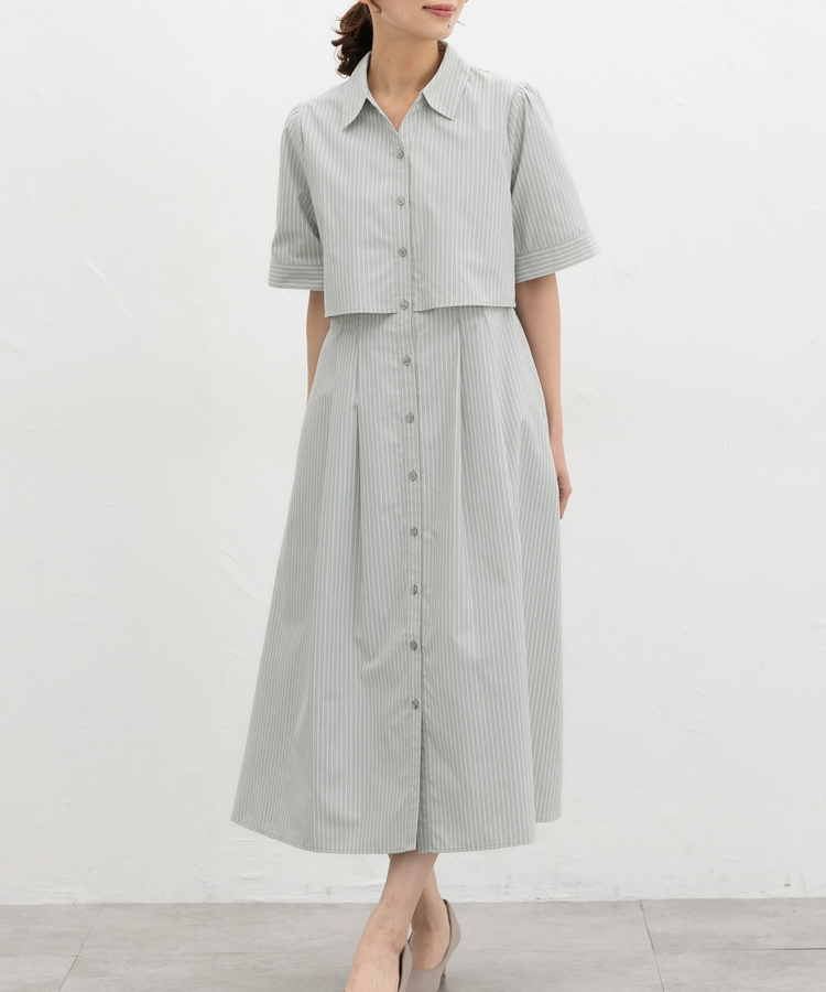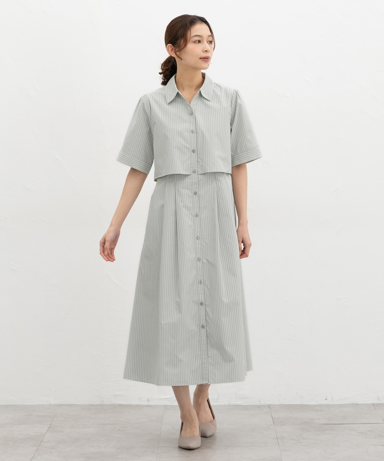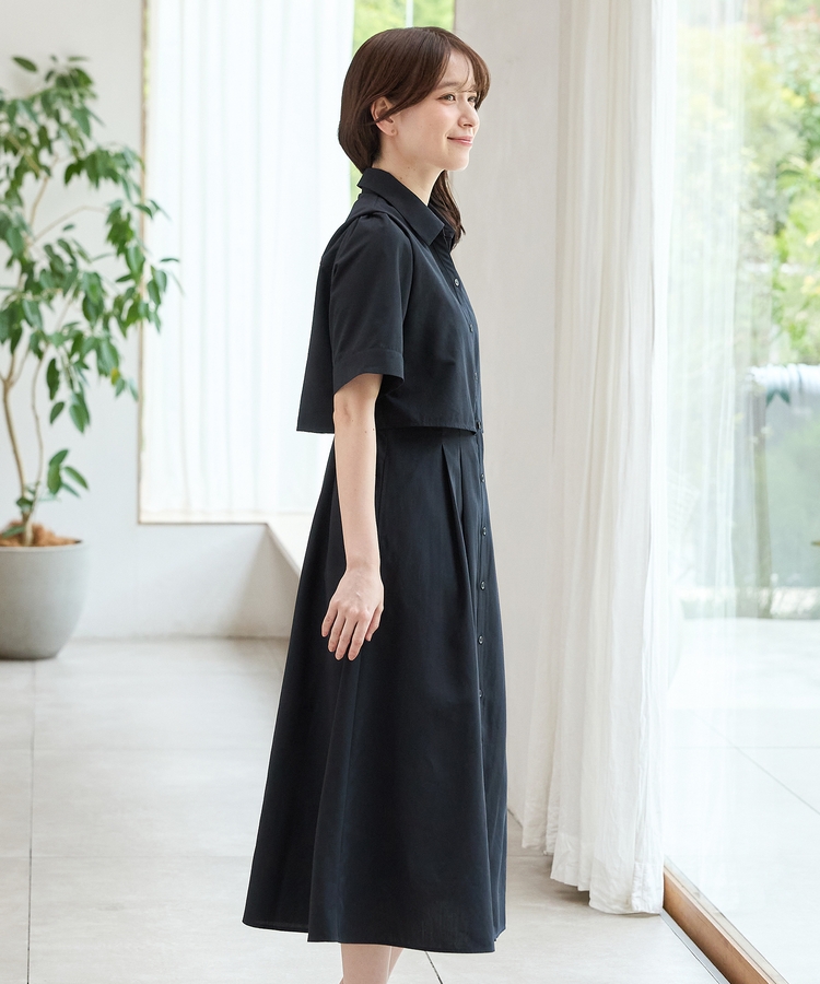 クロップドシャツとロングスカートをレイヤードしたような着こなしが1枚で楽しめ、時短も叶う上品デザイン。