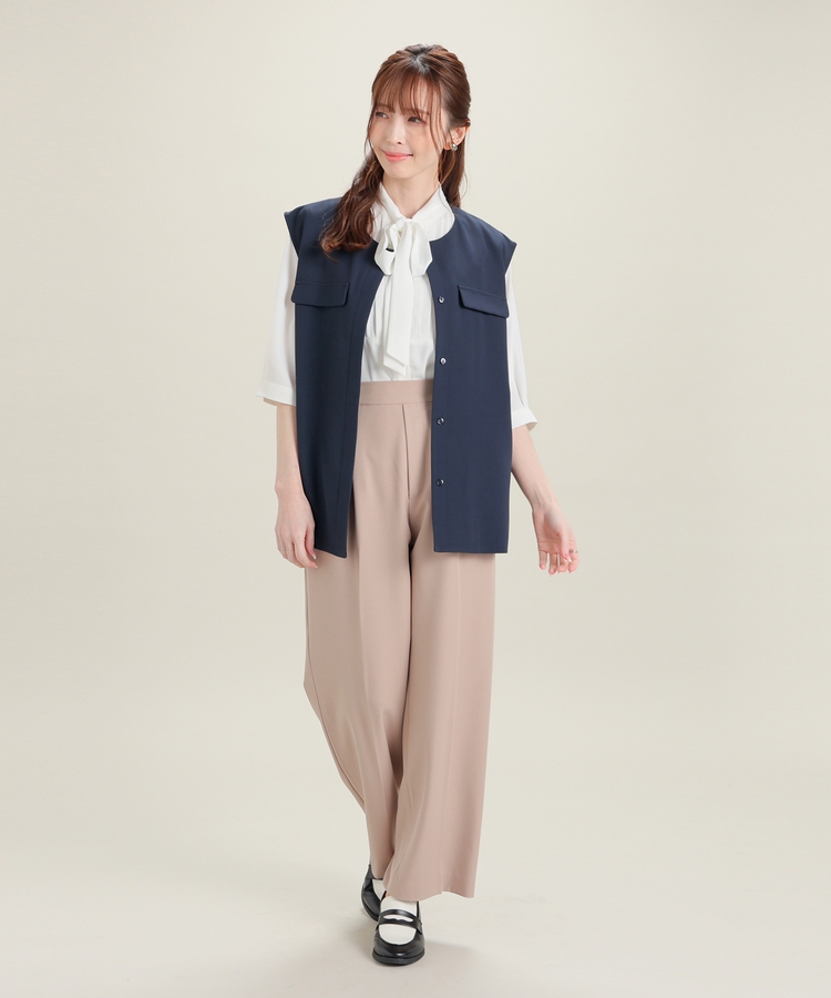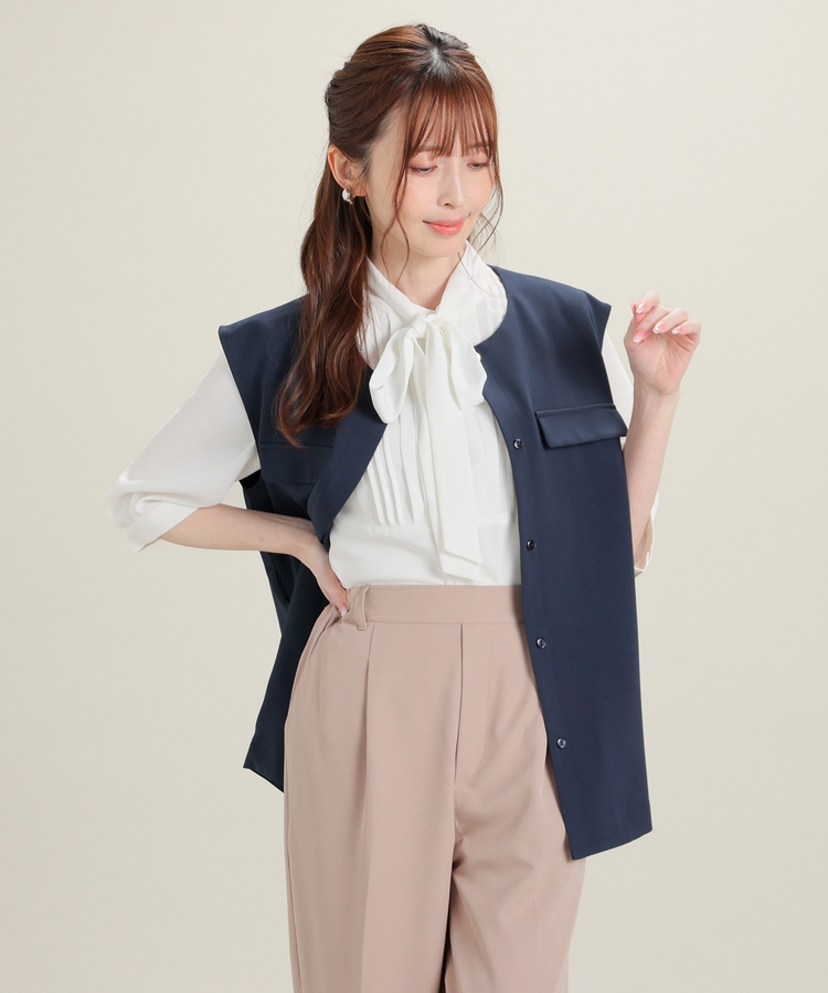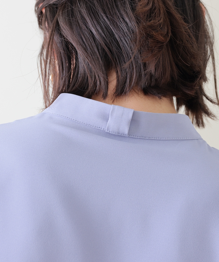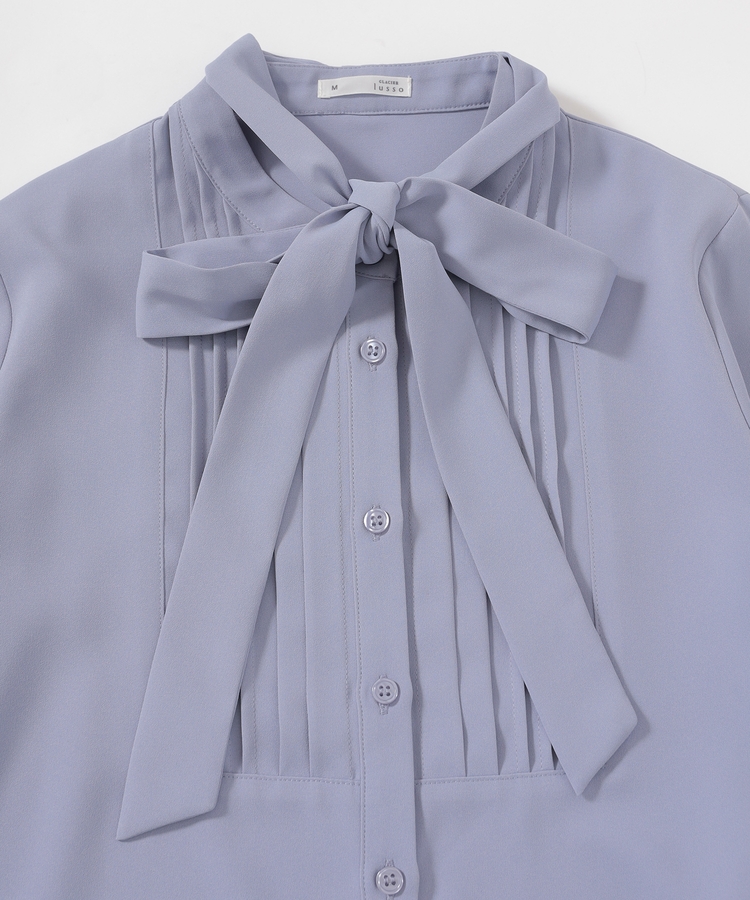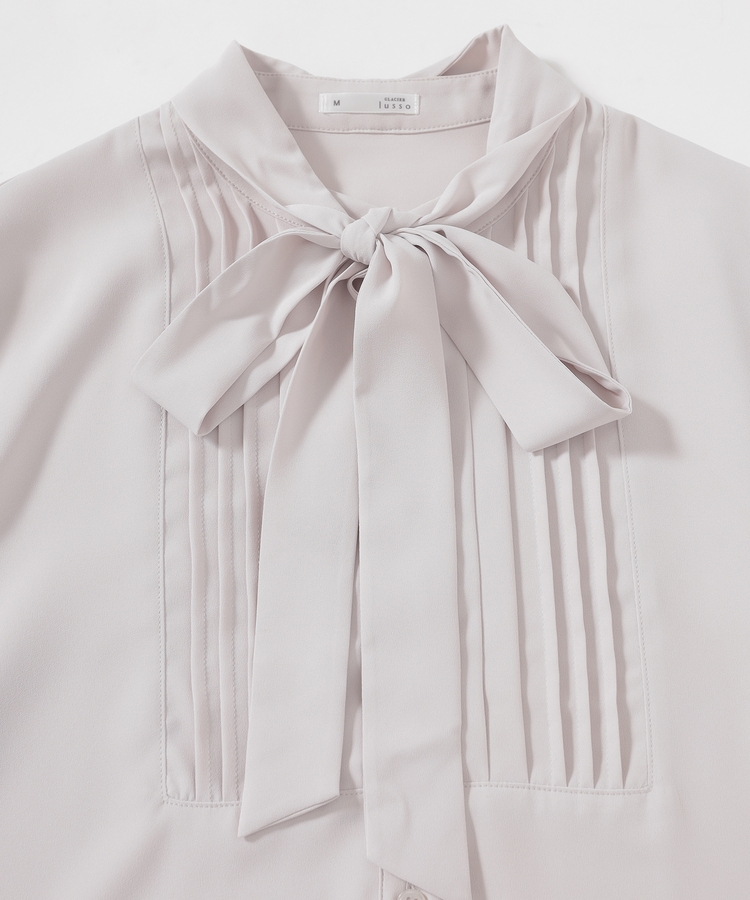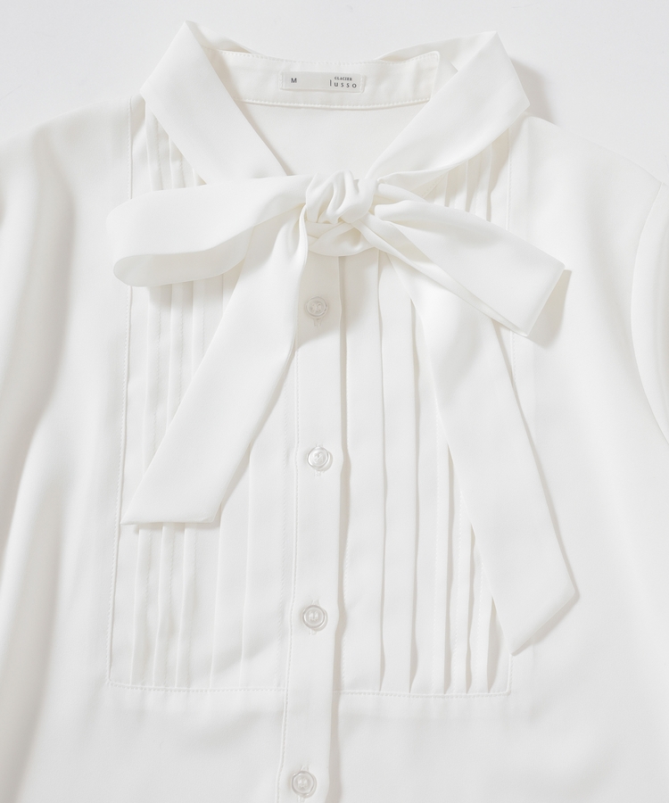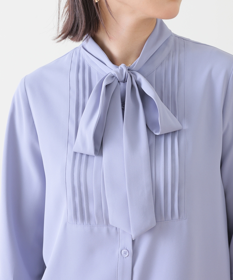優しい印象のバンドカラーに、上品なピンタックと取り外し可能なボウタイリボンをプラスした大人可愛いデザイン。