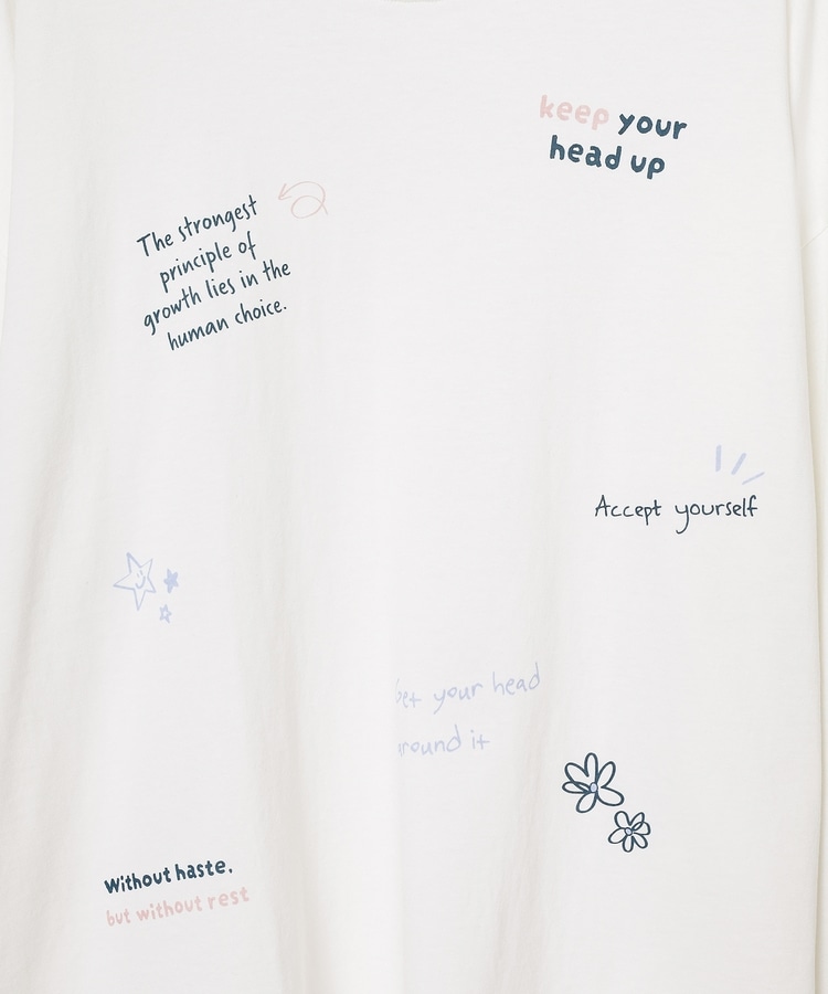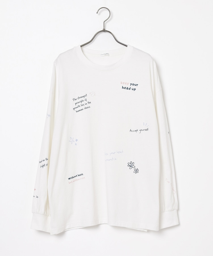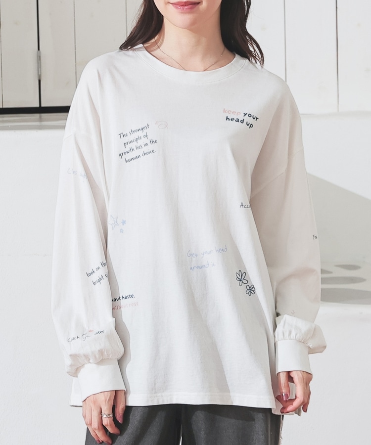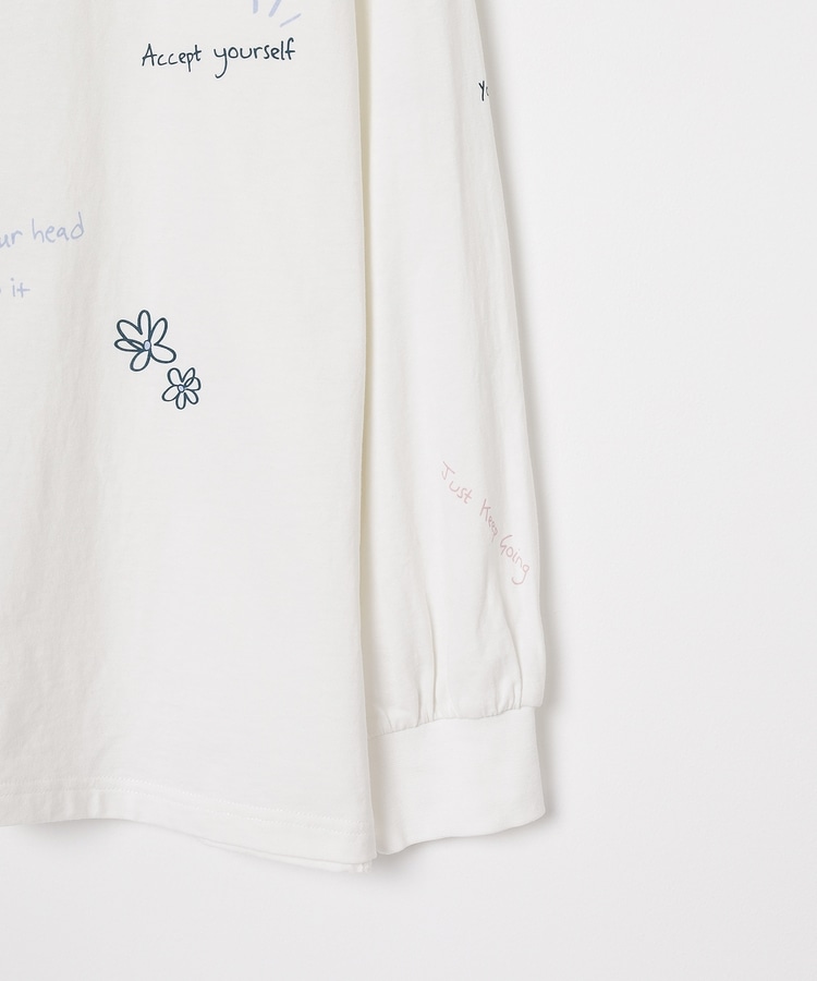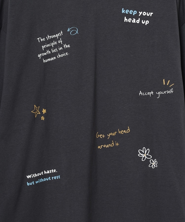 フロント&袖にちりばめた落書き風のメッセージやモチーフのプリントがPOPなデザイン。