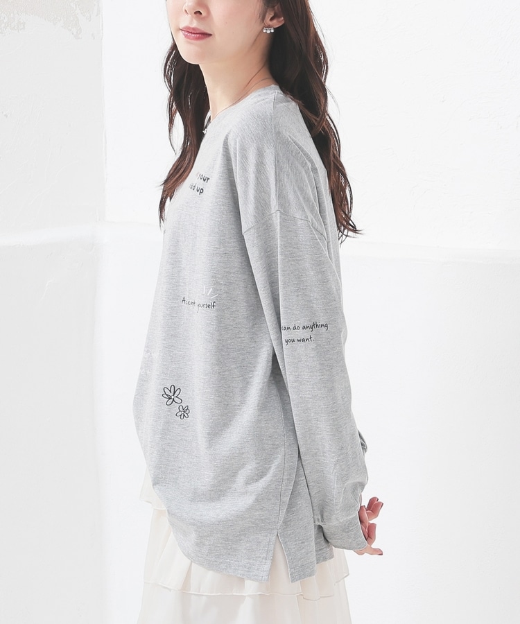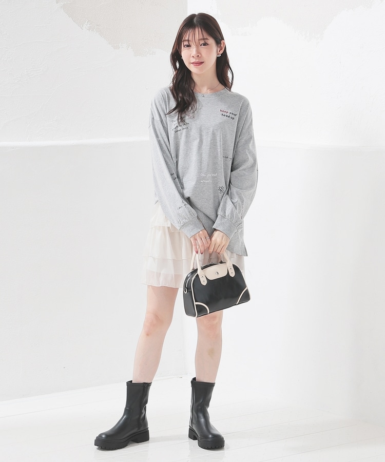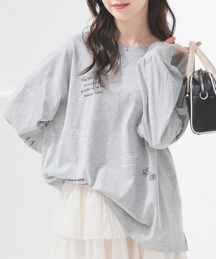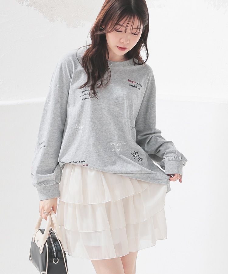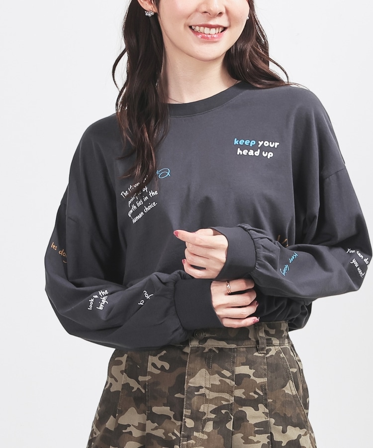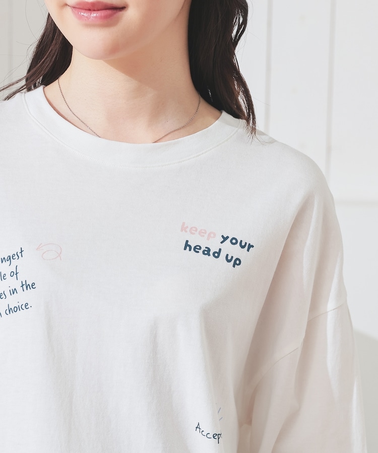 フロント&袖にちりばめた落書き風のメッセージやモチーフのプリントがPOPなデザイン。