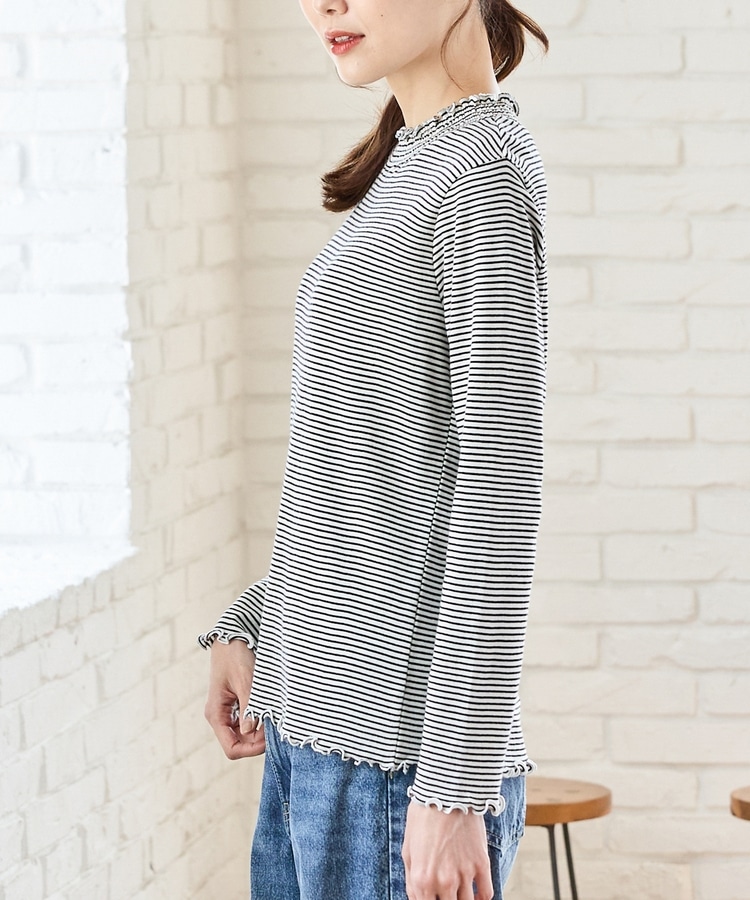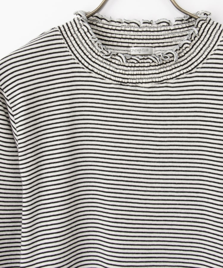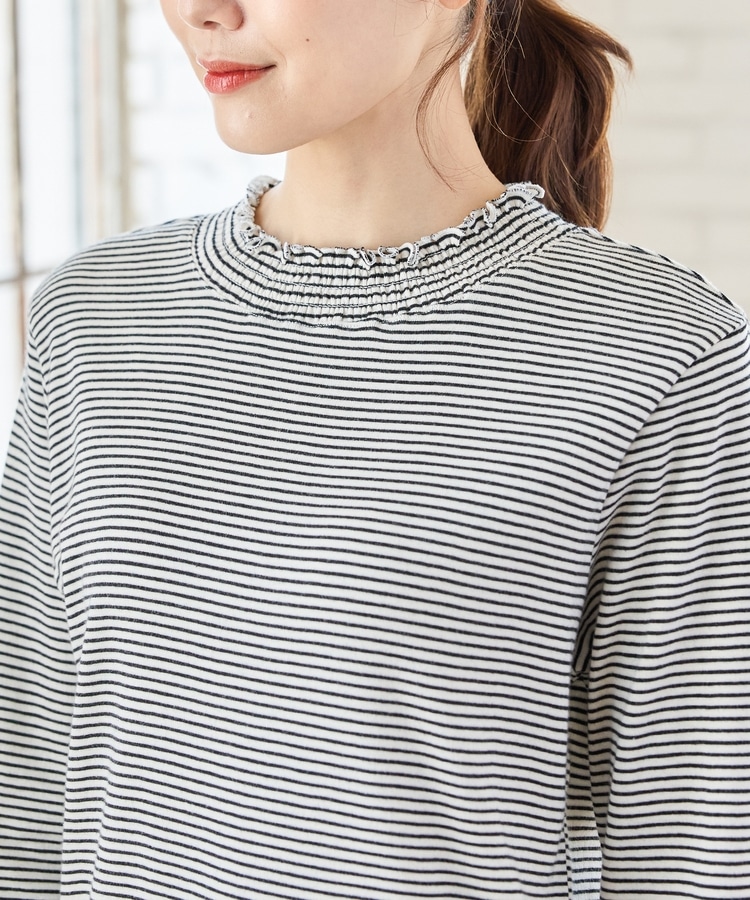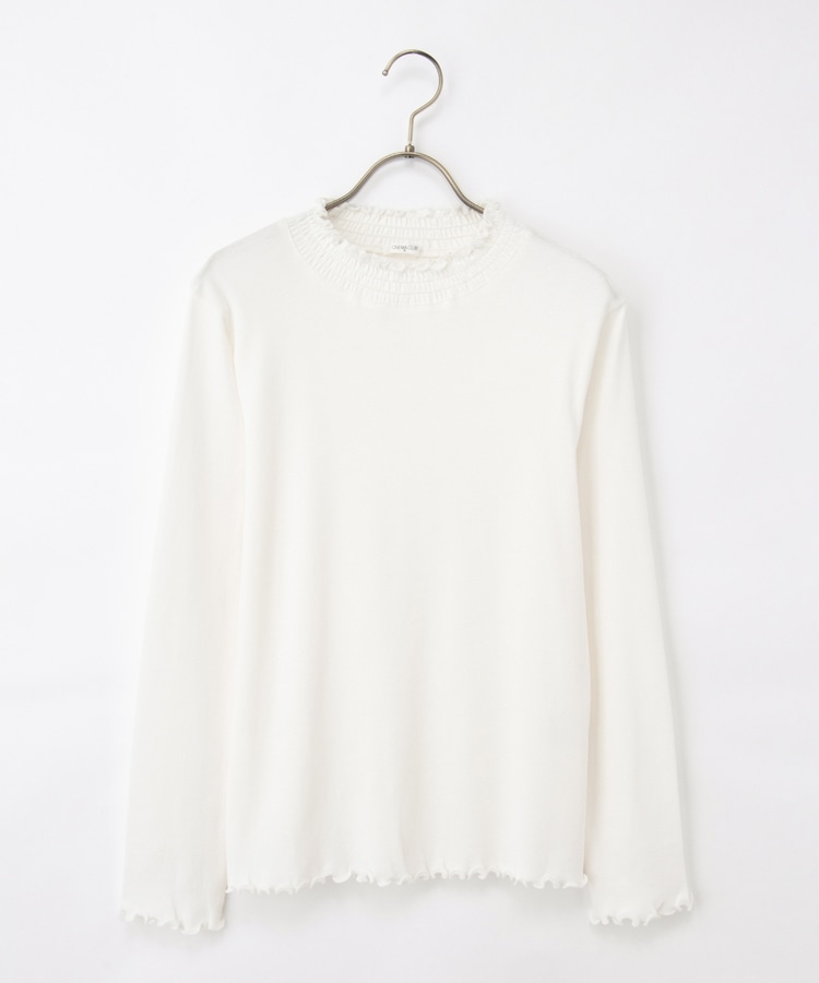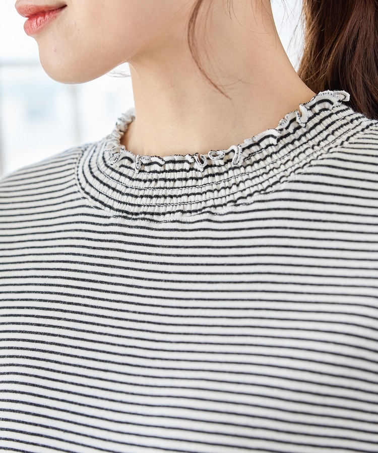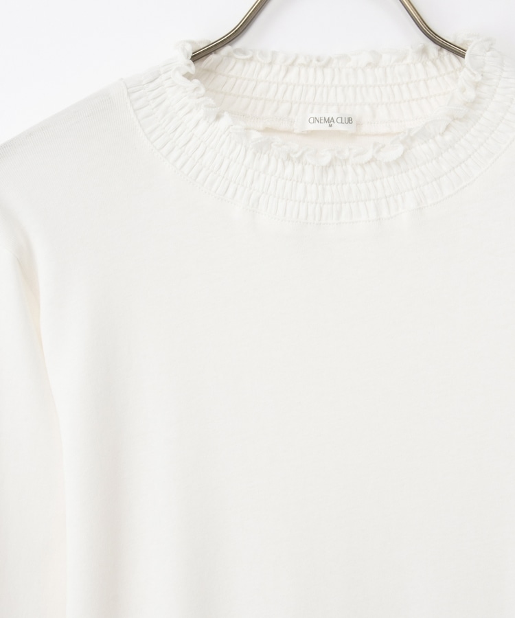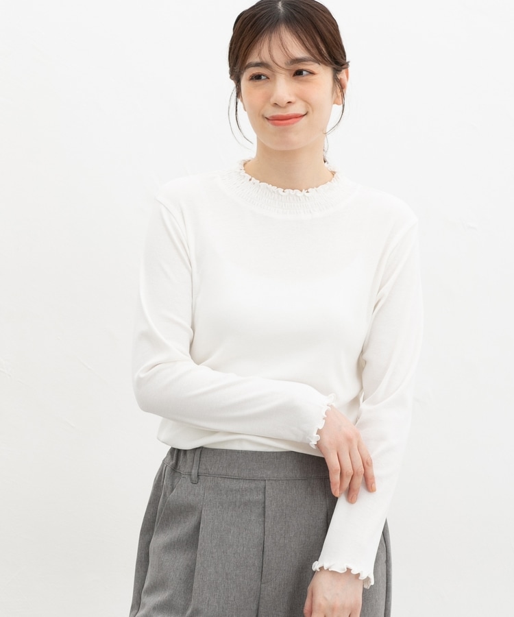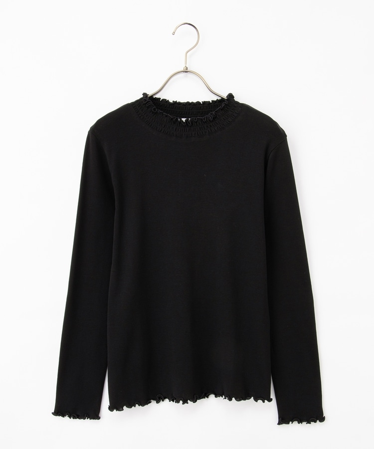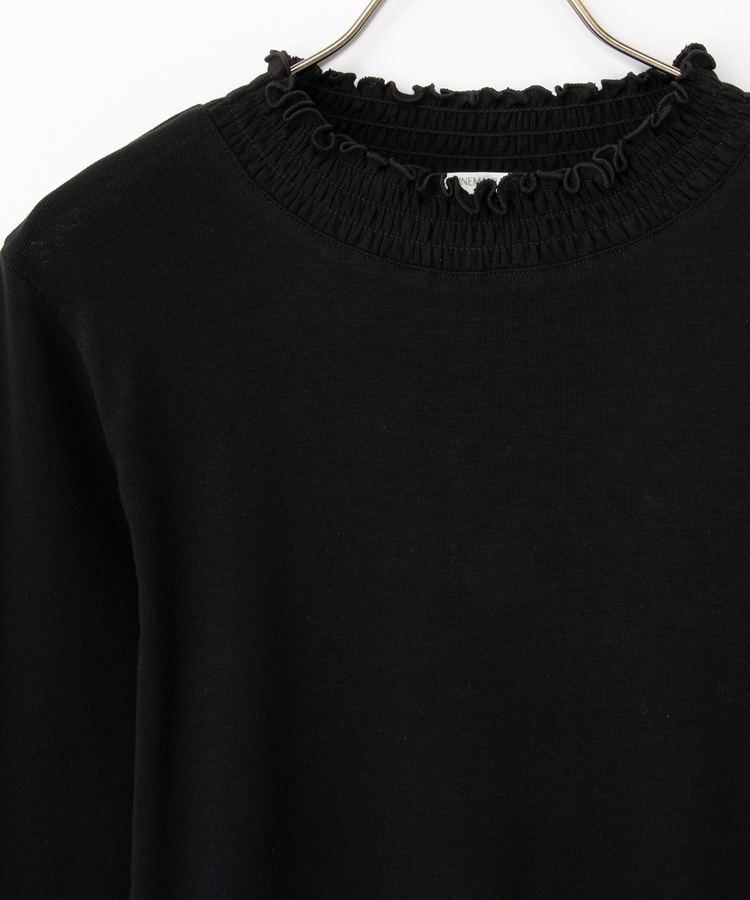 首元を程よく隠すハイネックにシャーリングでアクセントをプラスしたデザイン。