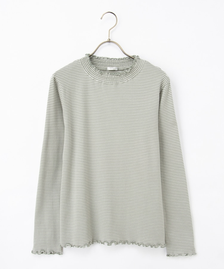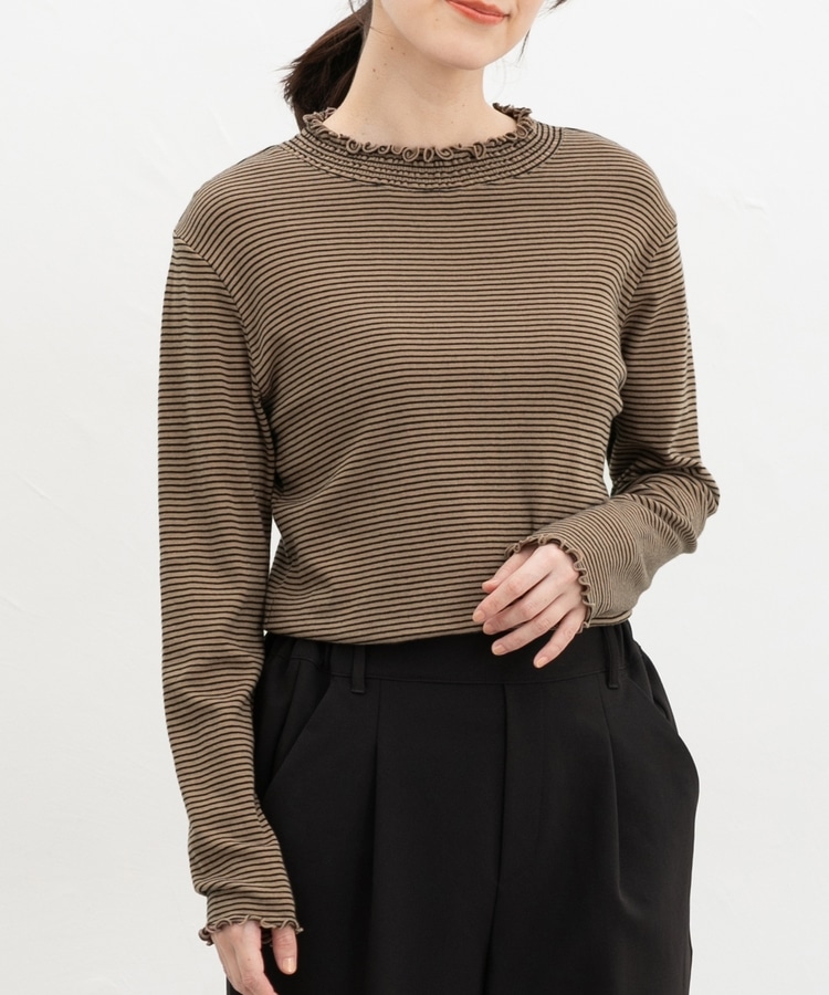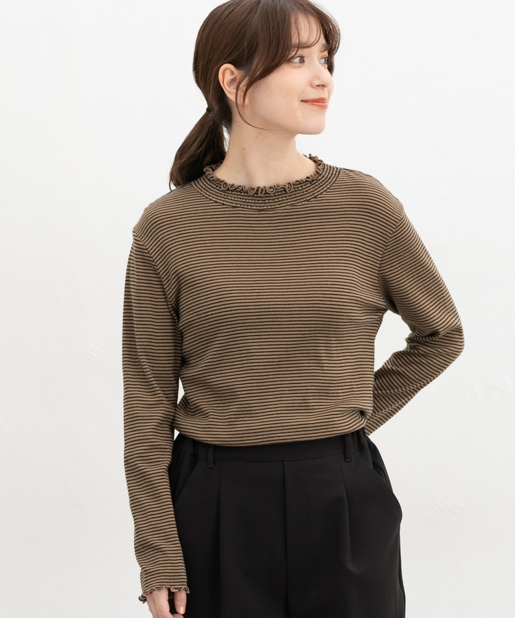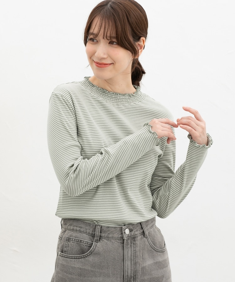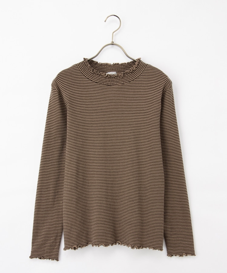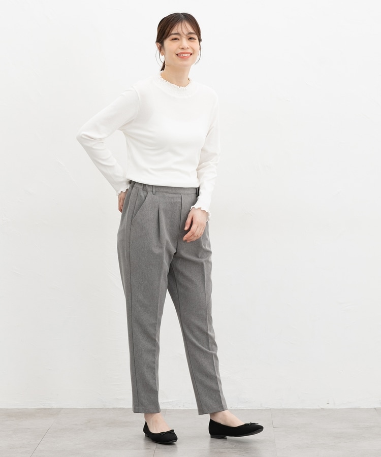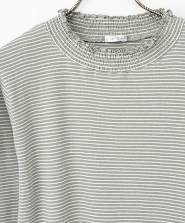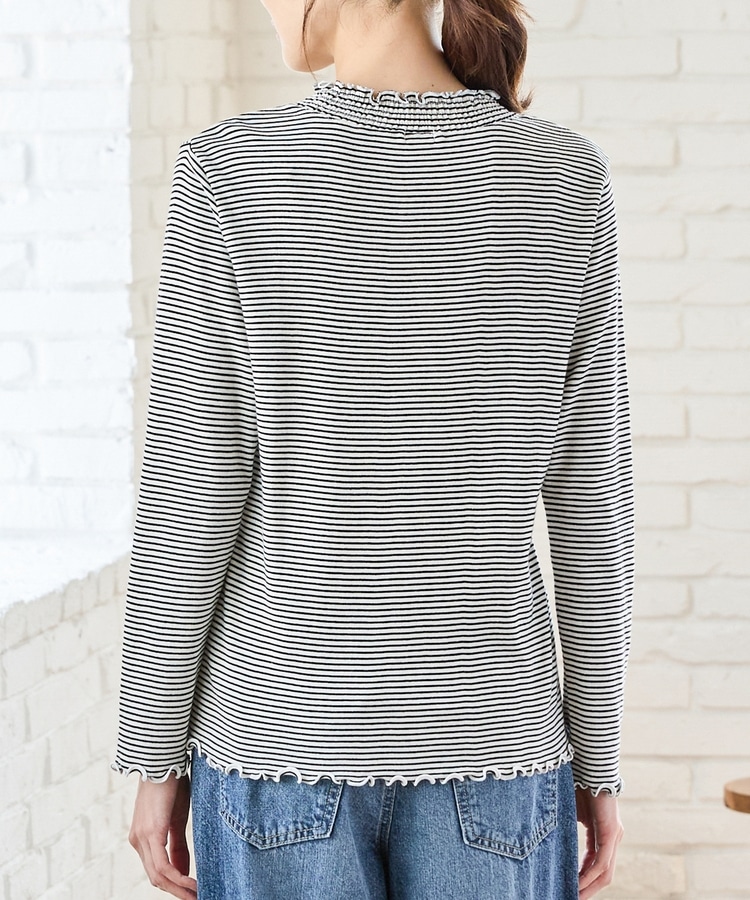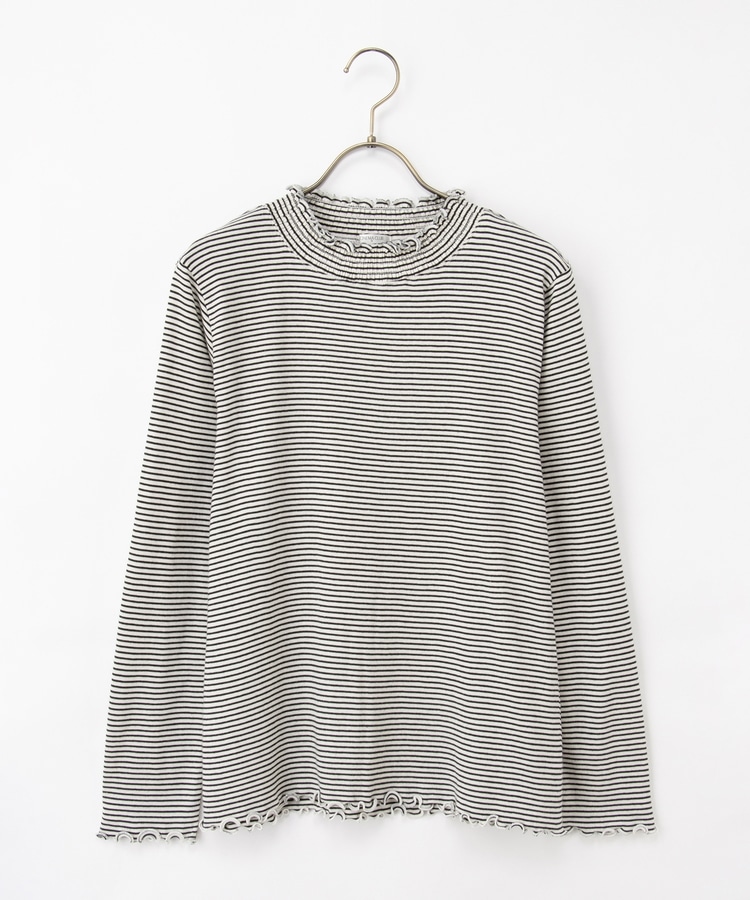 首元を程よく隠すハイネックにシャーリングでアクセントをプラスしたデザイン。