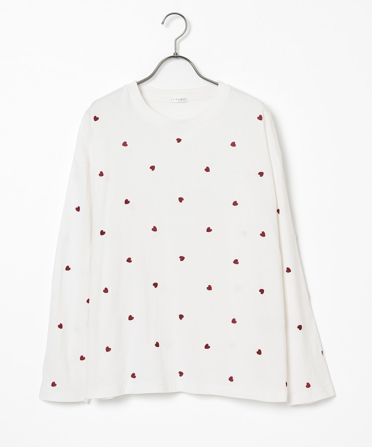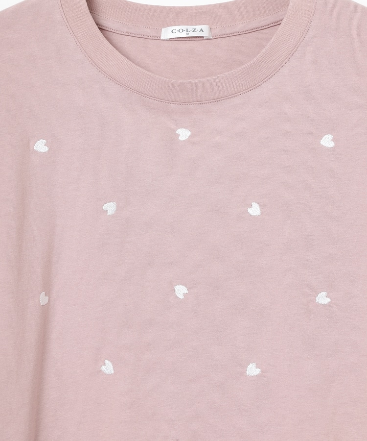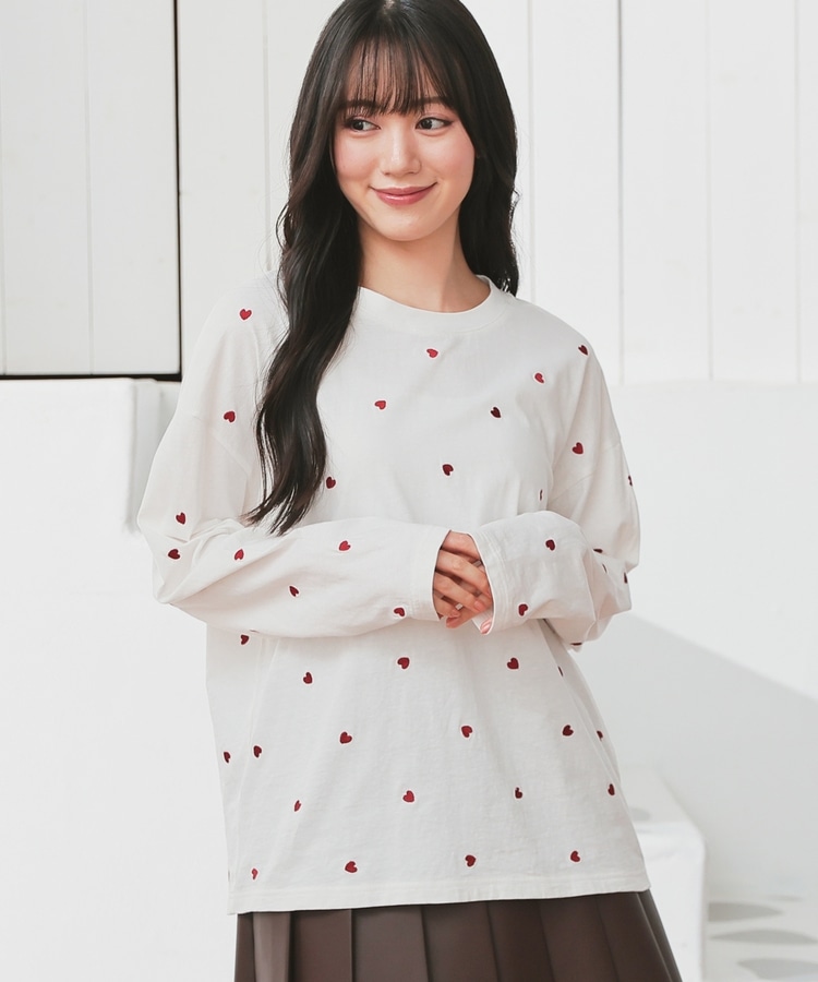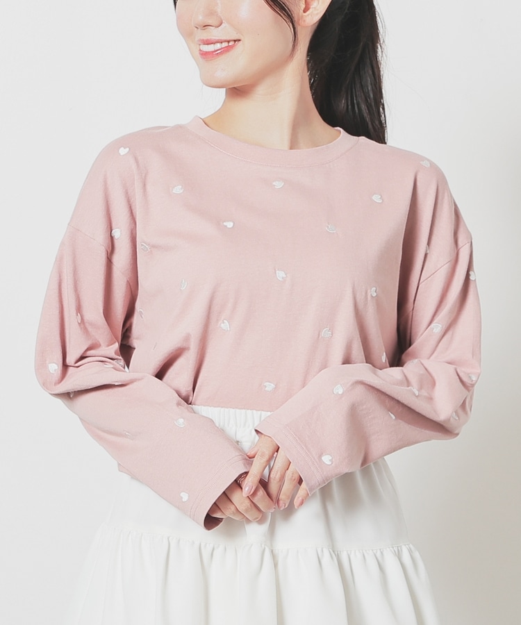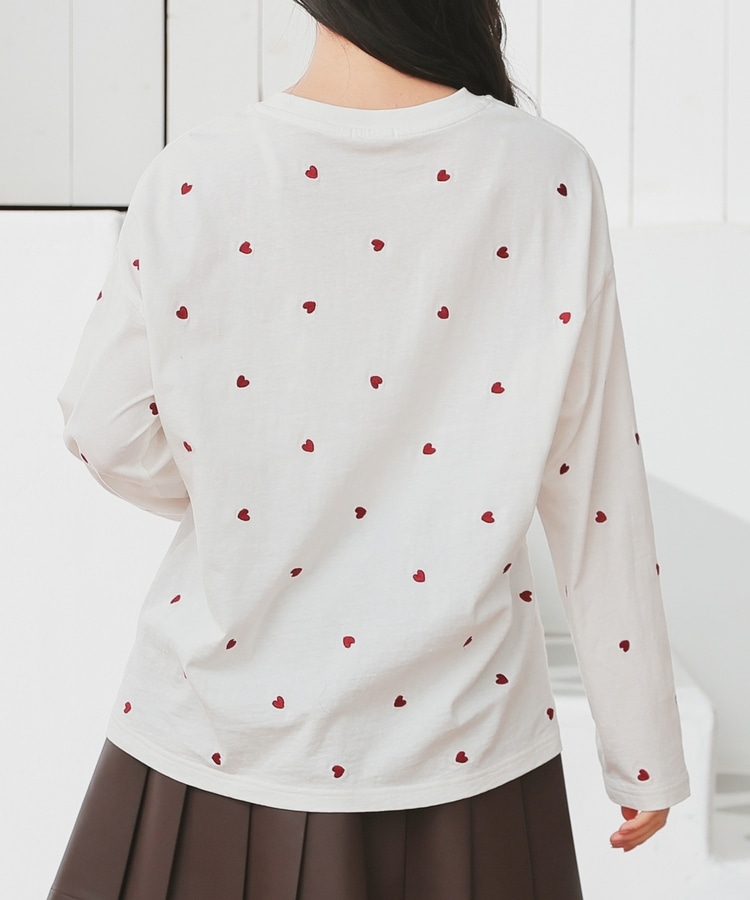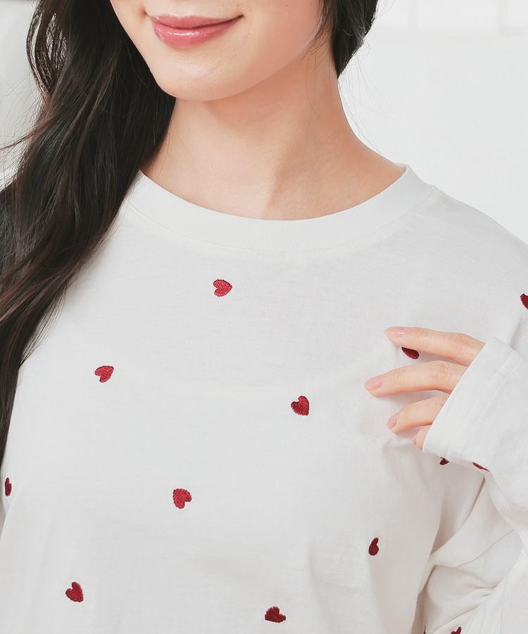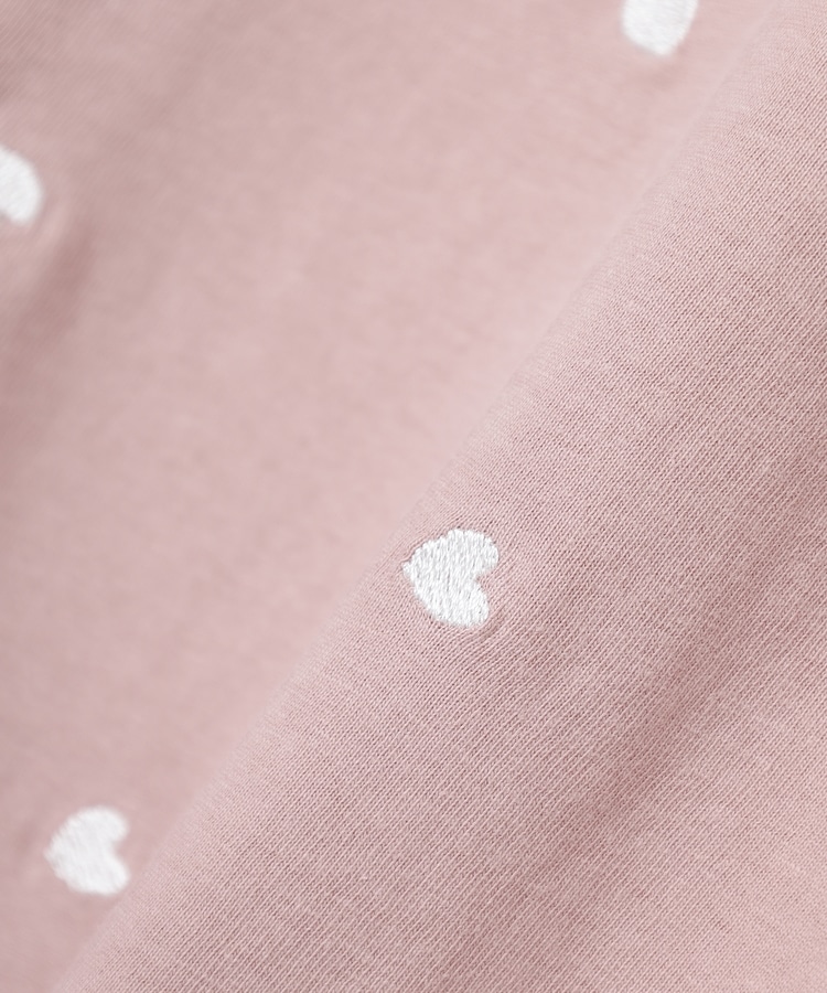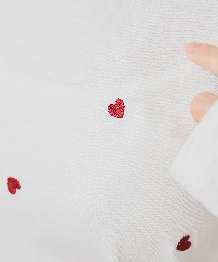 全体にちりばめれたハートとリボンモチーフの刺繍がキュートなデザイン。