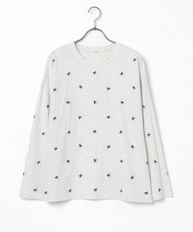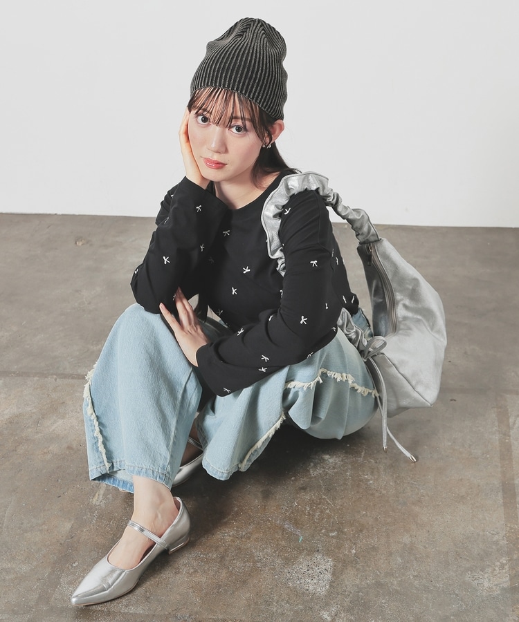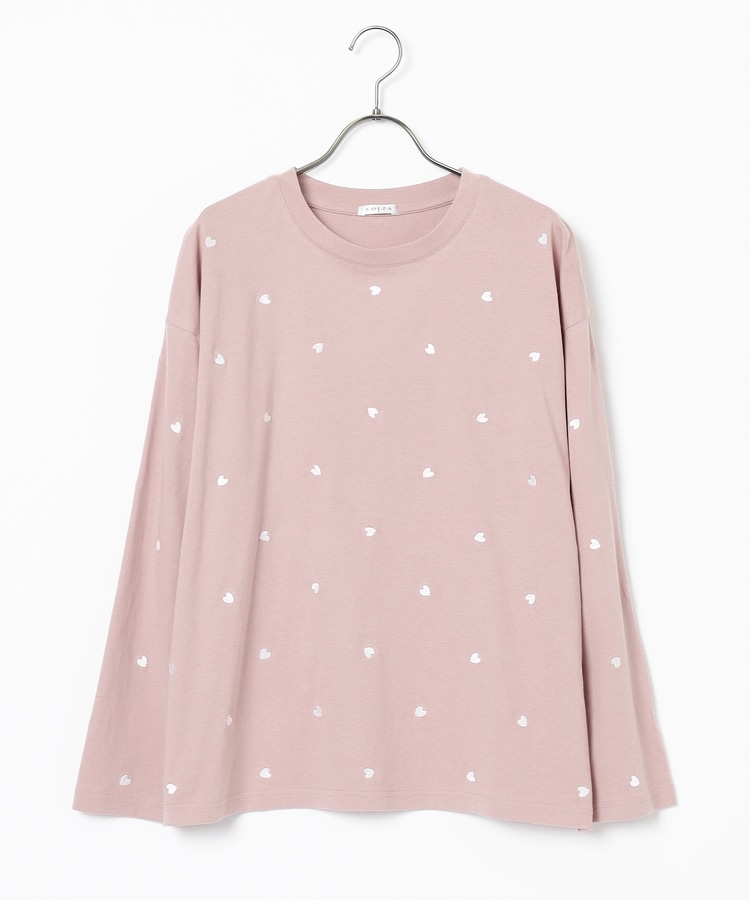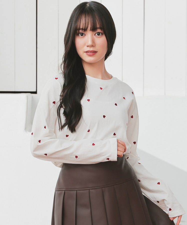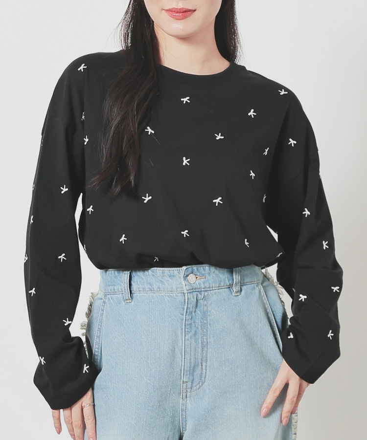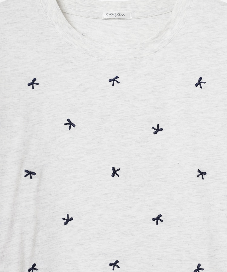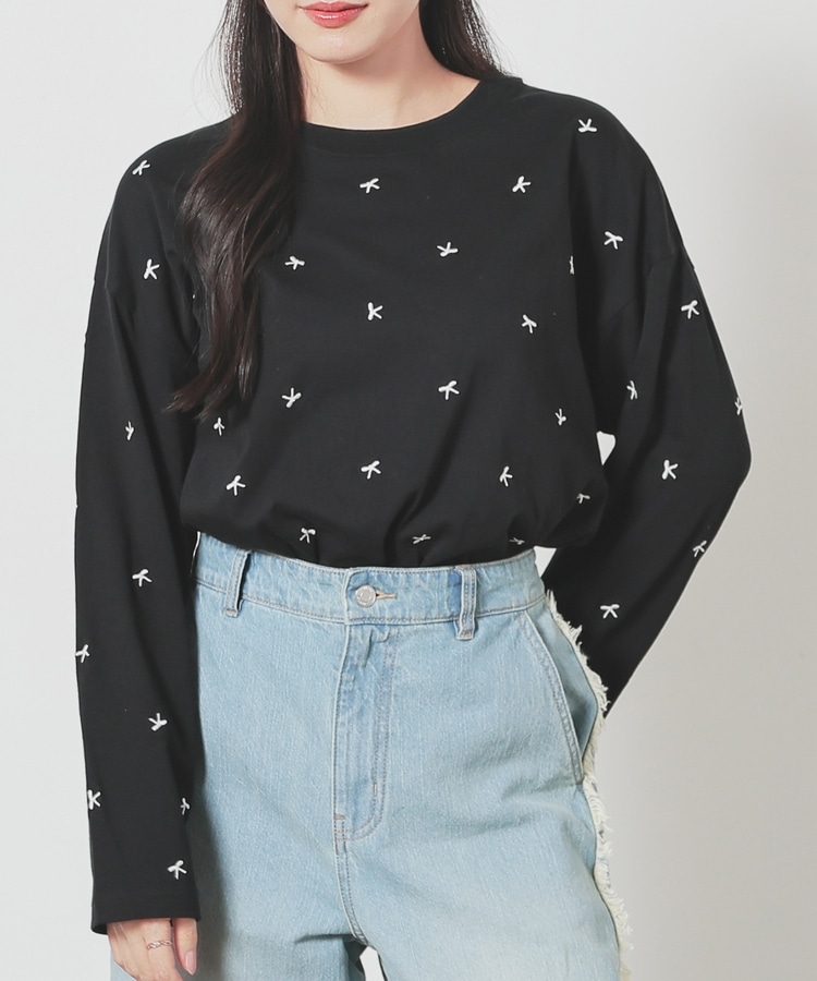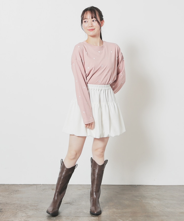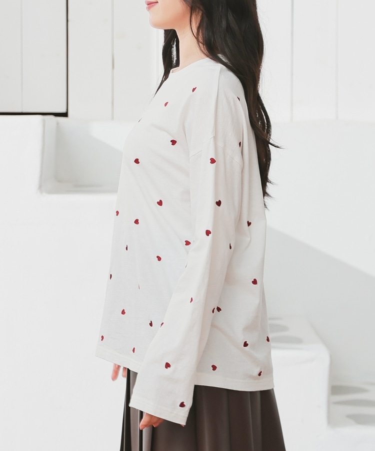 全体にちりばめれたハートとリボンモチーフの刺繍がキュートなデザイン。