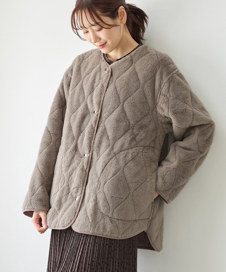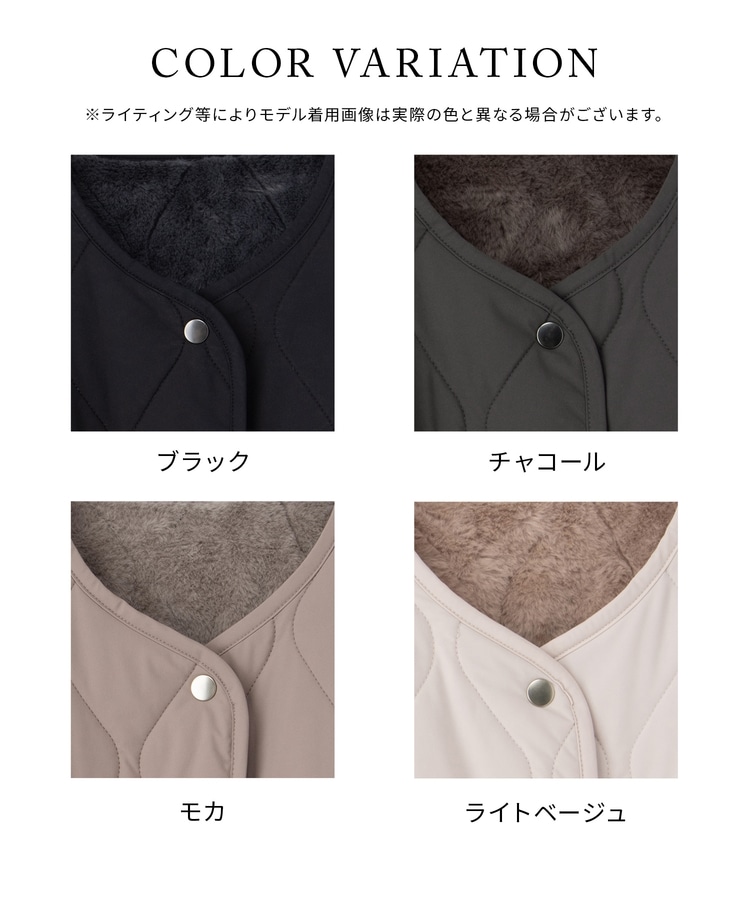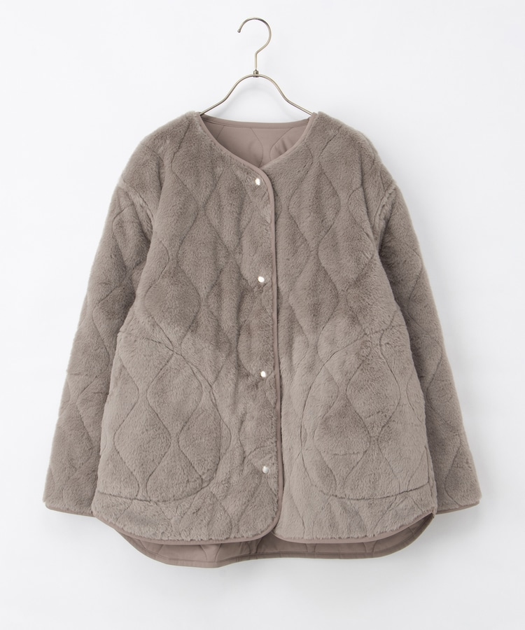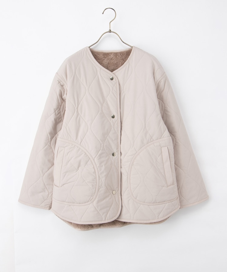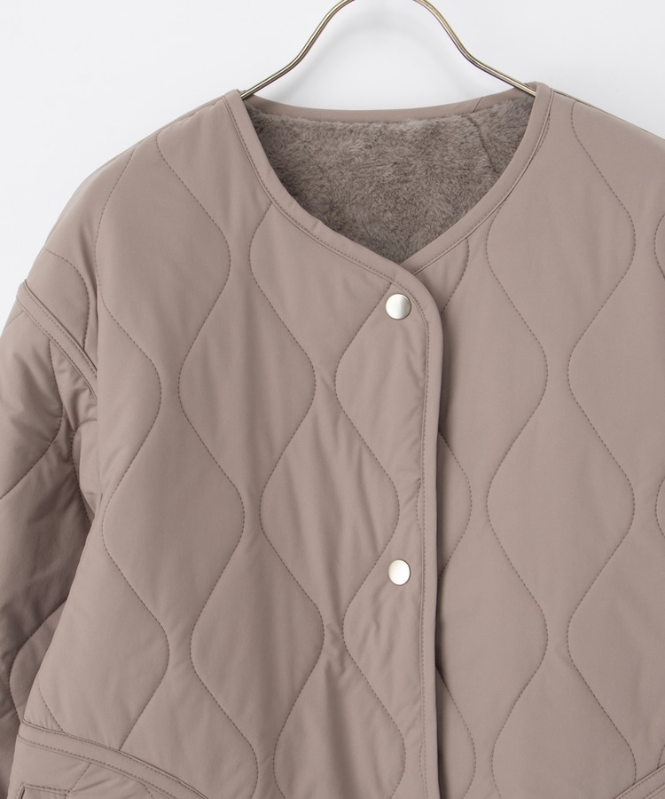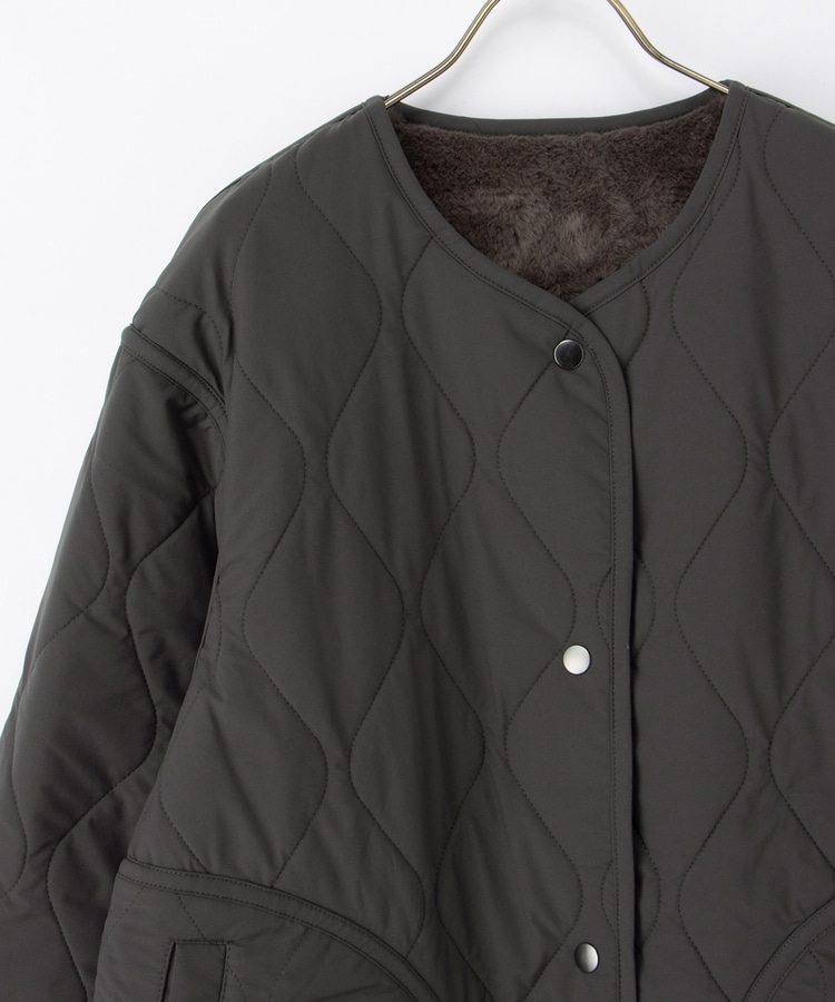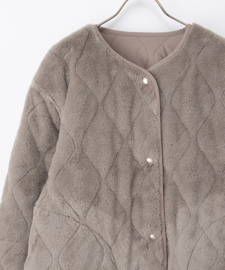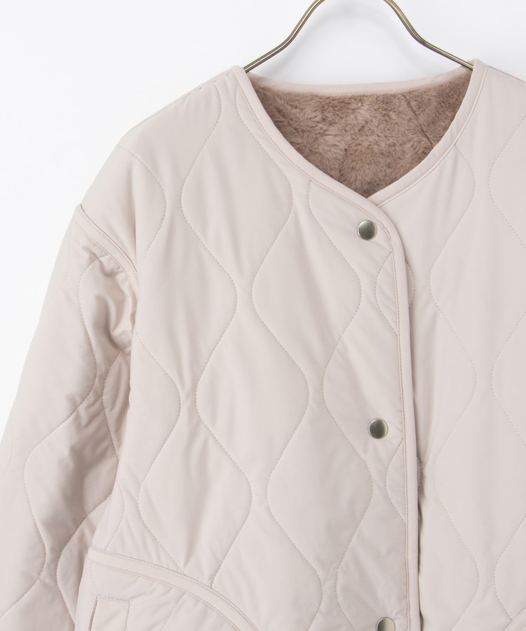 首元が開きすぎないノーカラーで、キルティングとファーの2Wayで楽しめるリバーシブルデザイン。