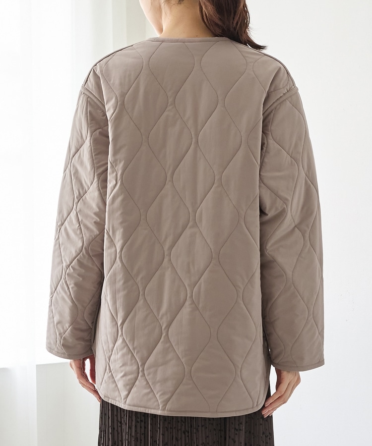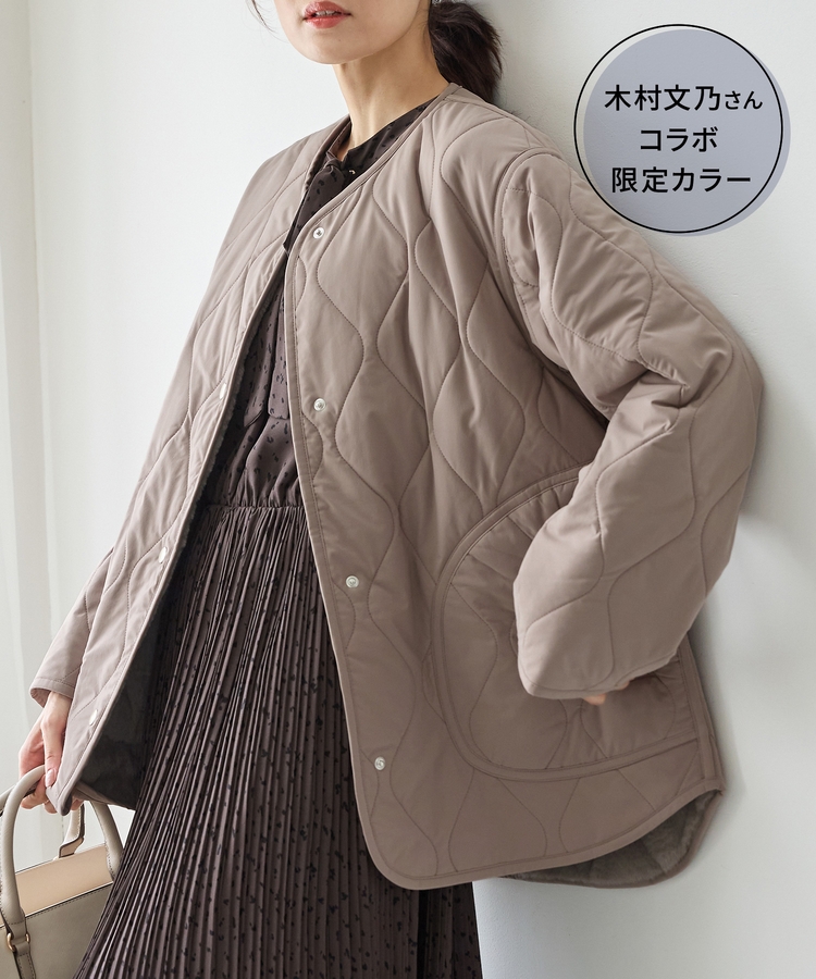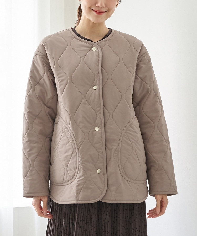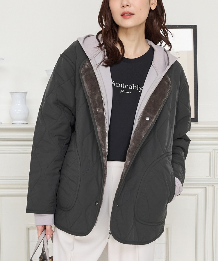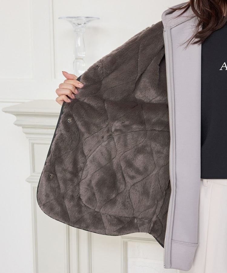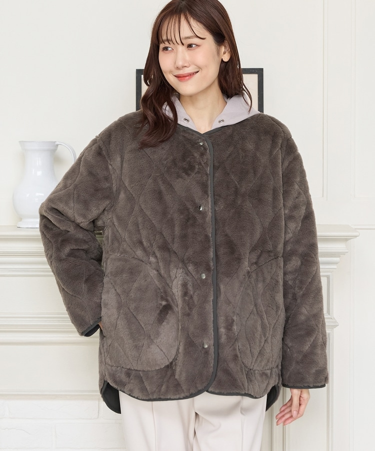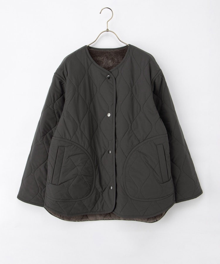 首元が開きすぎないノーカラーで、キルティングとファーの2Wayで楽しめるリバーシブルデザイン。