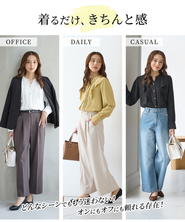 ジャケットにも合うサイズ感で、テーパードパンツやフレアスカートと合わせた、お仕事やフォーマルのきれいめスタイルに活躍。