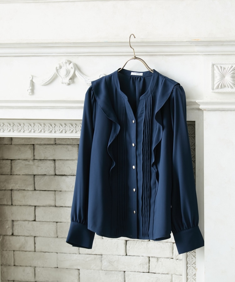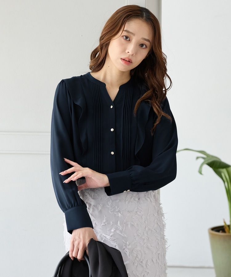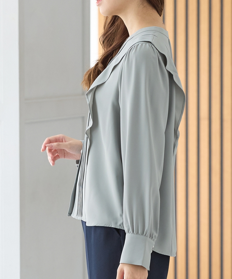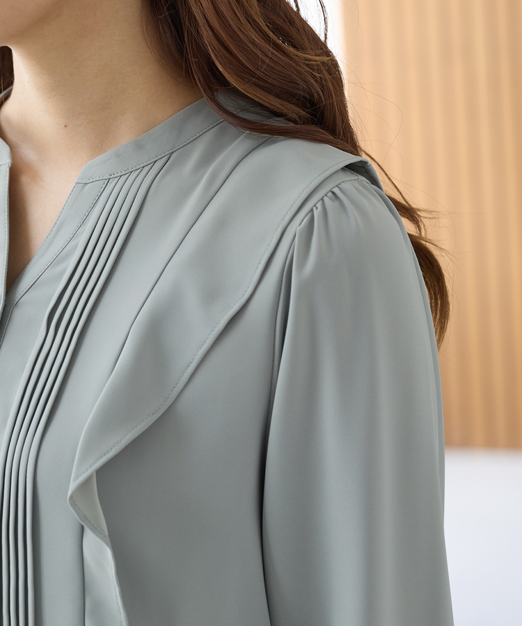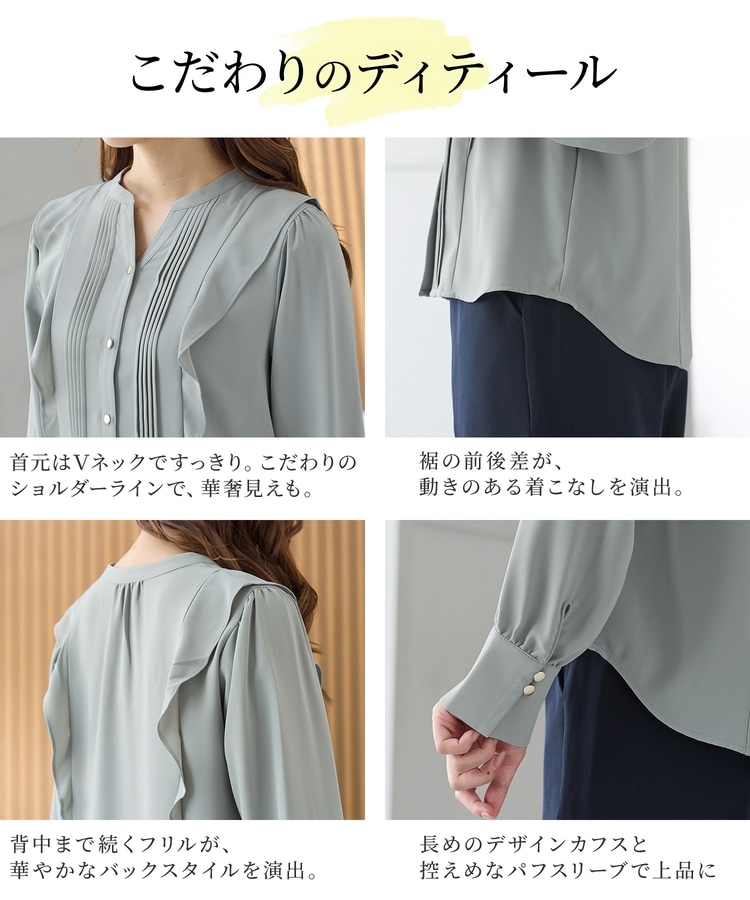 お仕事でも使える控えめなボリュームのフリルながら、顔回りを華やかに演出し、フェミニンな印象に。