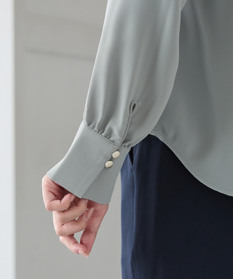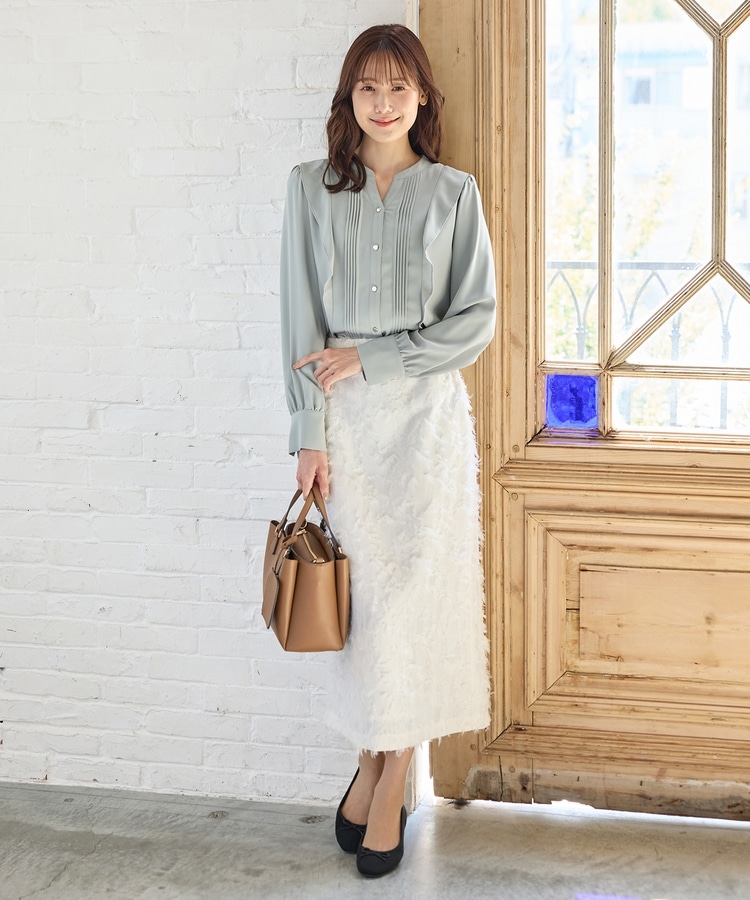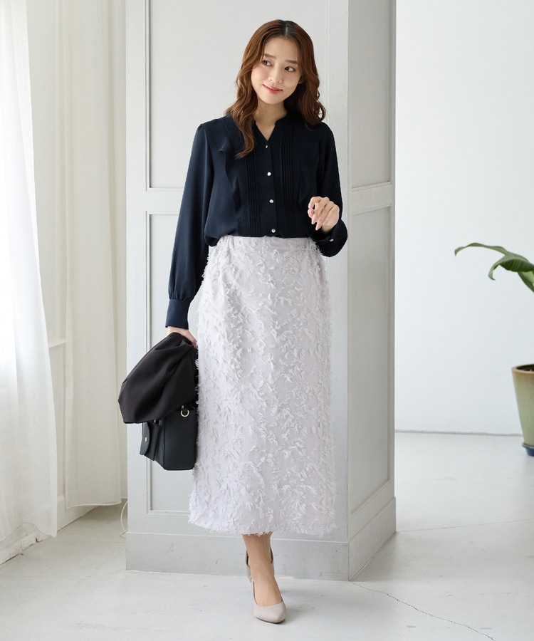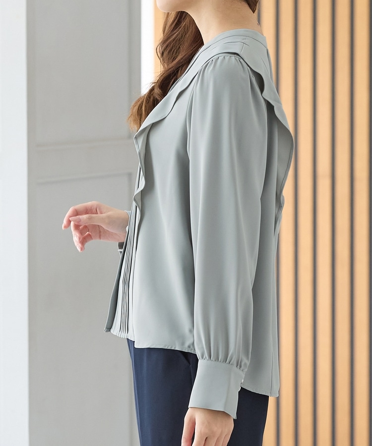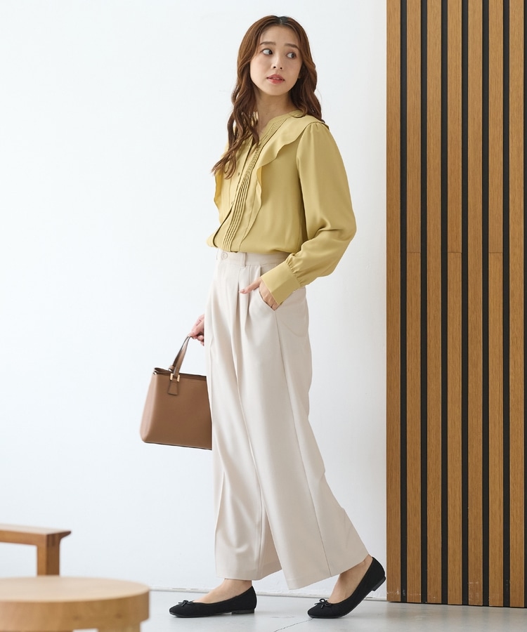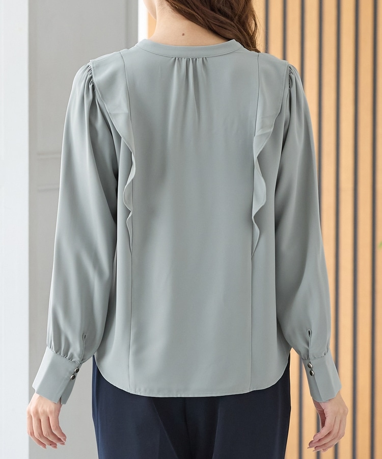 お仕事でも使える控えめなボリュームのフリルながら、顔回りを華やかに演出し、フェミニンな印象に。