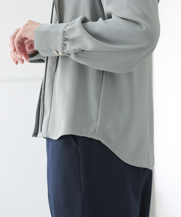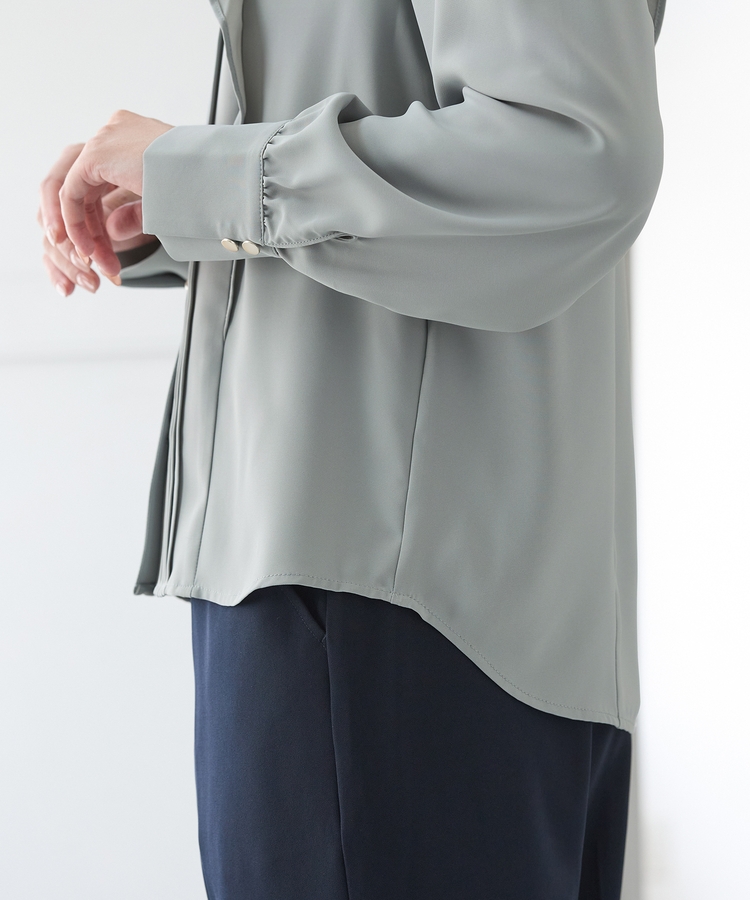 衿元はバンドカラーのVネックですっきり見せ。