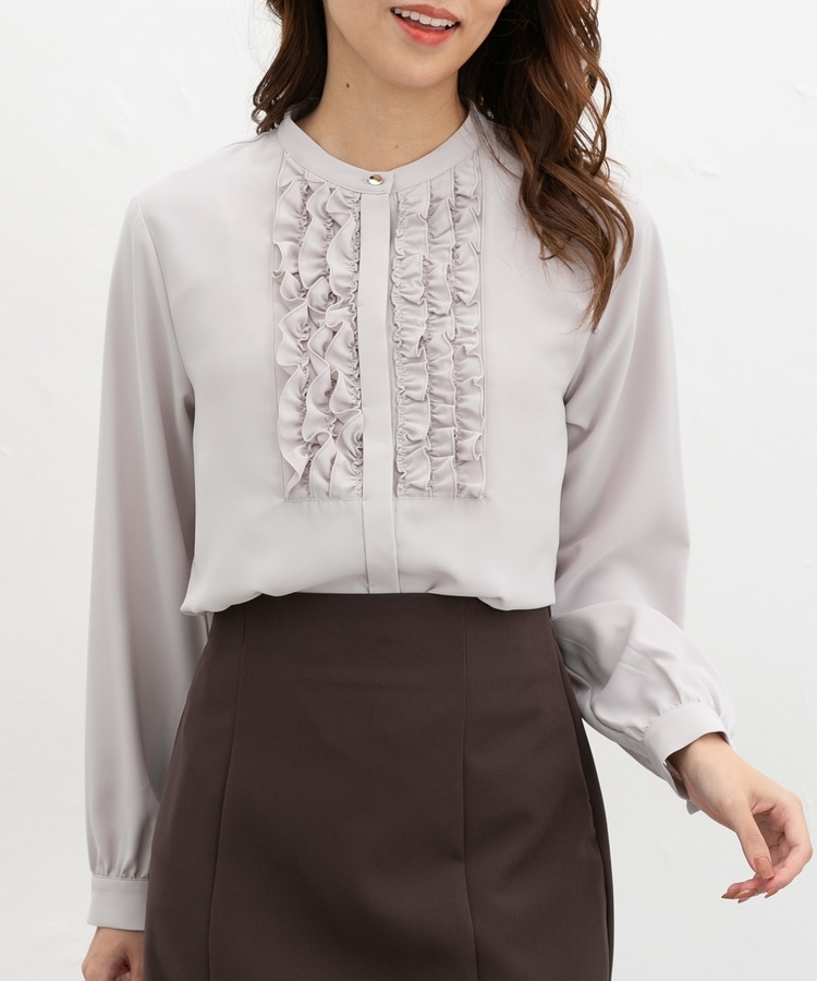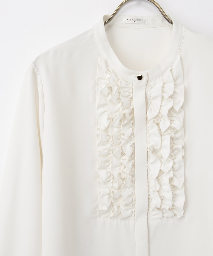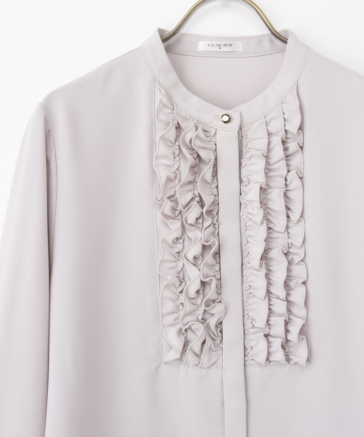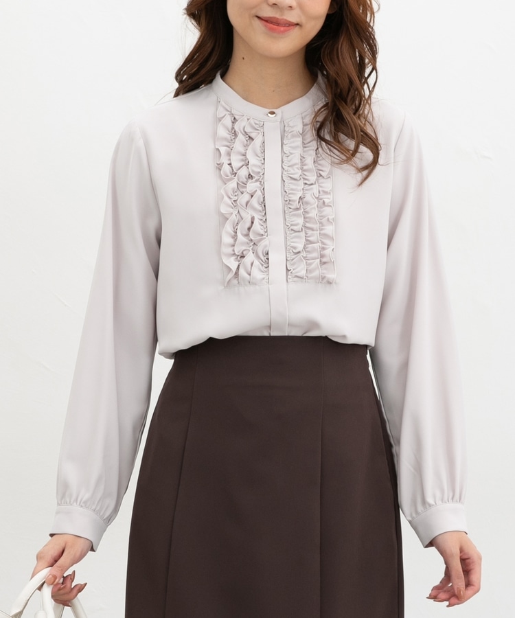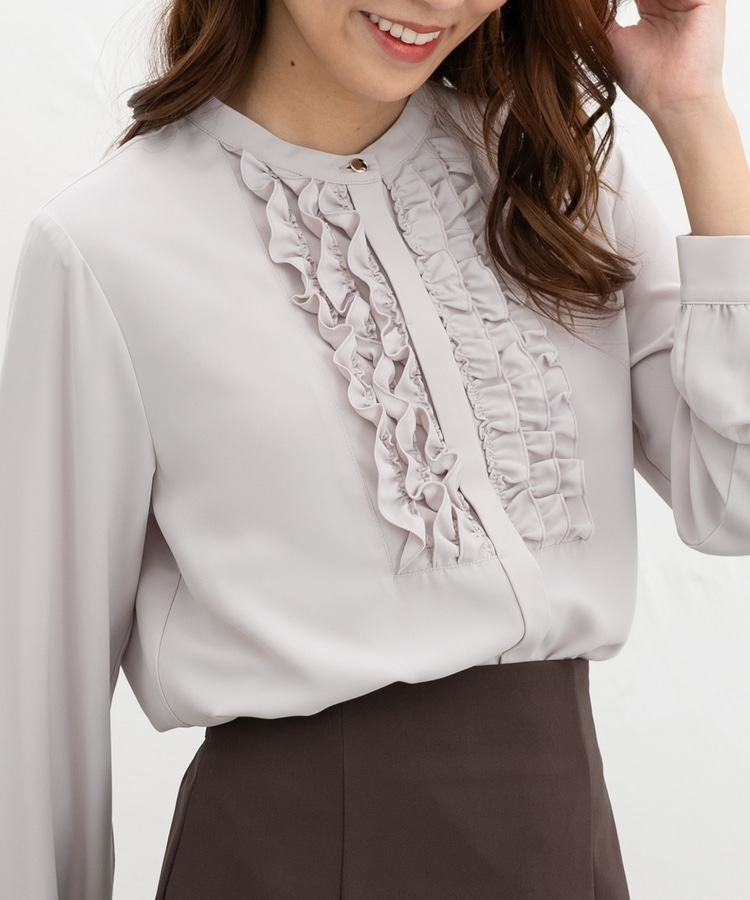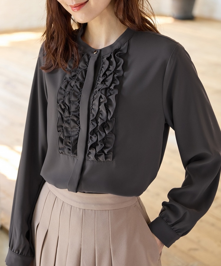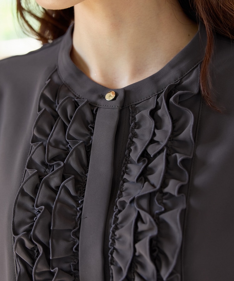 フロントのフリル使いが華やかな大人可愛いデザインに、バンドカラーできちんと感をプラス。