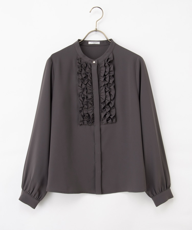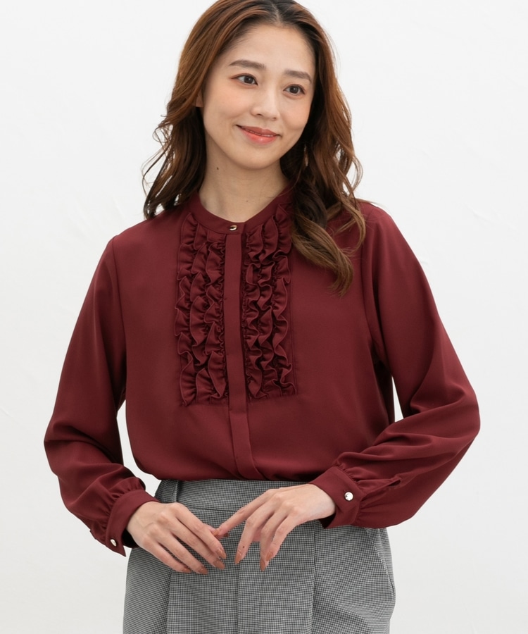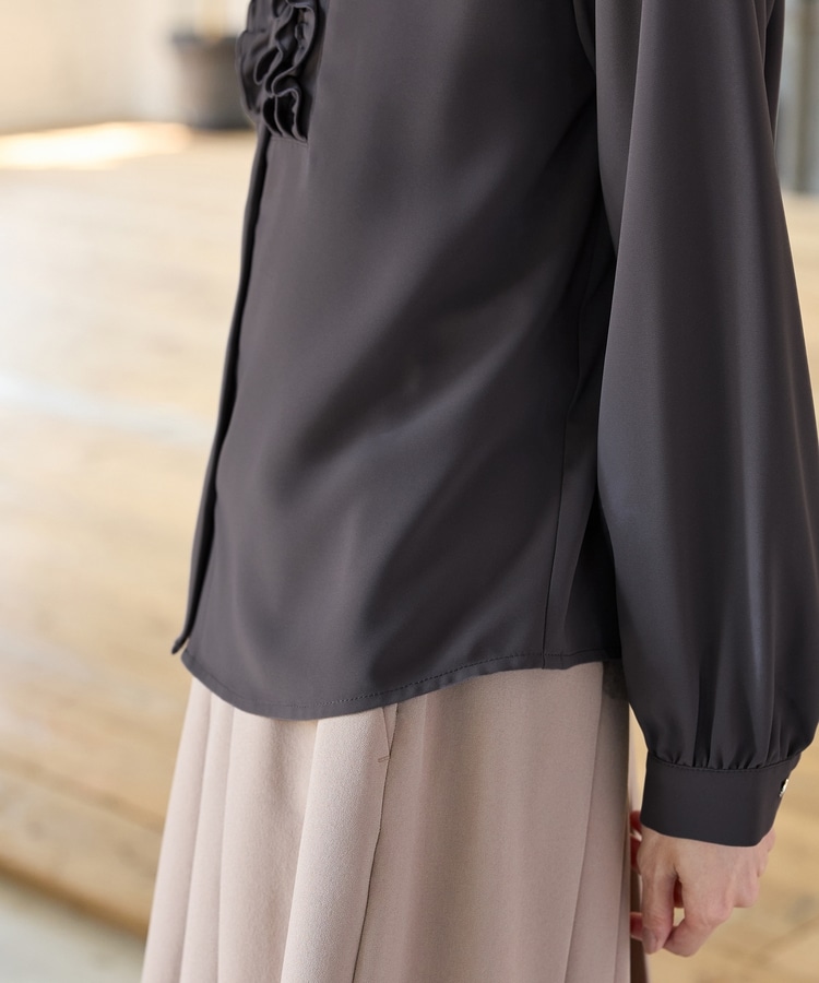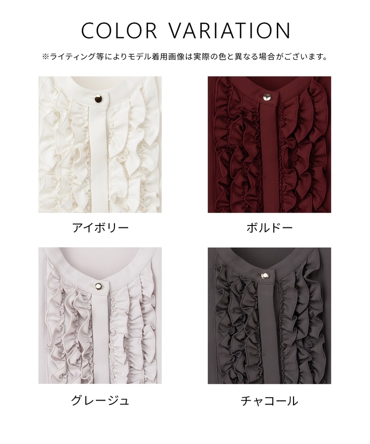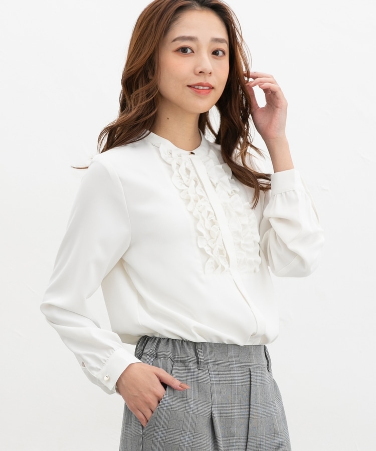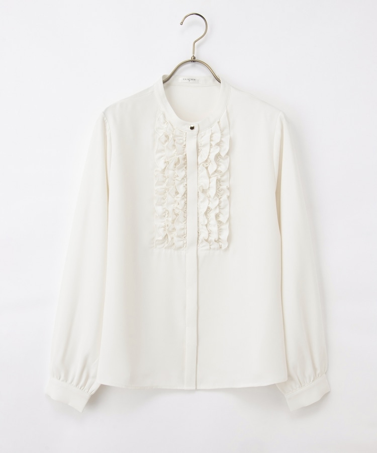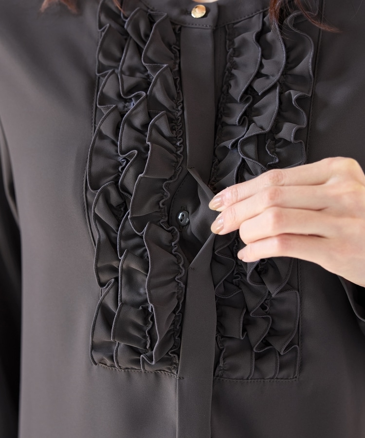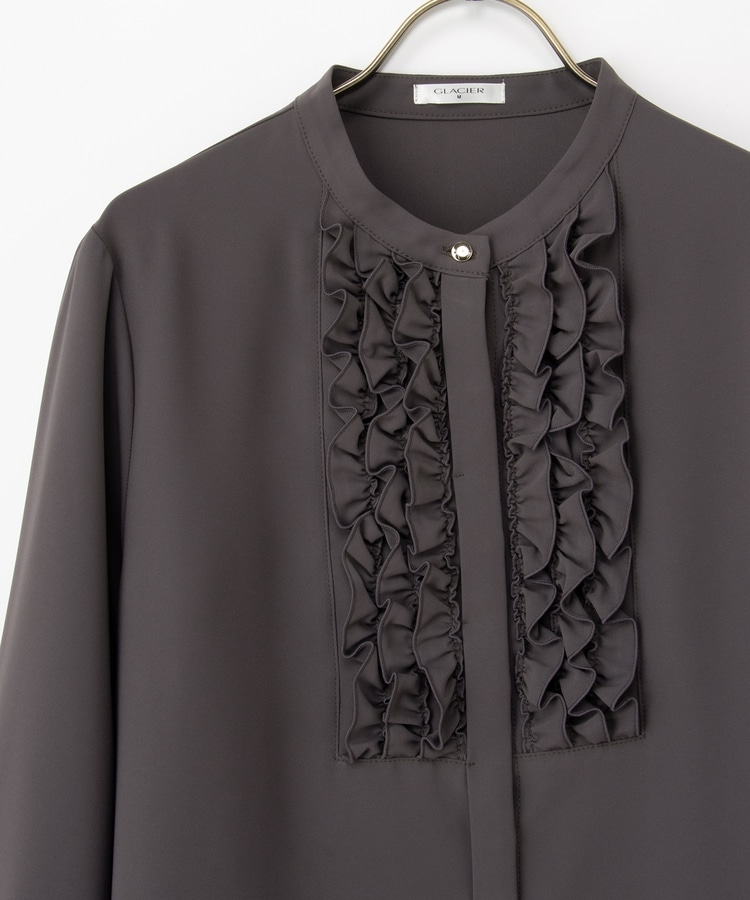 フロントのフリル使いが華やかな大人可愛いデザインに、バンドカラーできちんと感をプラス。