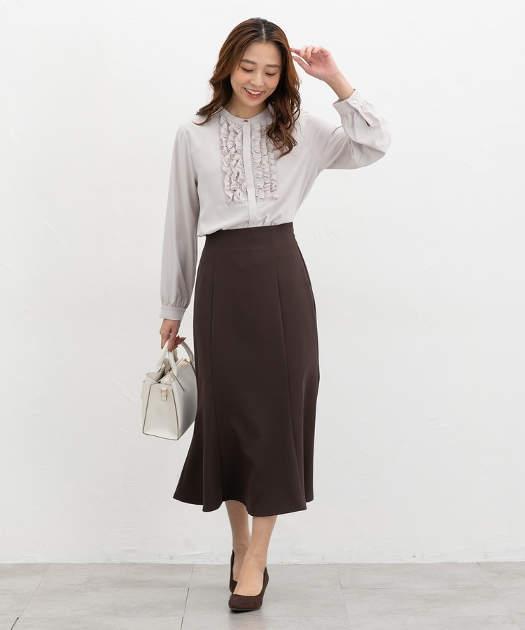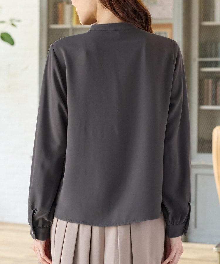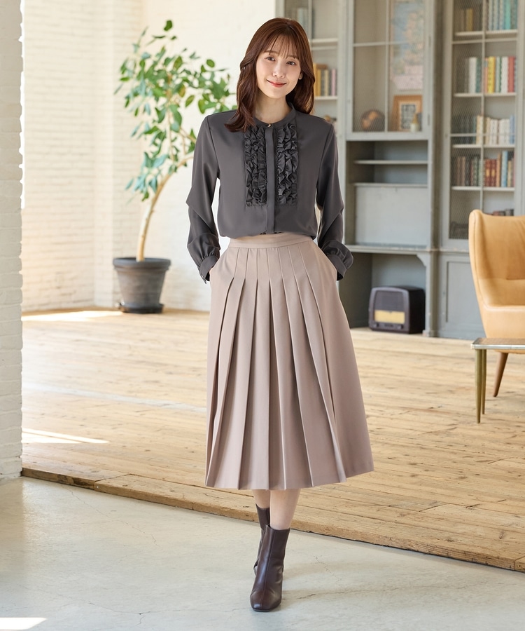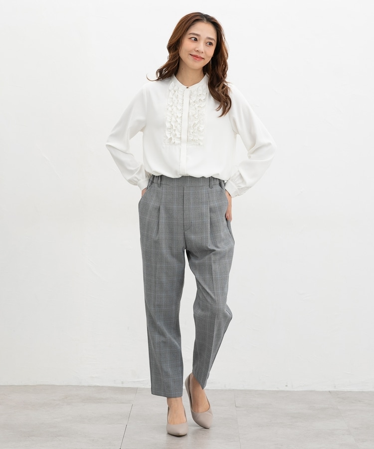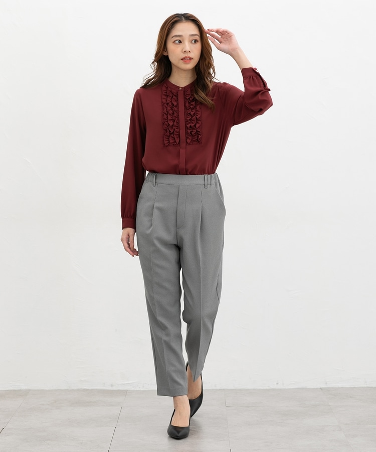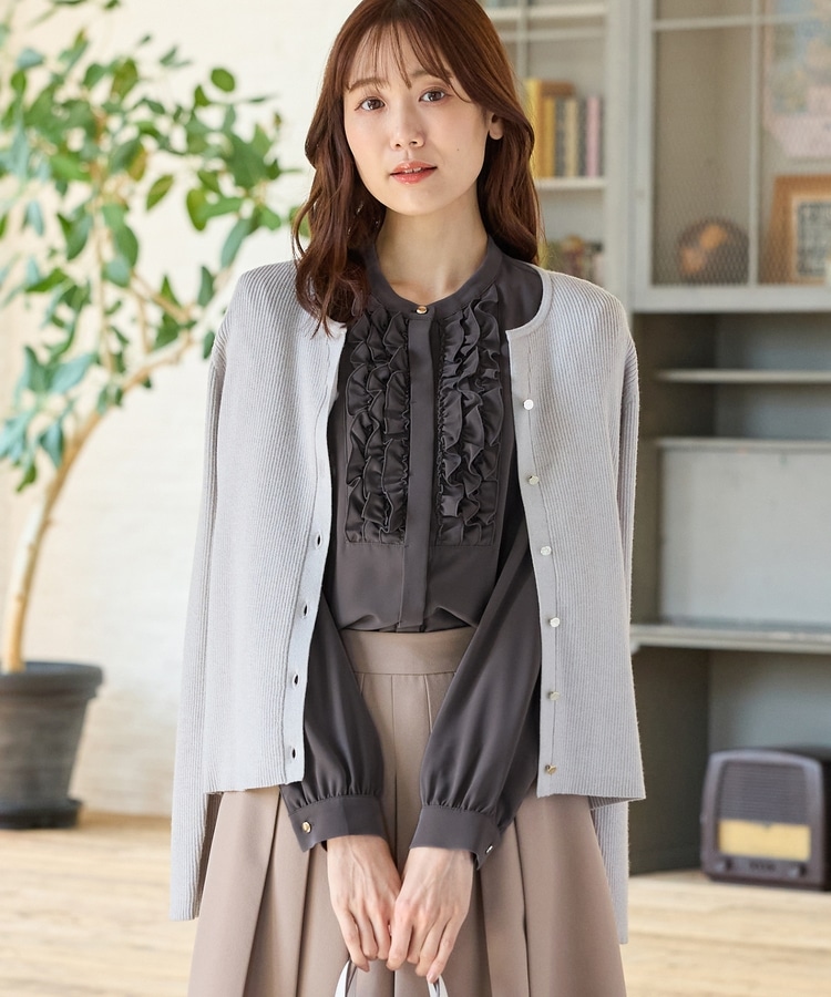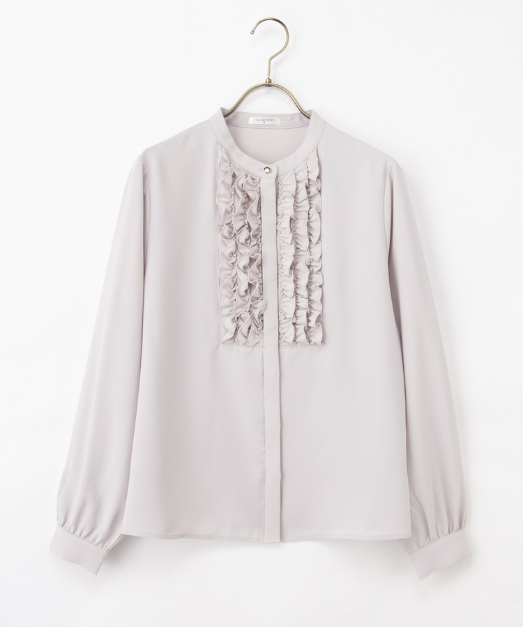 フロントのフリル使いが華やかな大人可愛いデザインに、バンドカラーできちんと感をプラス。