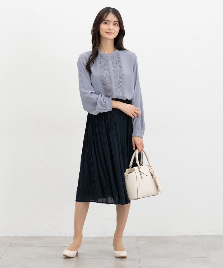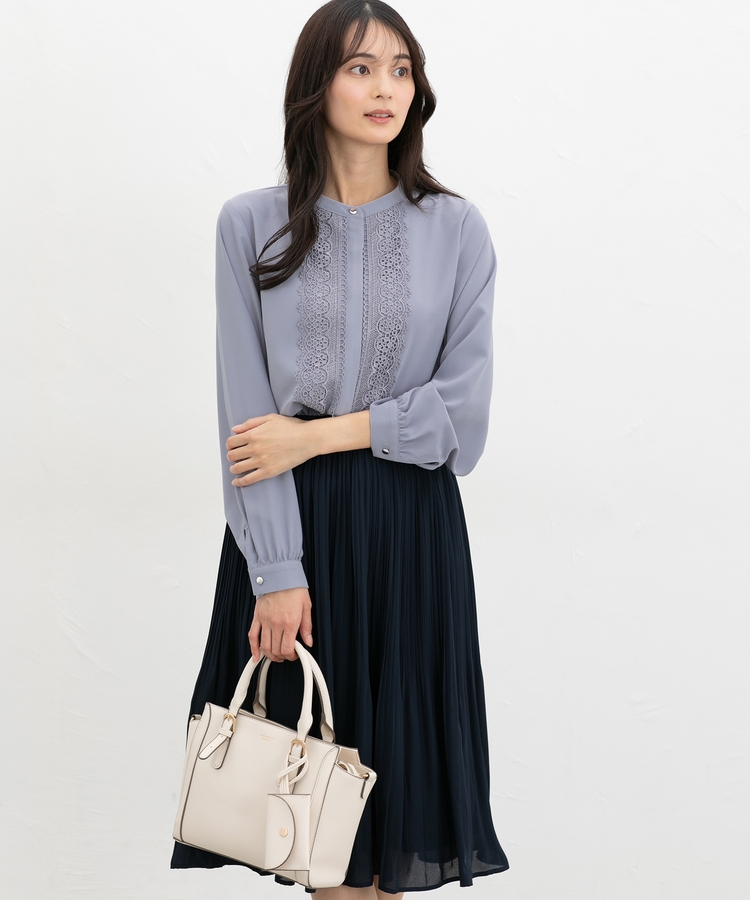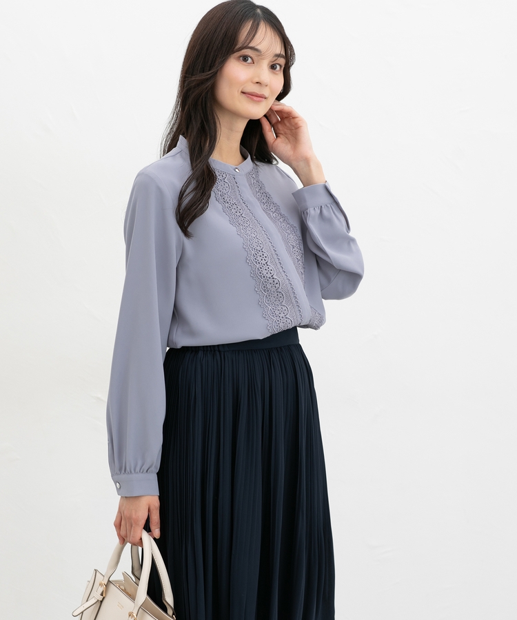 ボタンを隠した比翼仕立てとバンドカラーできちんと感をプラス。