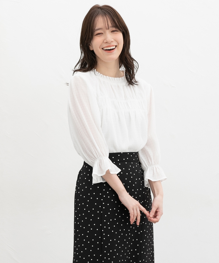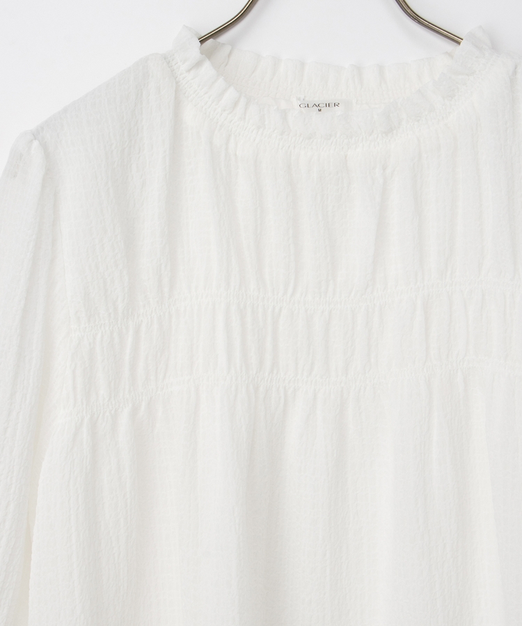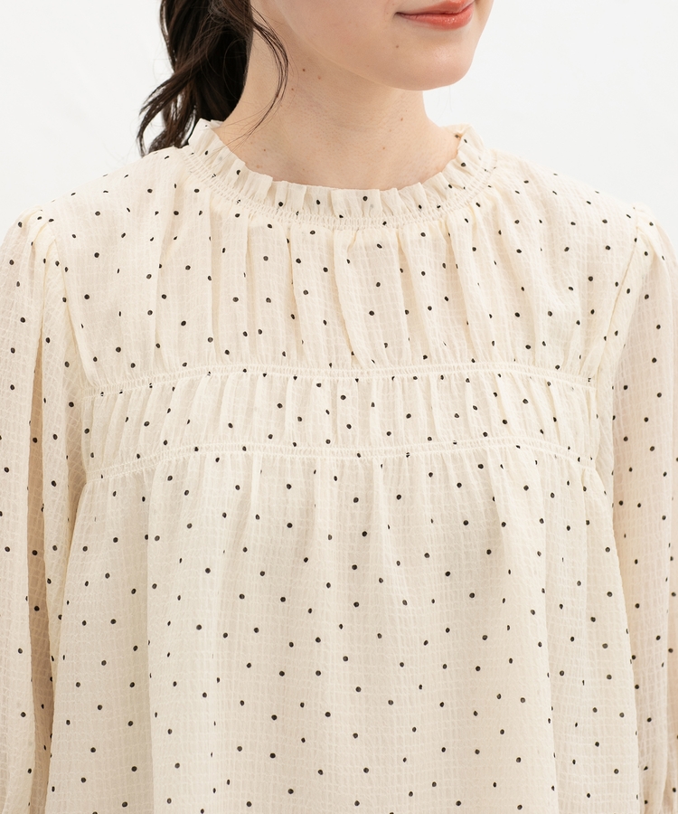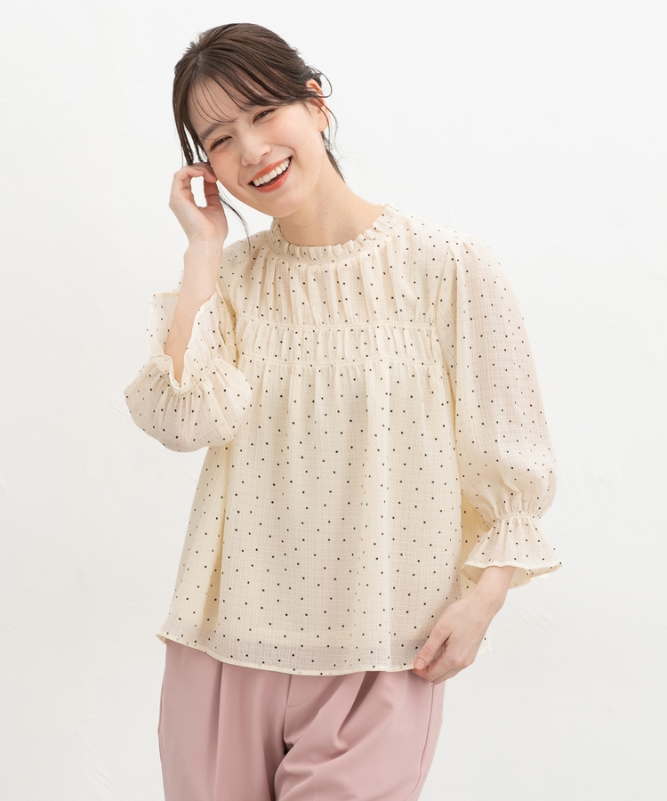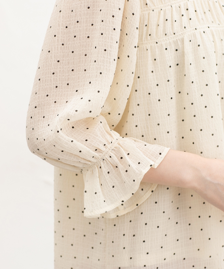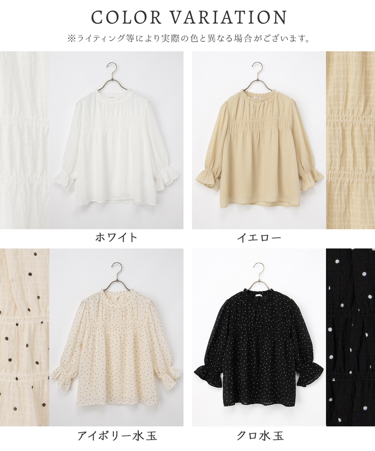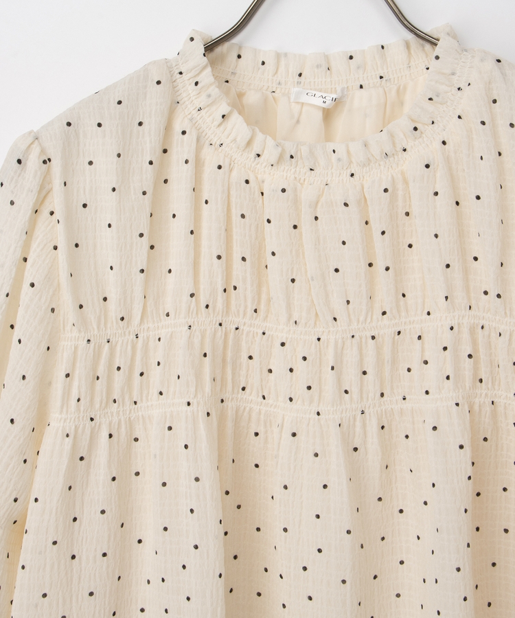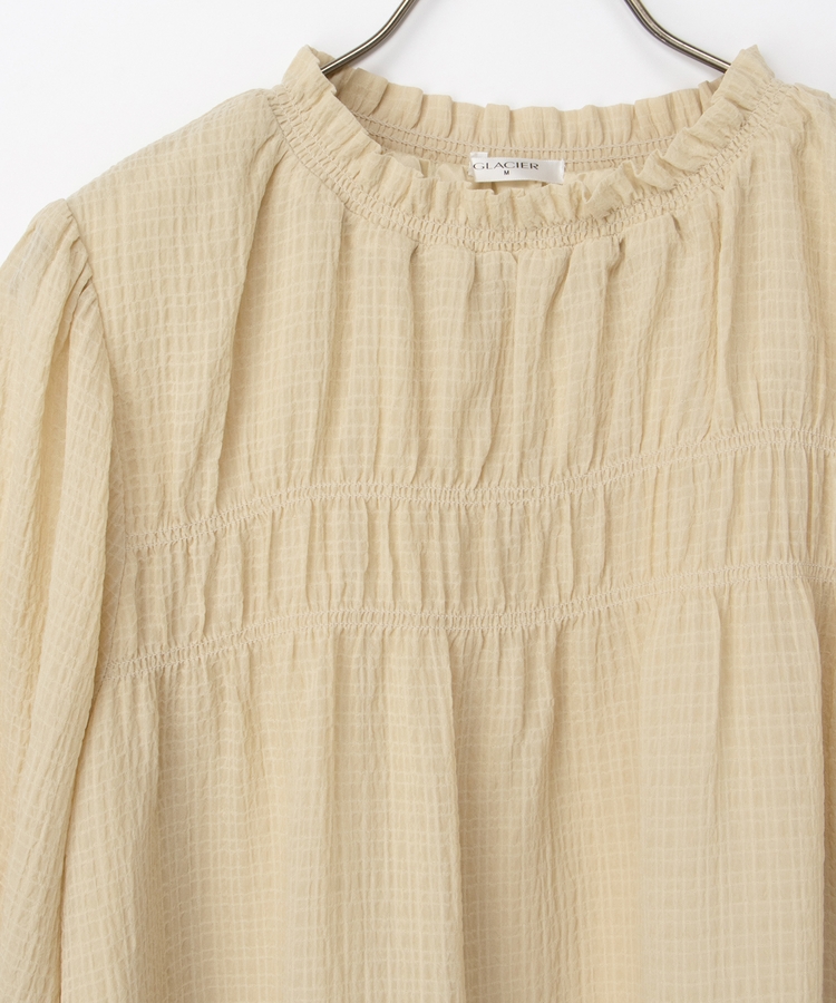 衿ぐりと袖口のゴムシャーリングが作る細かなギャザーが上品でフェミニンなデザイン。