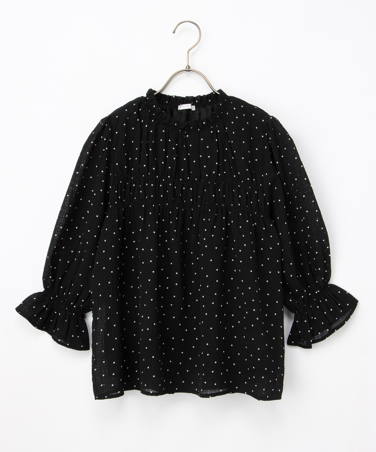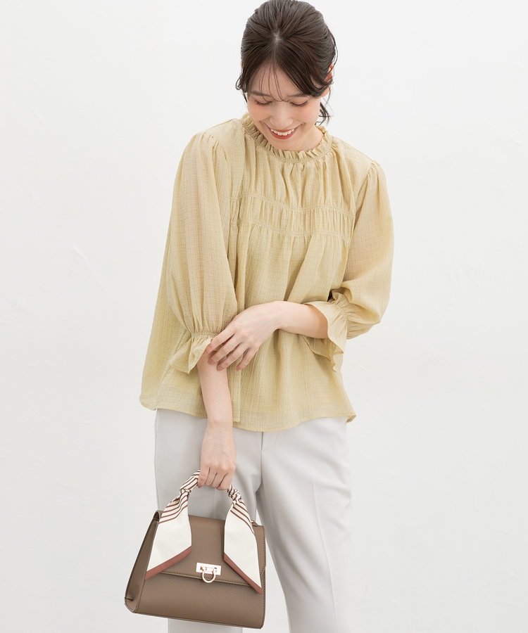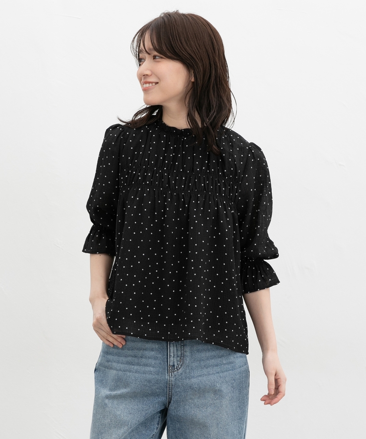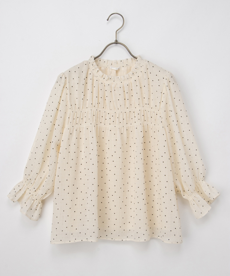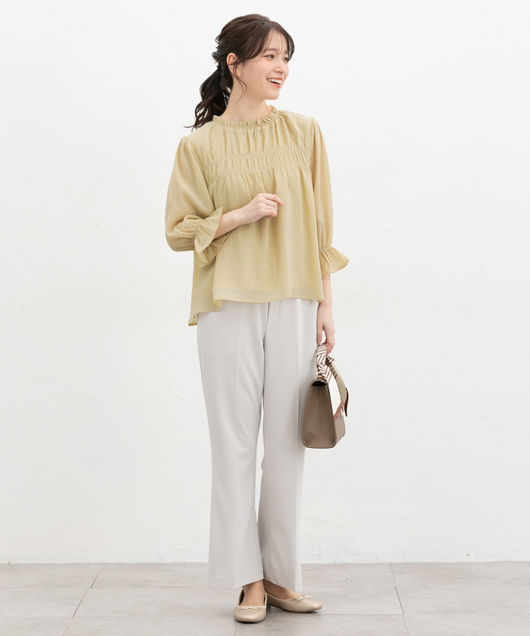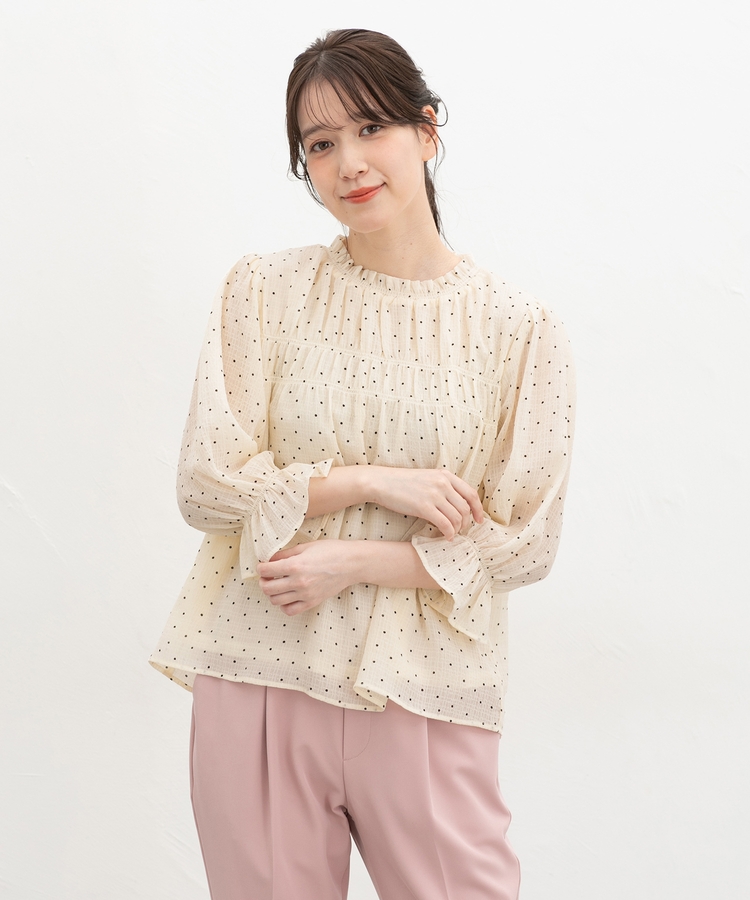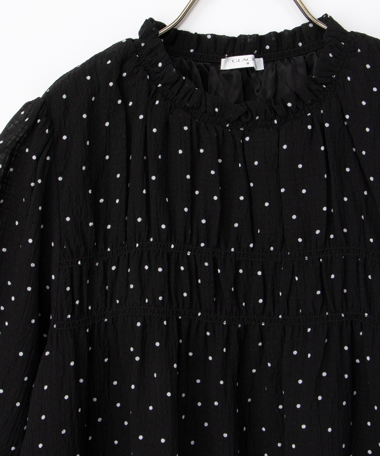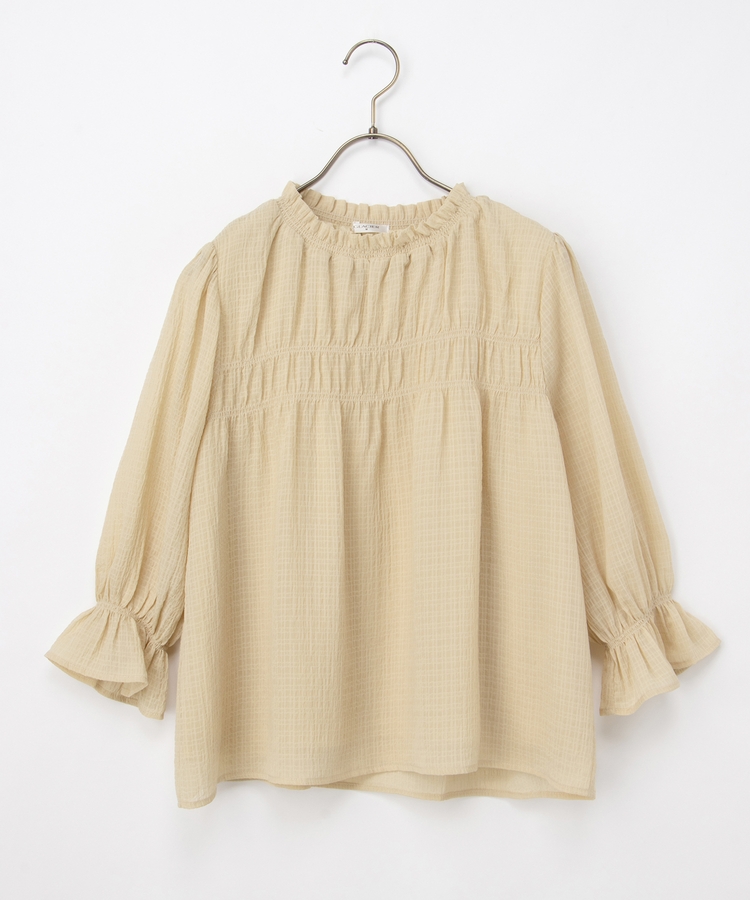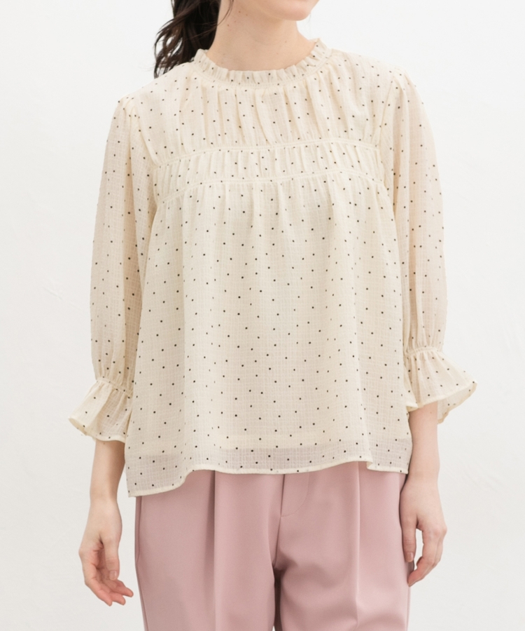 衿ぐりと袖口のゴムシャーリングが作る細かなギャザーが上品でフェミニンなデザイン。