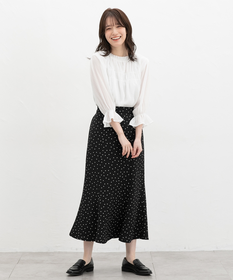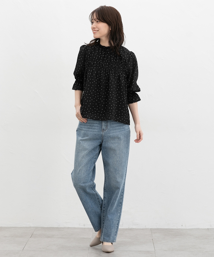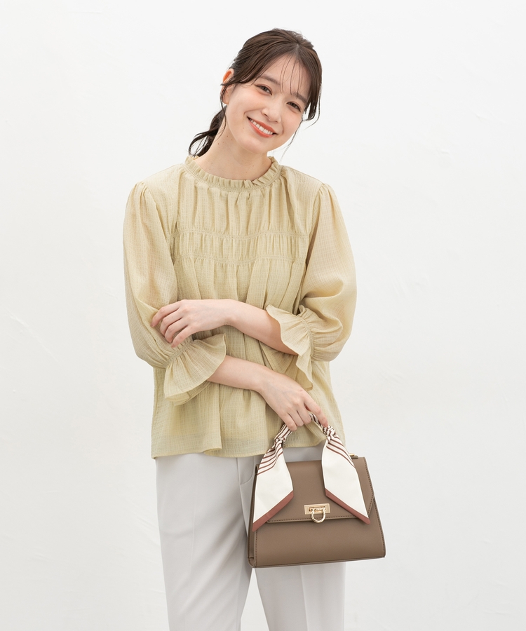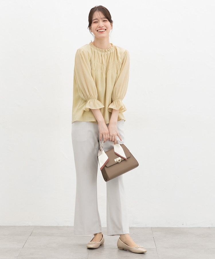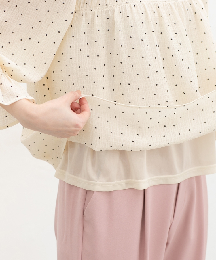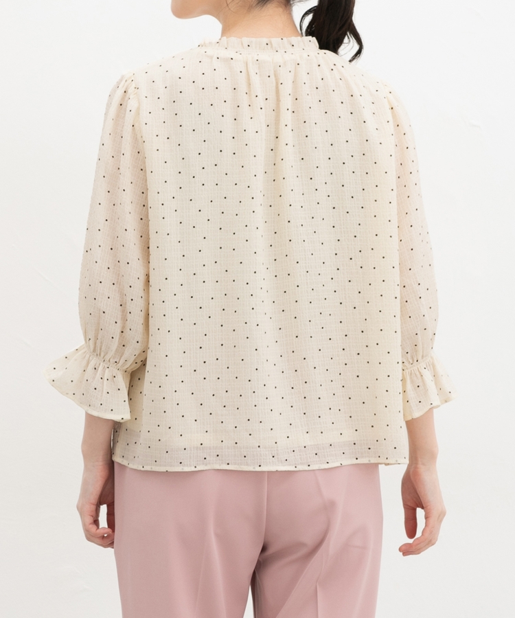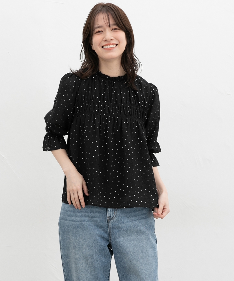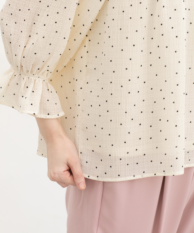 衿ぐりと袖口のゴムシャーリングが作る細かなギャザーが上品でフェミニンなデザイン。