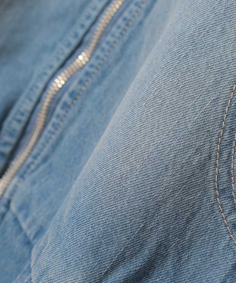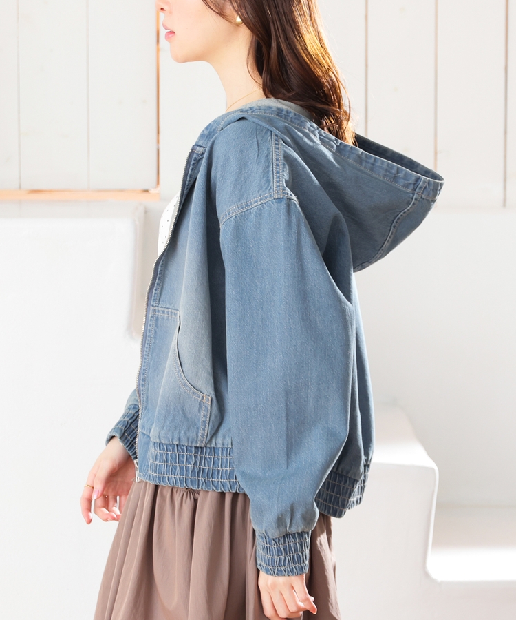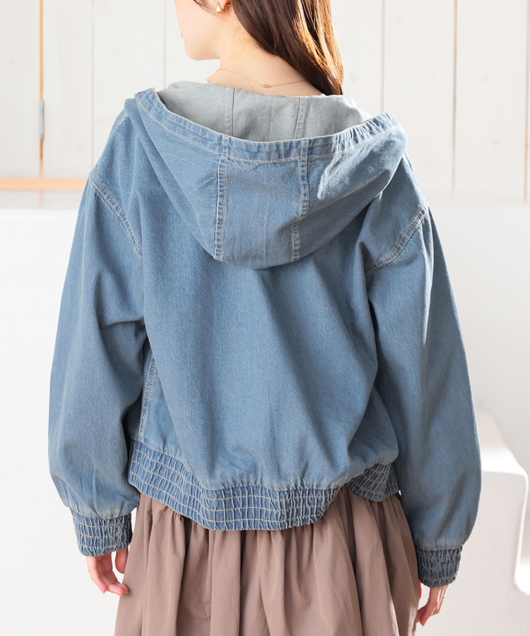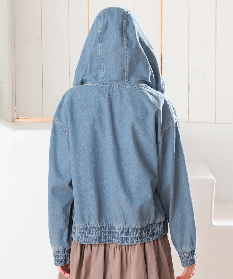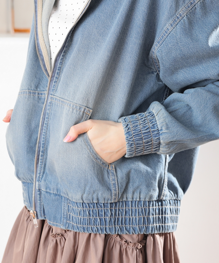 フロントファスナーで着脱しやすく、さっと手軽に羽織れるフードブルゾンを、デニム素材でよりカジュアルな印象に。