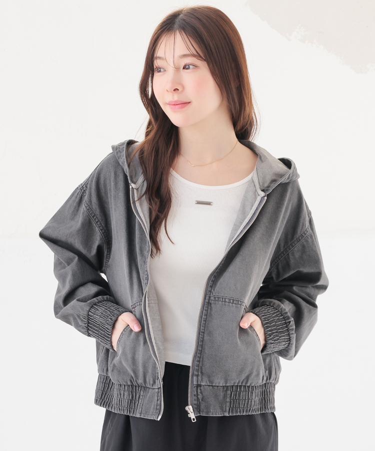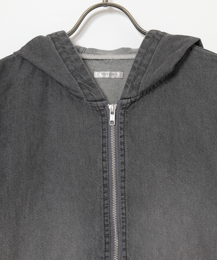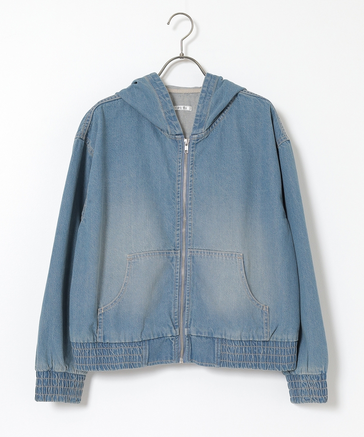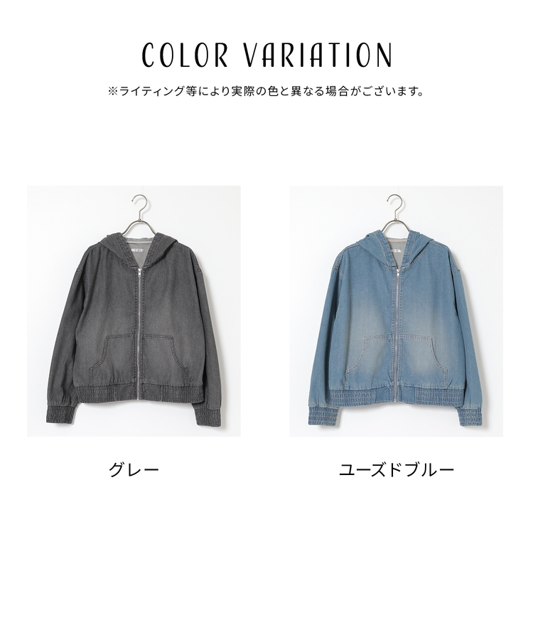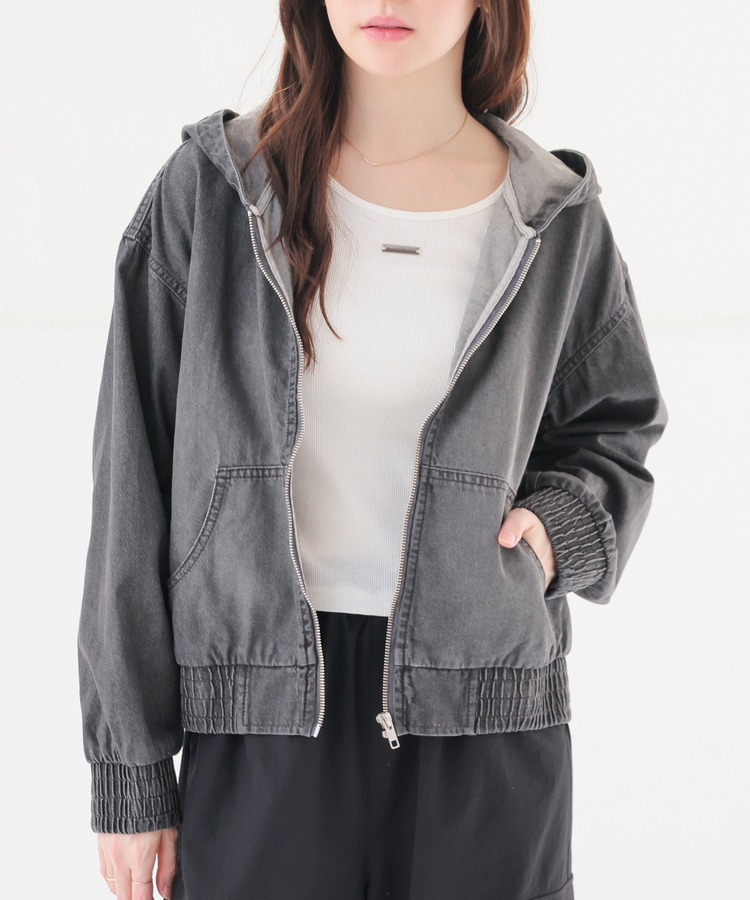フロントファスナーで着脱しやすく、さっと手軽に羽織れるフードブルゾンを、デニム素材でよりカジュアルな印象に。
