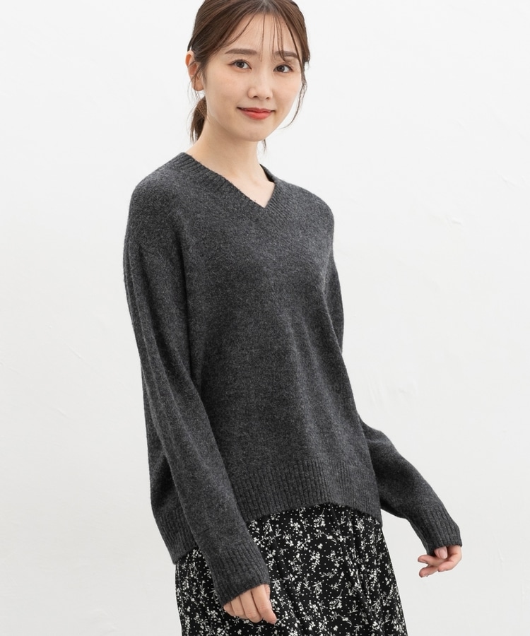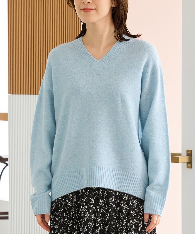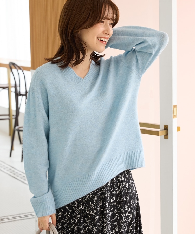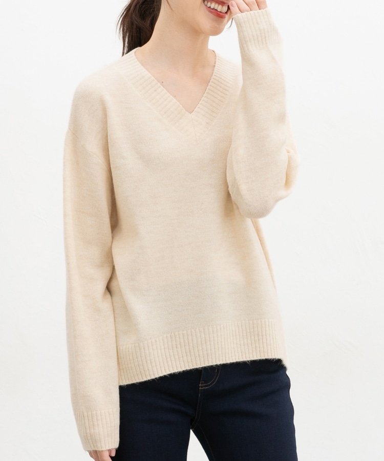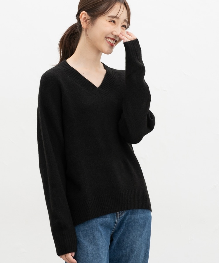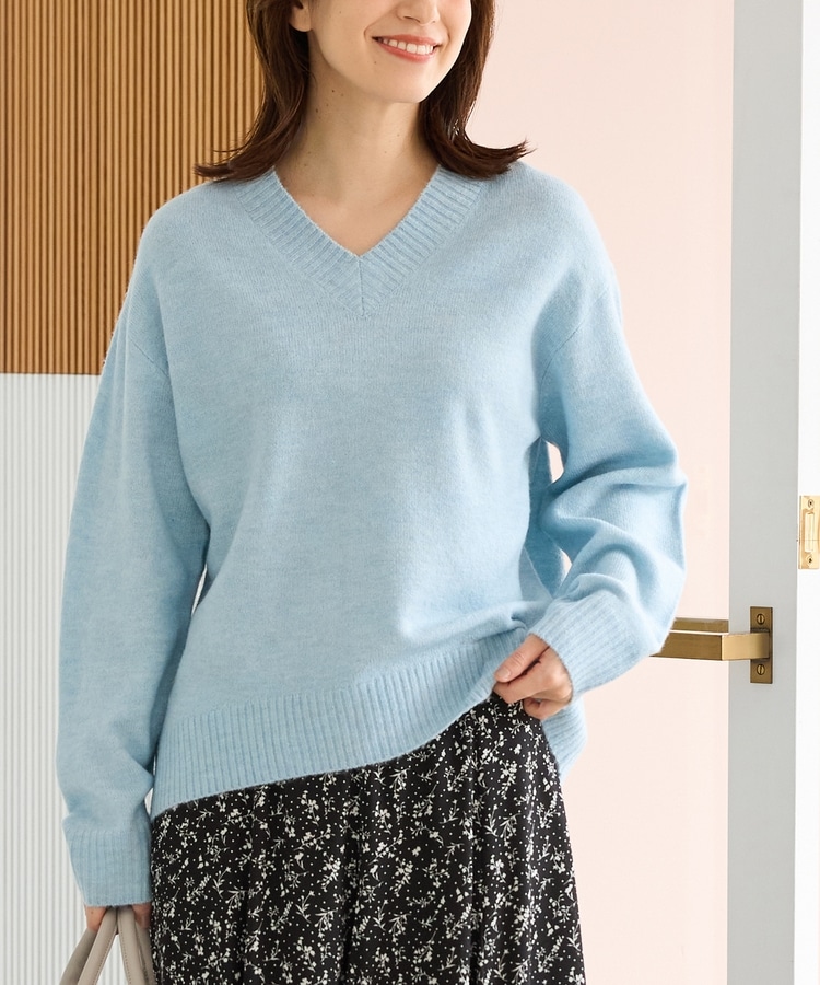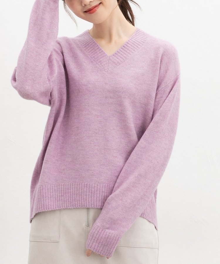 首元がすっきりきれいに見えるVネックのシンプルデザイン。
