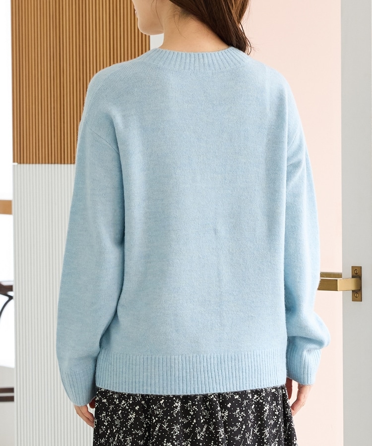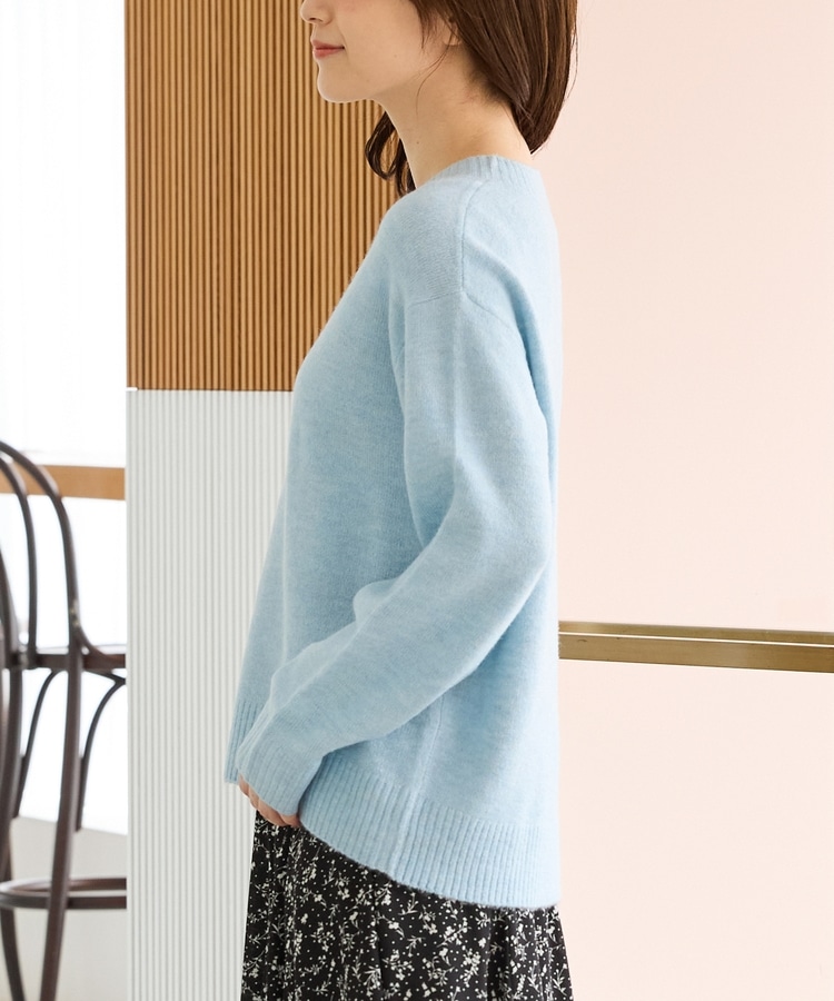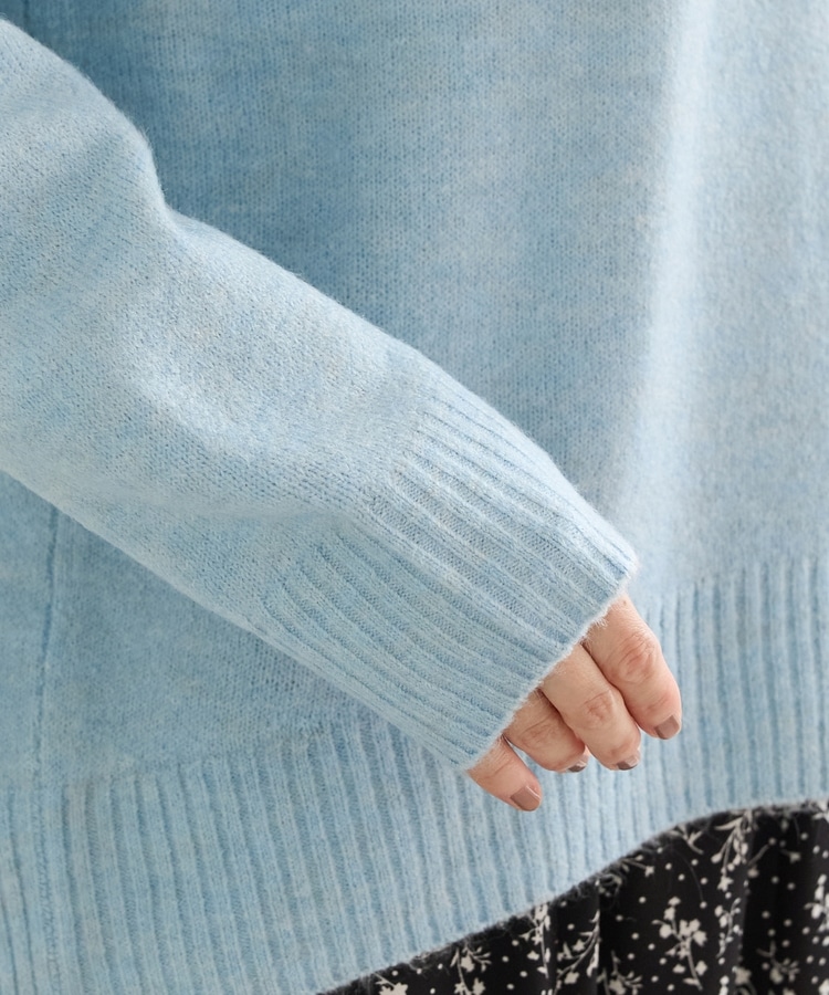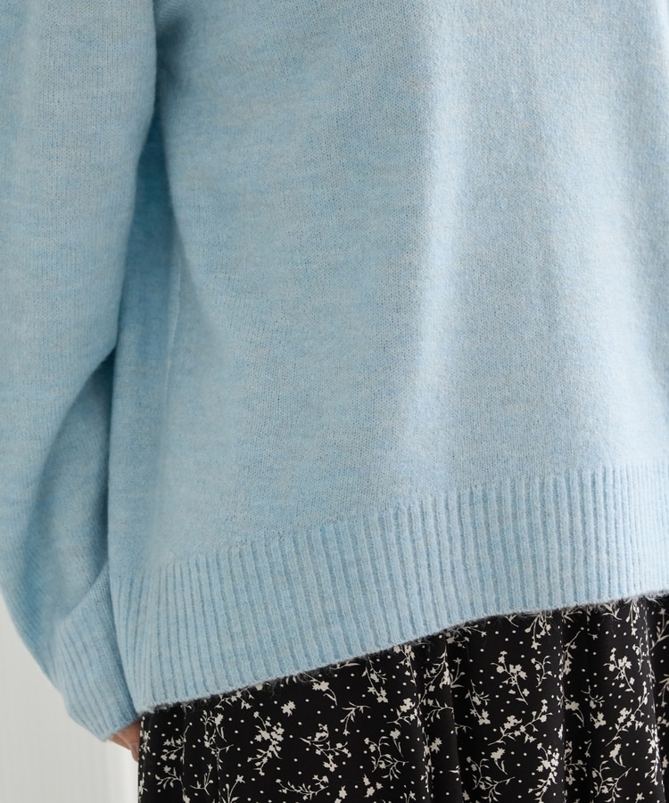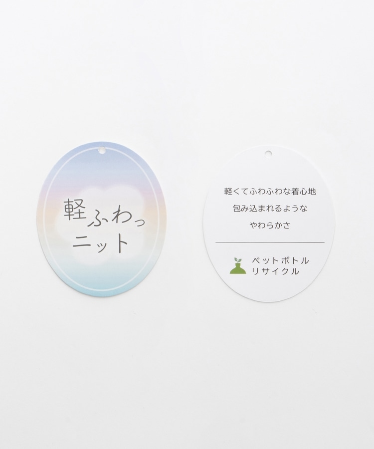 環境に優しい再生ポリエステルを使用した、ふわふわで軽く包み込まれるようなやわらかさのウール混『軽ふわっニット』素材。