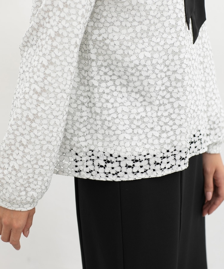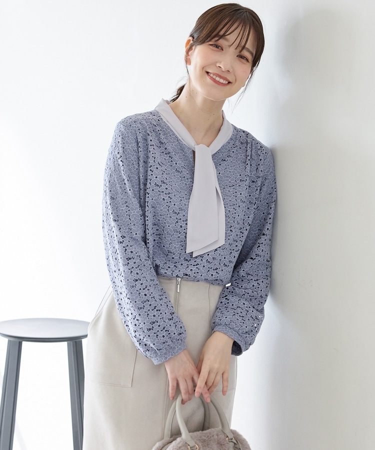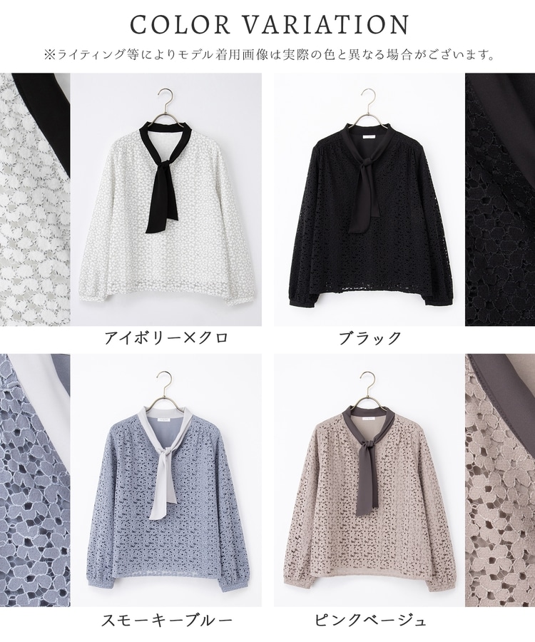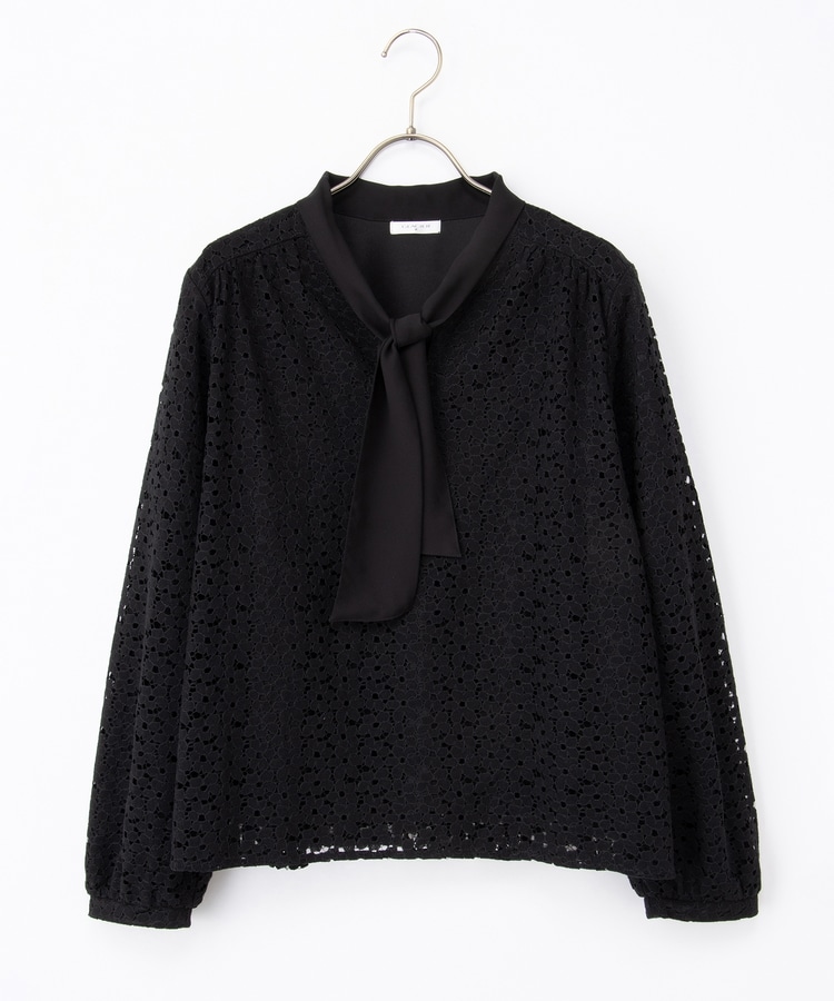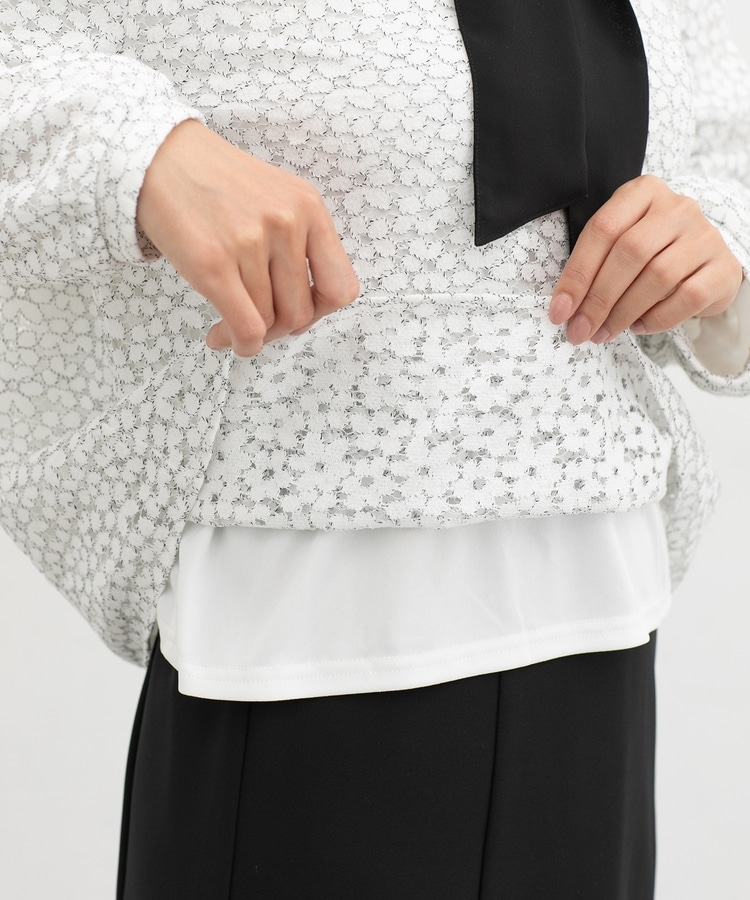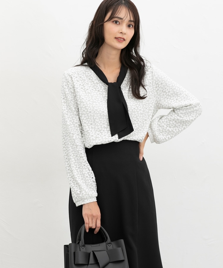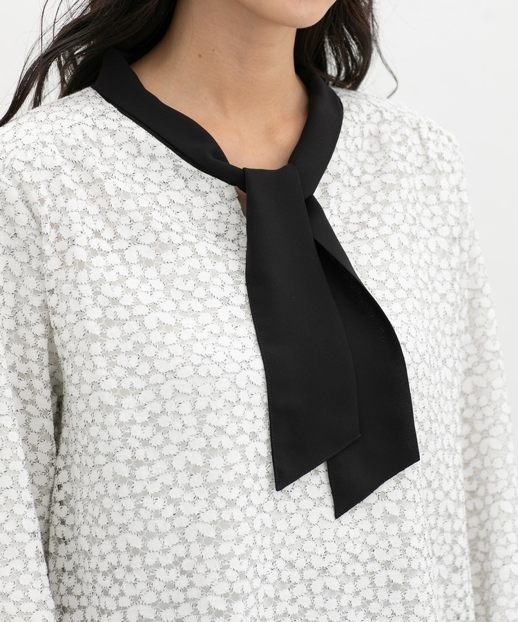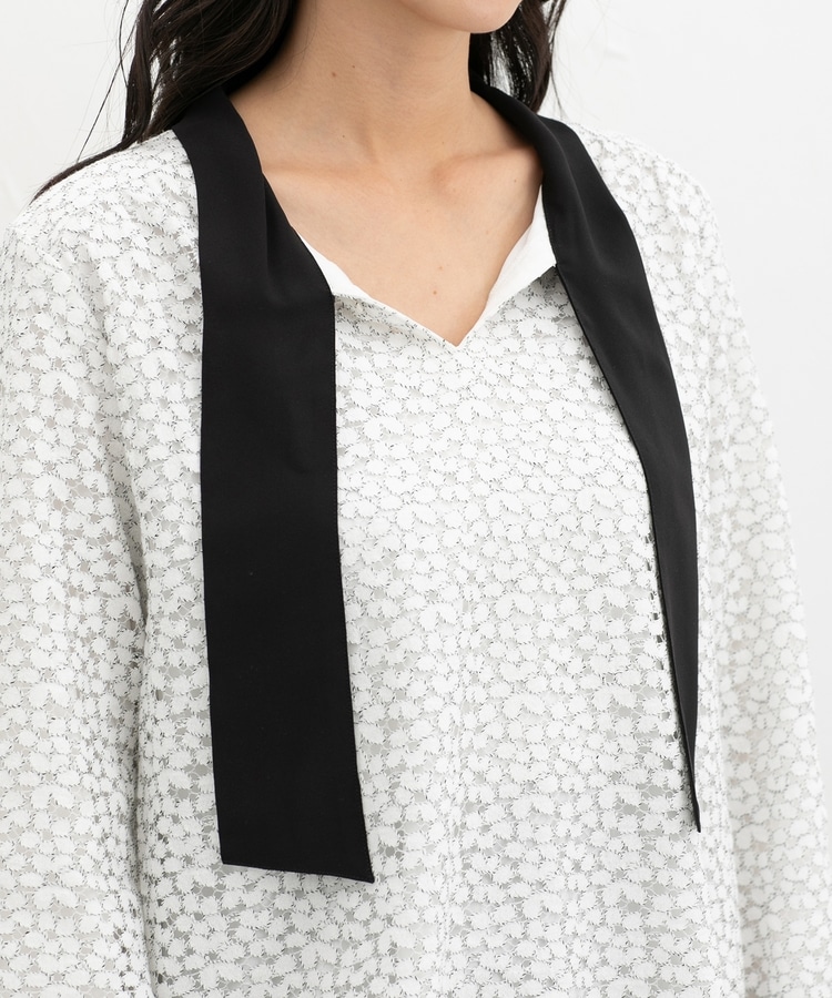 繊細な花柄レースとボウタイが華やかな、1枚で着映えするデザイン。