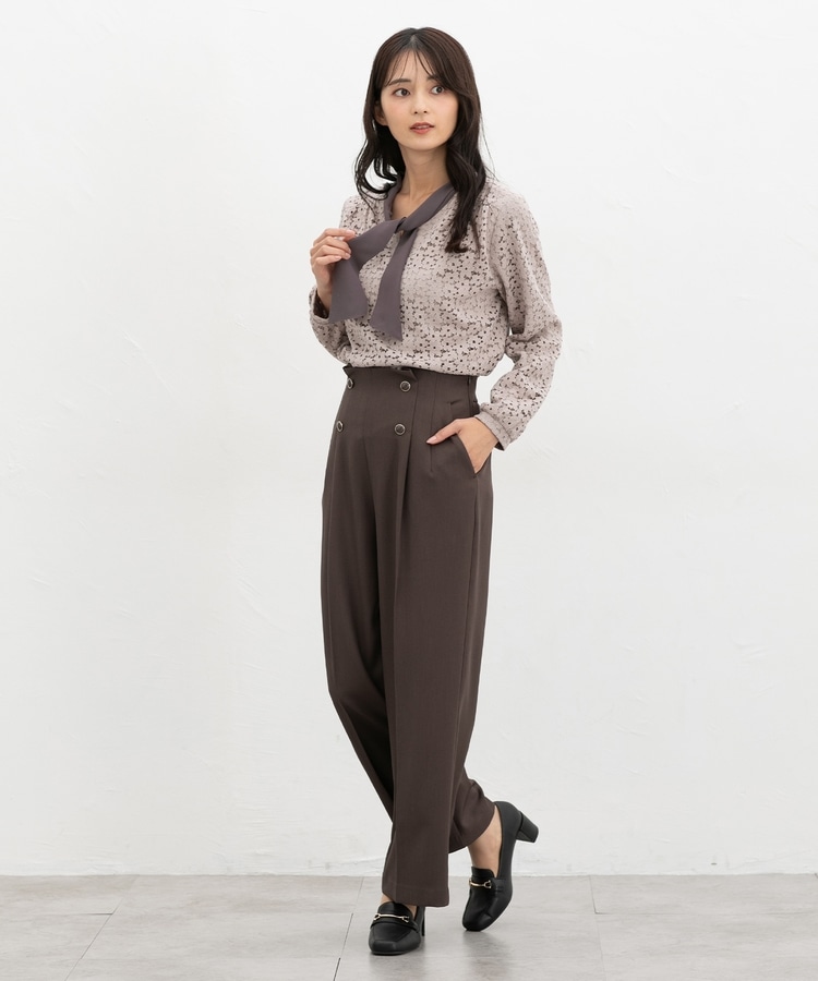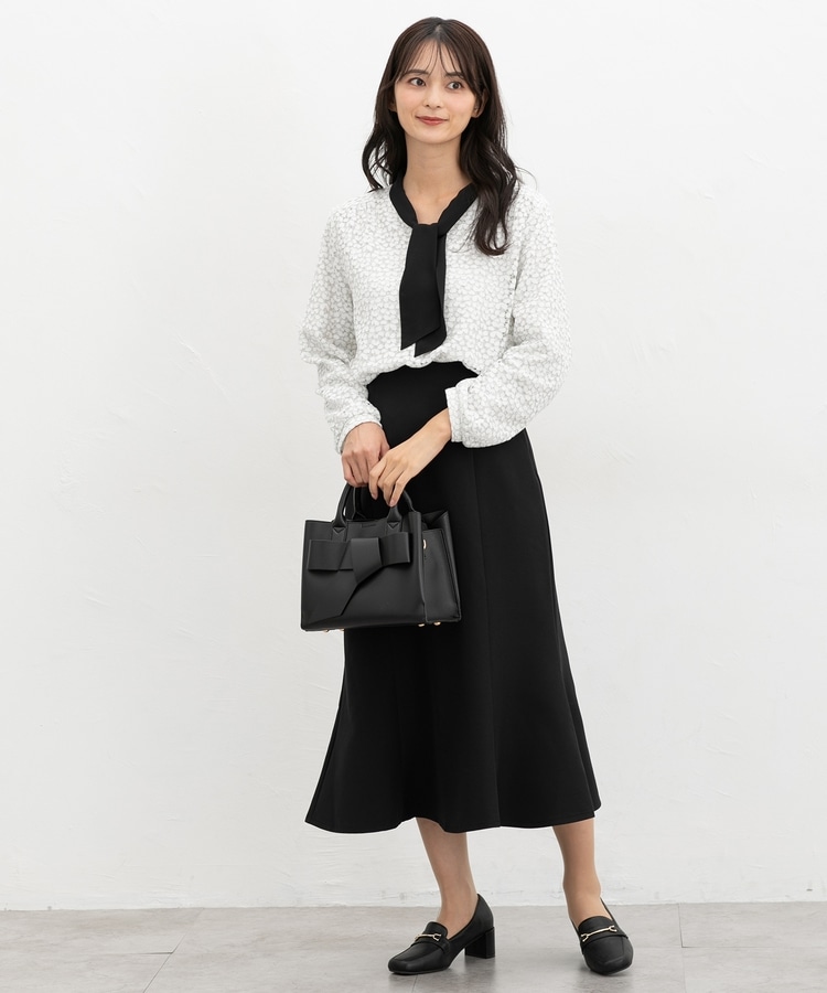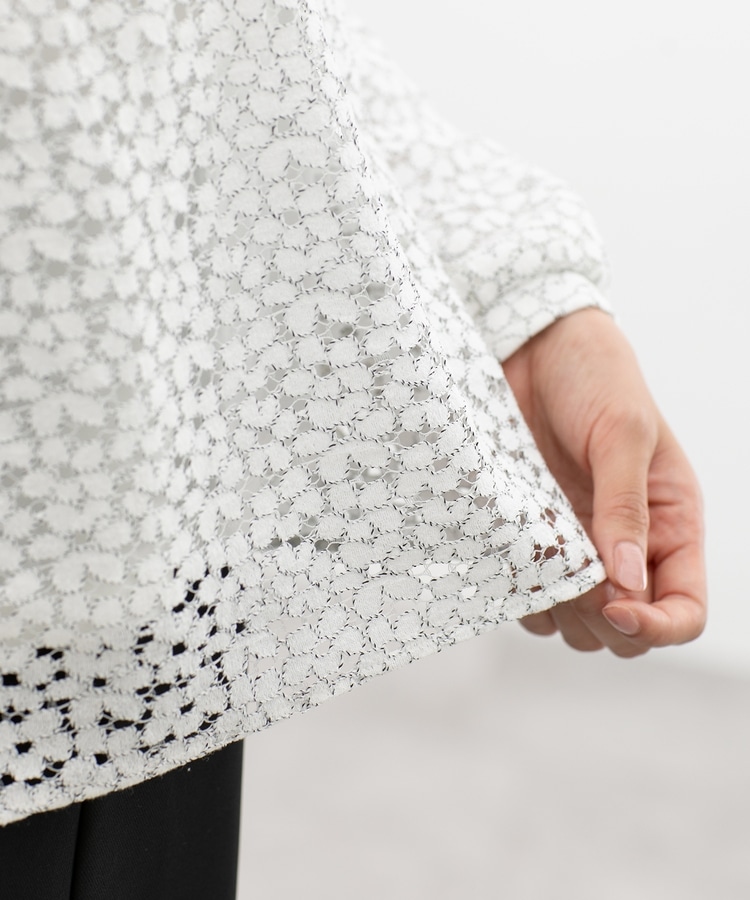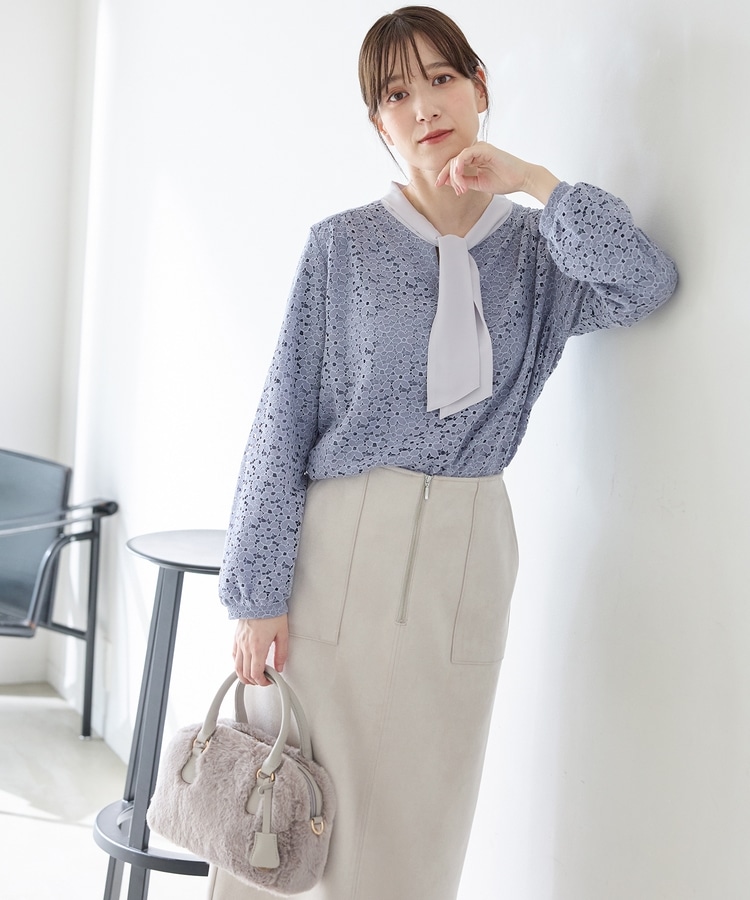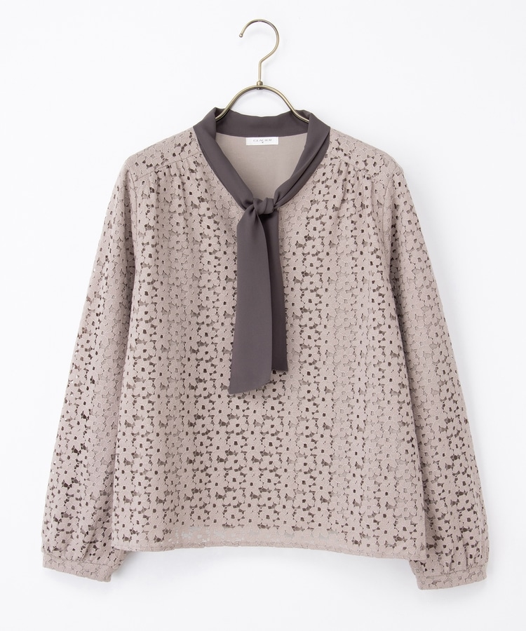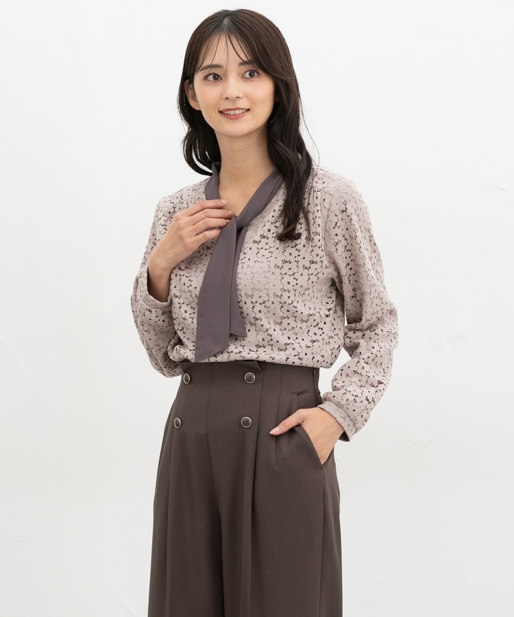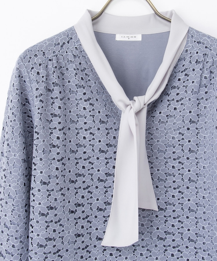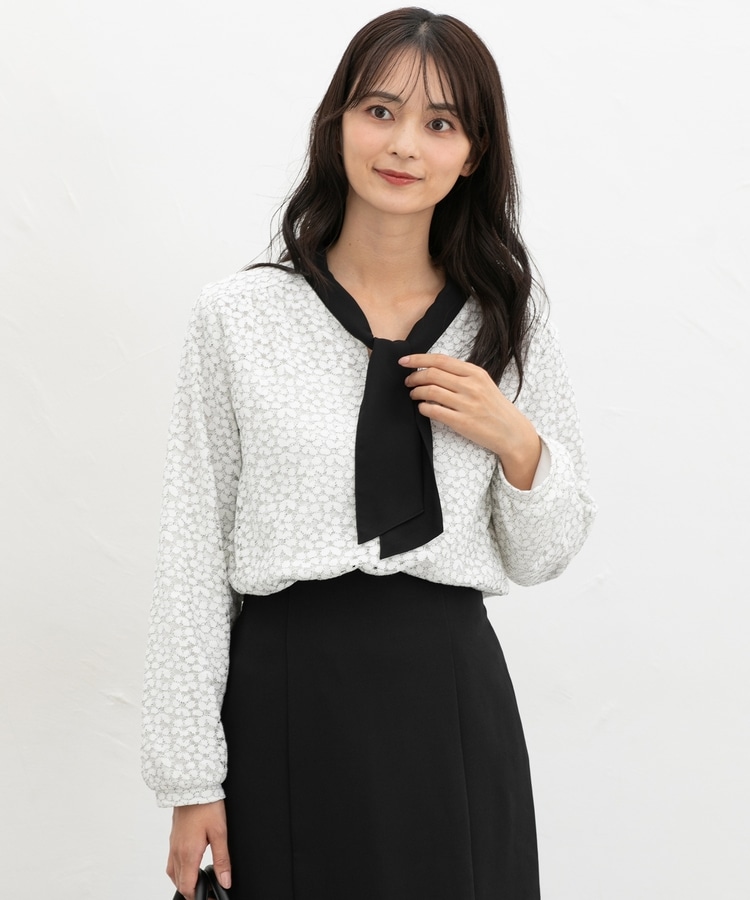 繊細な花柄レースとボウタイが華やかな、1枚で着映えするデザイン。