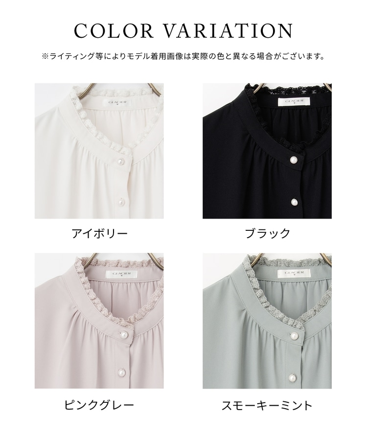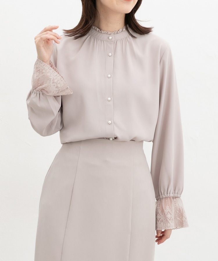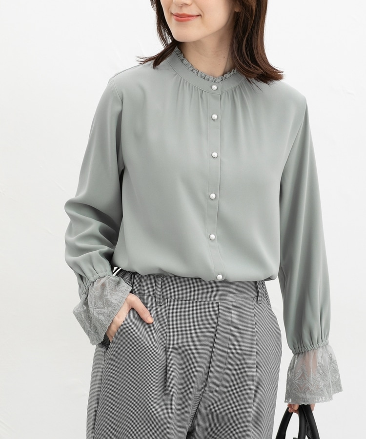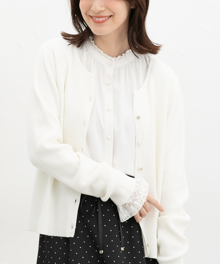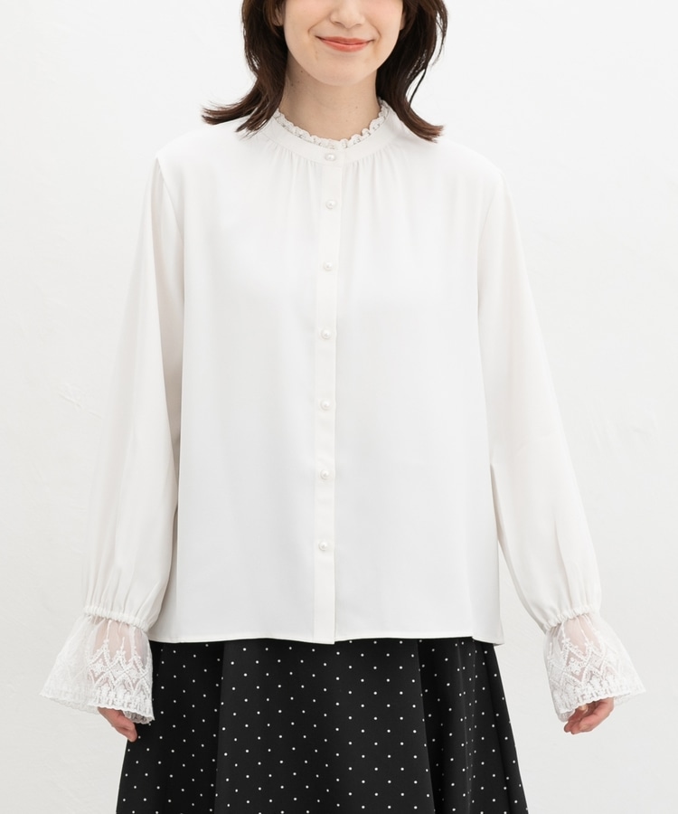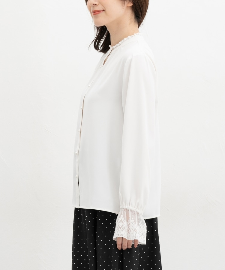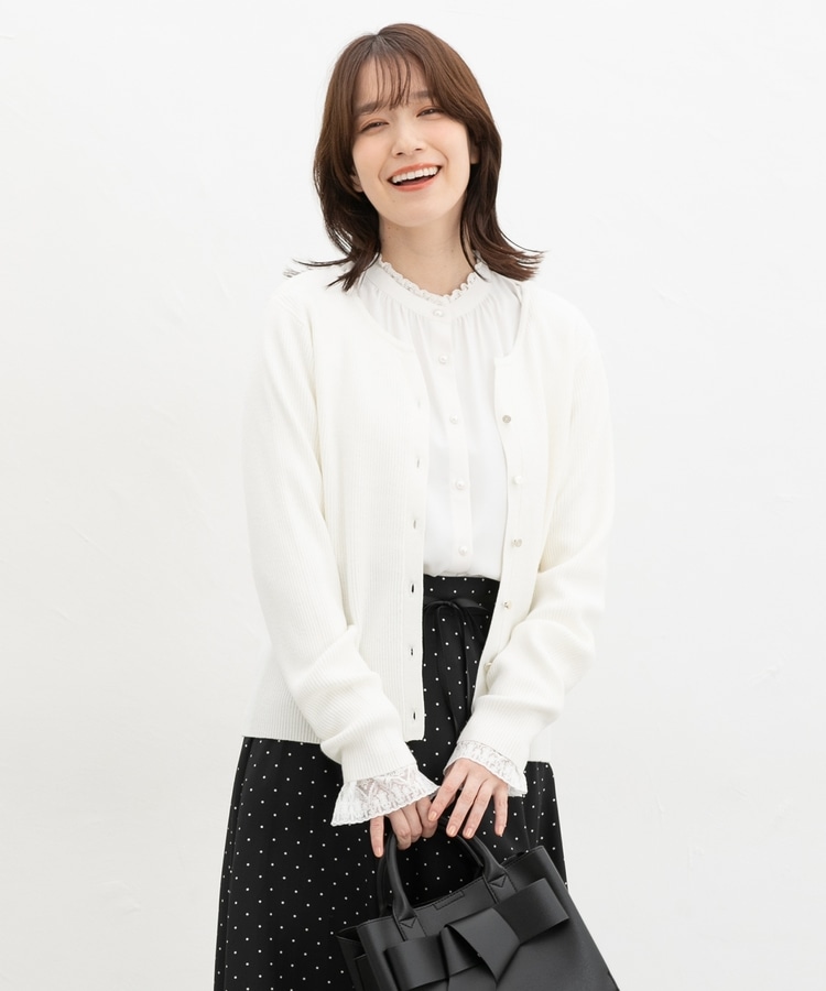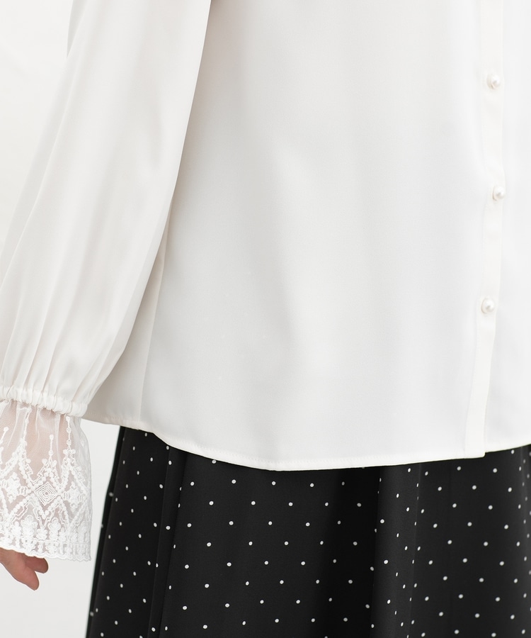 衿ぐりと袖口のレースが上品な、大人可愛いデザイン。
