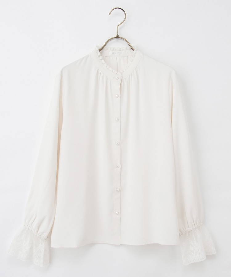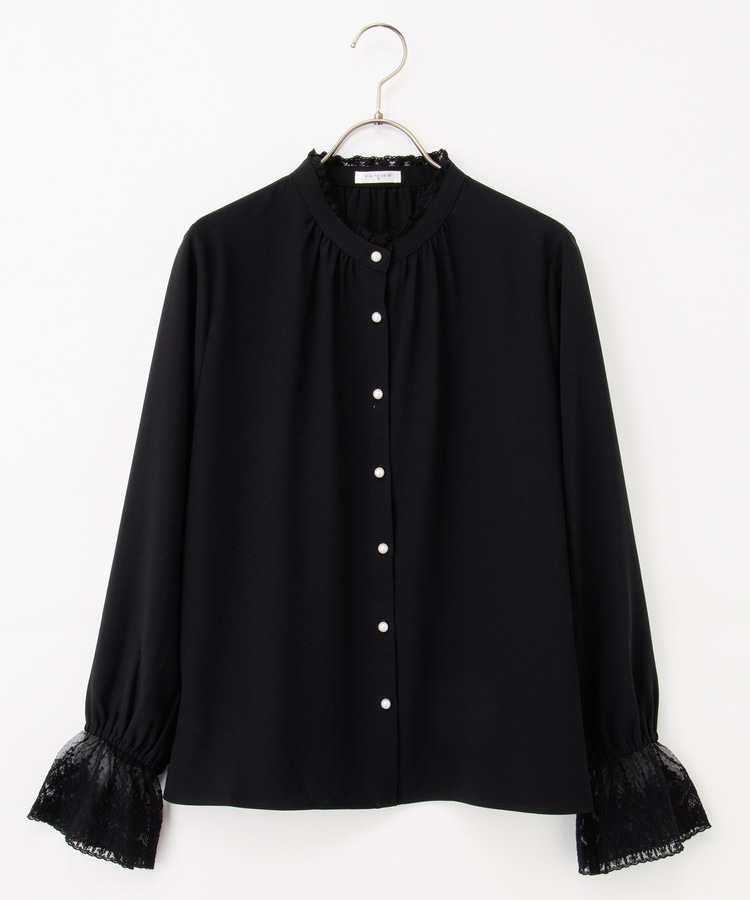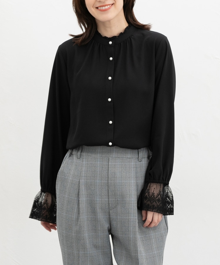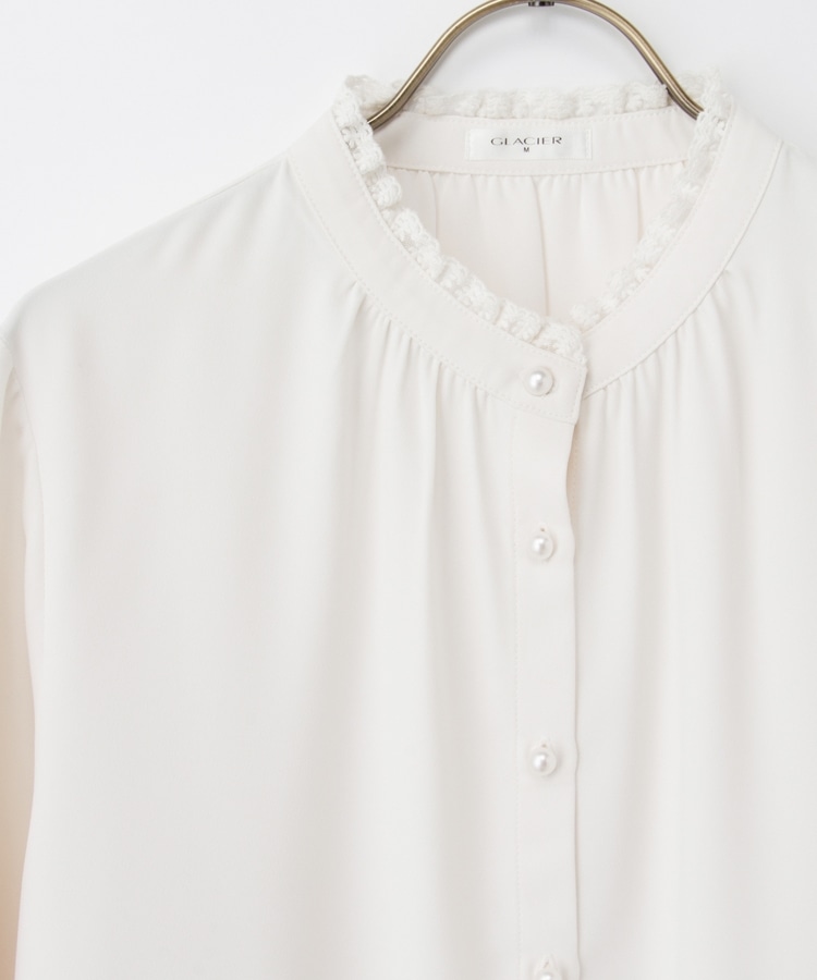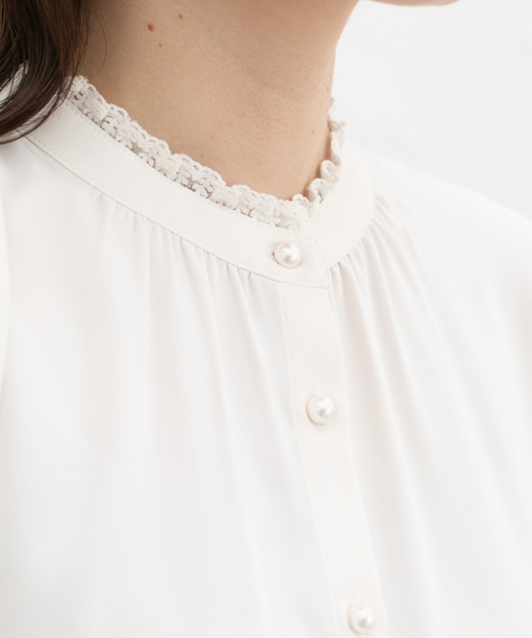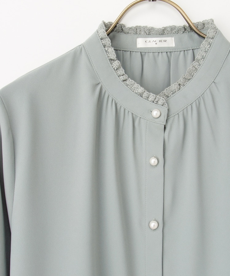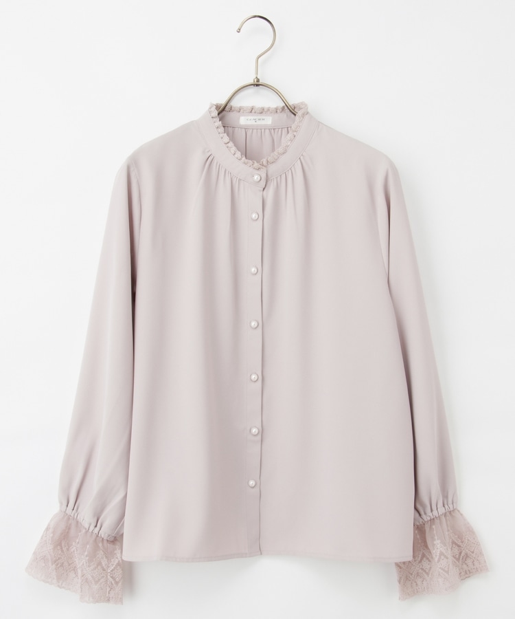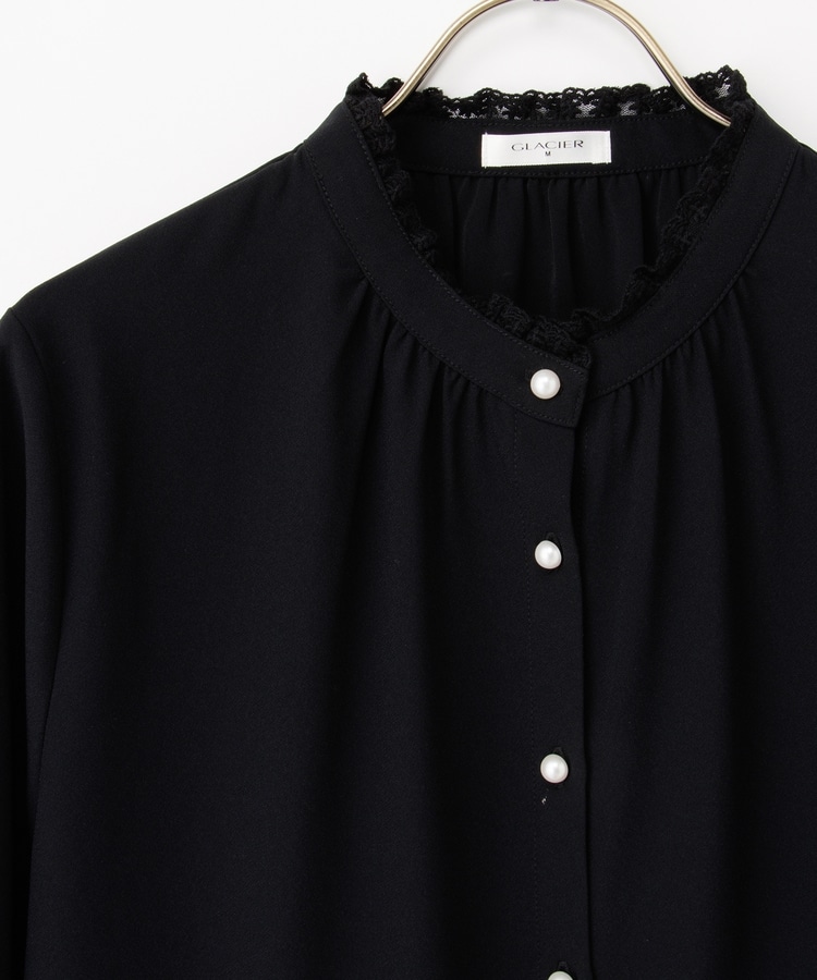 衿ぐりと袖口のレースが上品な、大人可愛いデザイン。