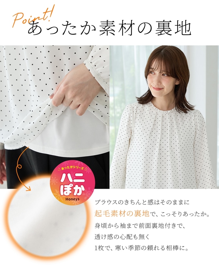 柔らかなジョーゼット素材に、裏起毛であたたかくソフトな肌触りの裏地が付いた『ハニぽか』アイテム。