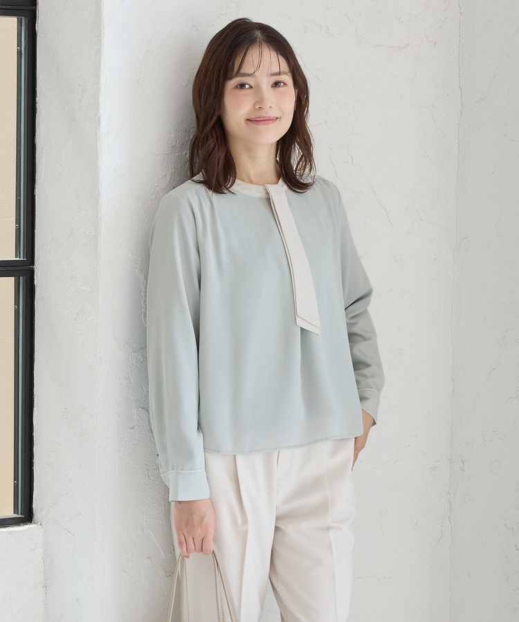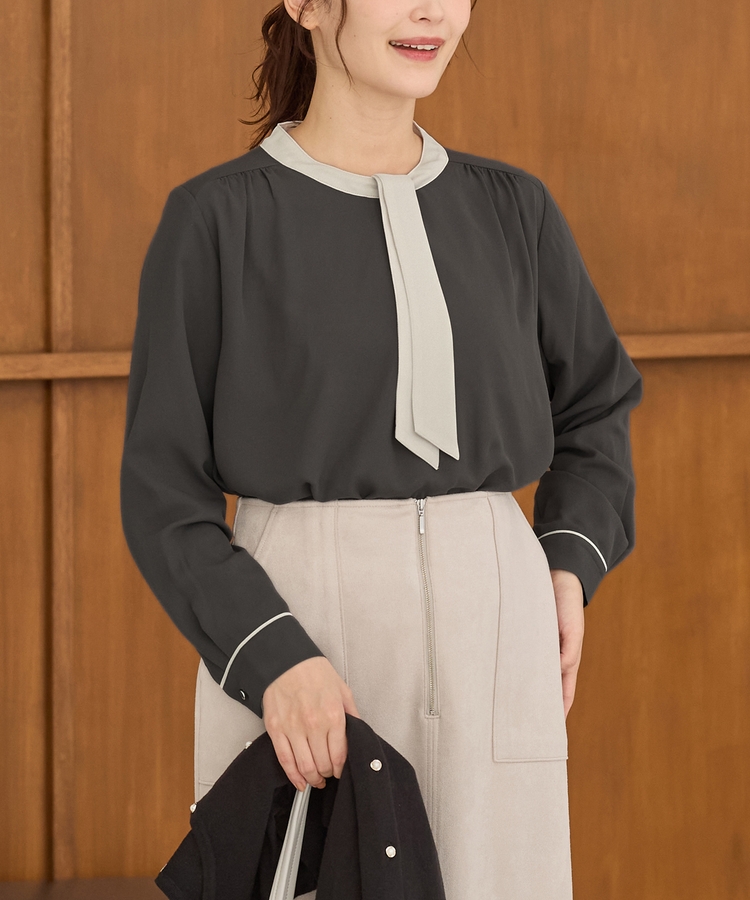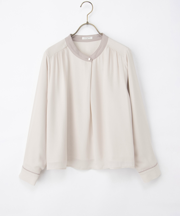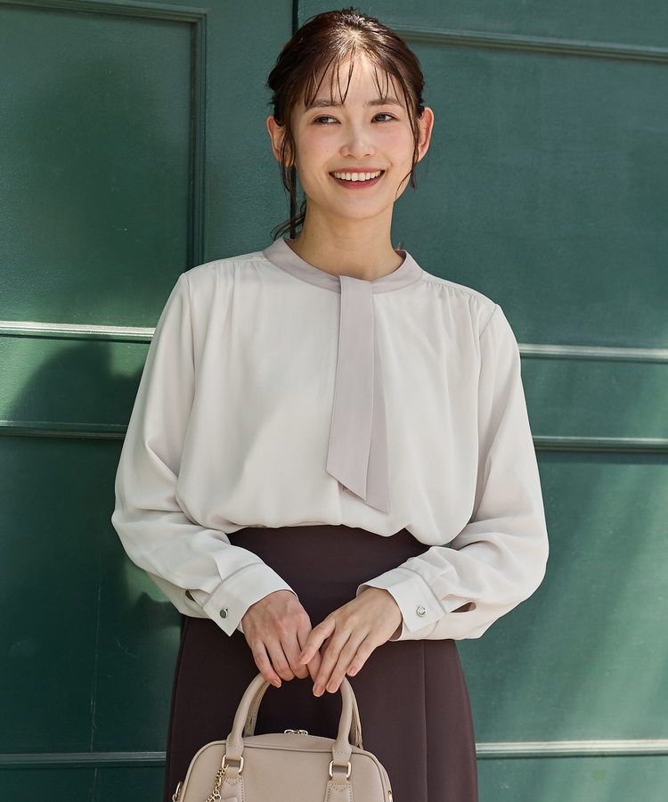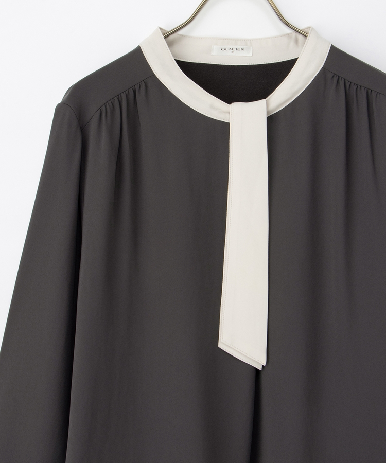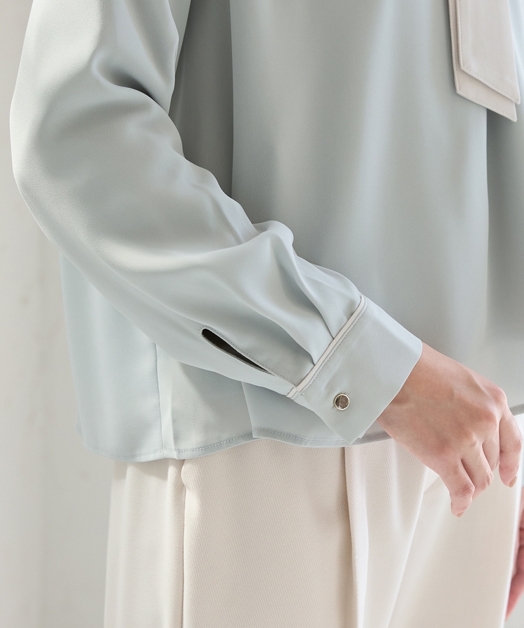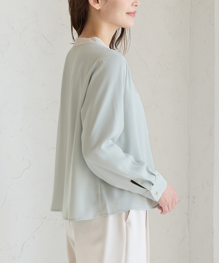 バンドカラーの衿と袖口も配色使いで、シンプルになりすぎないのも嬉しいポイント。