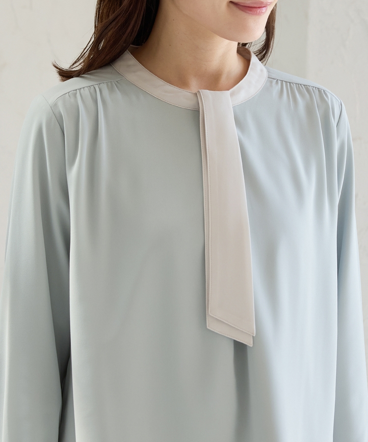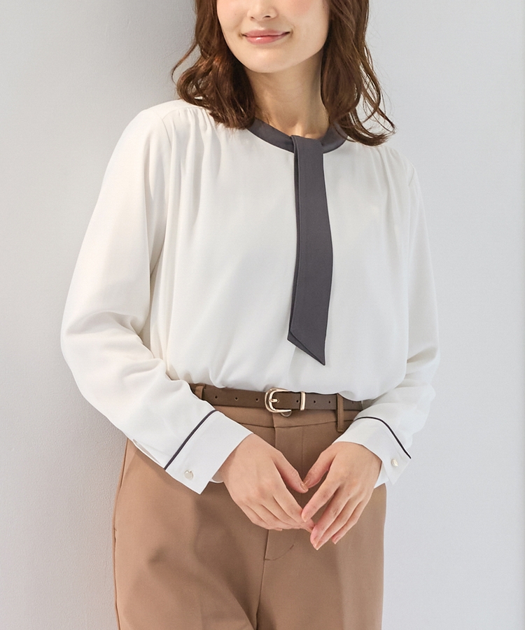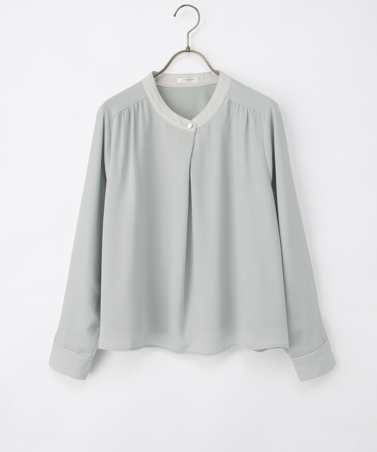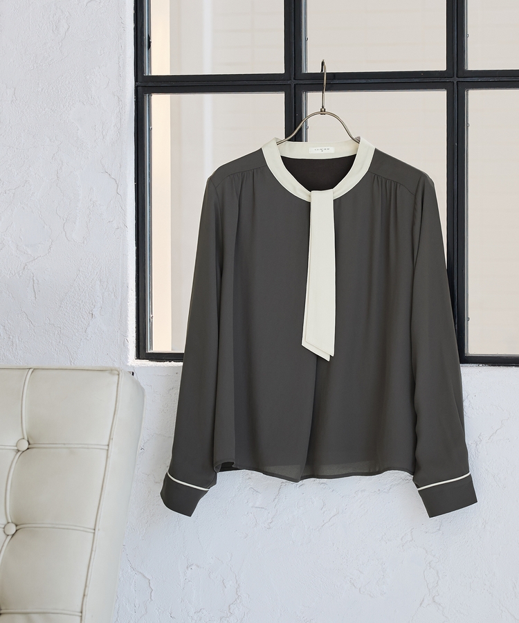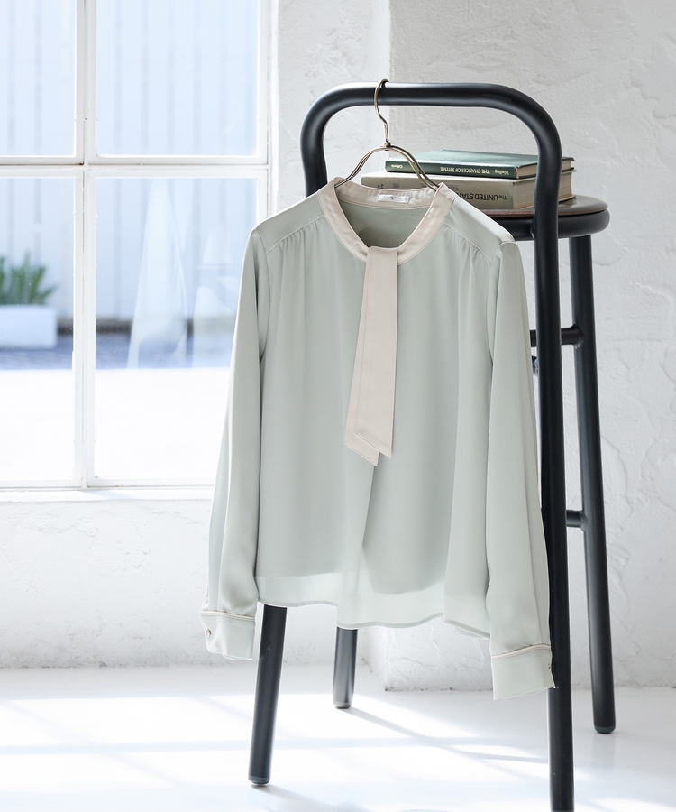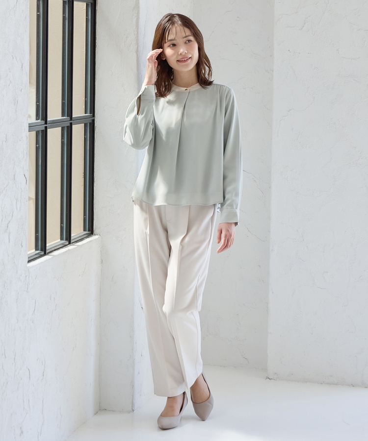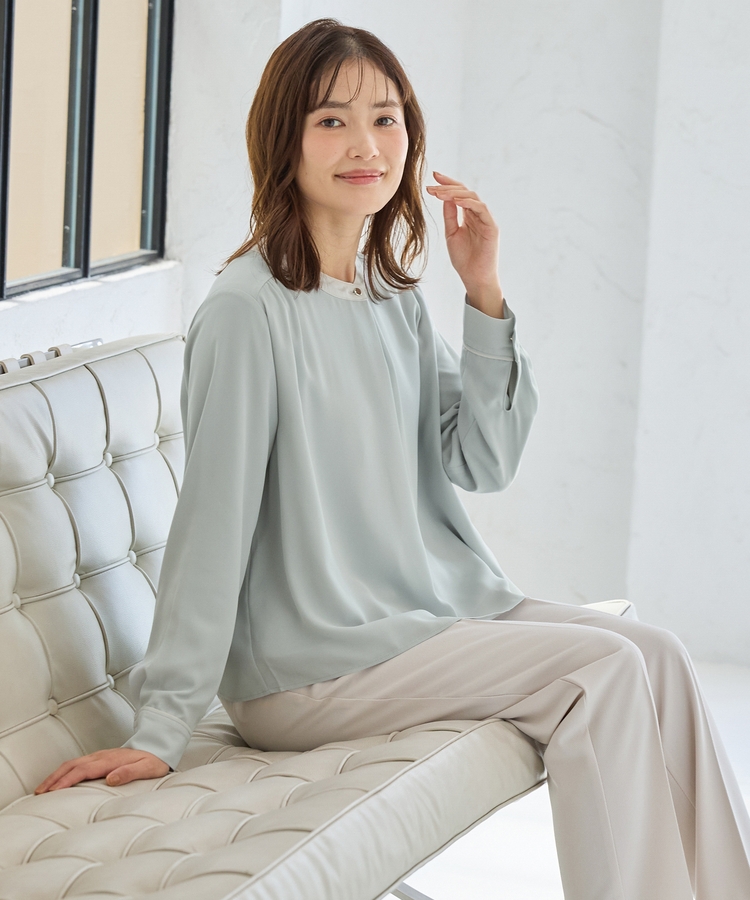 バンドカラーの衿と袖口も配色使いで、シンプルになりすぎないのも嬉しいポイント。