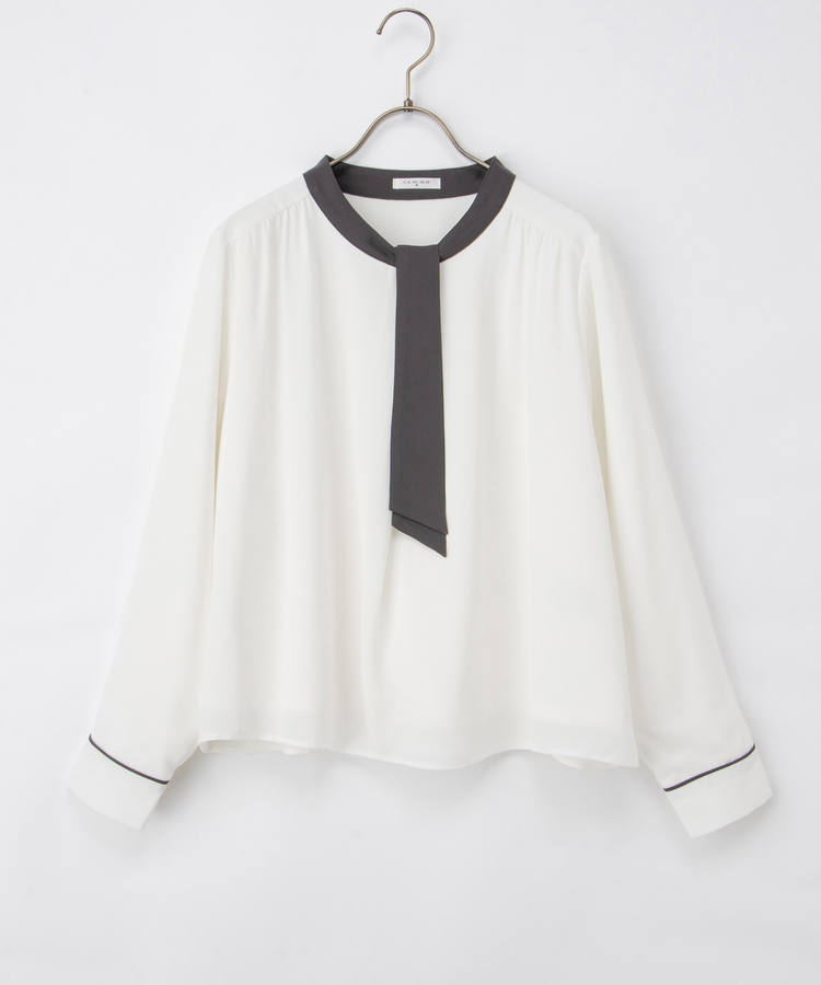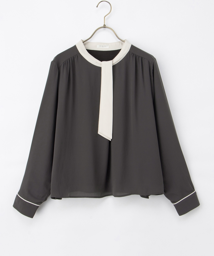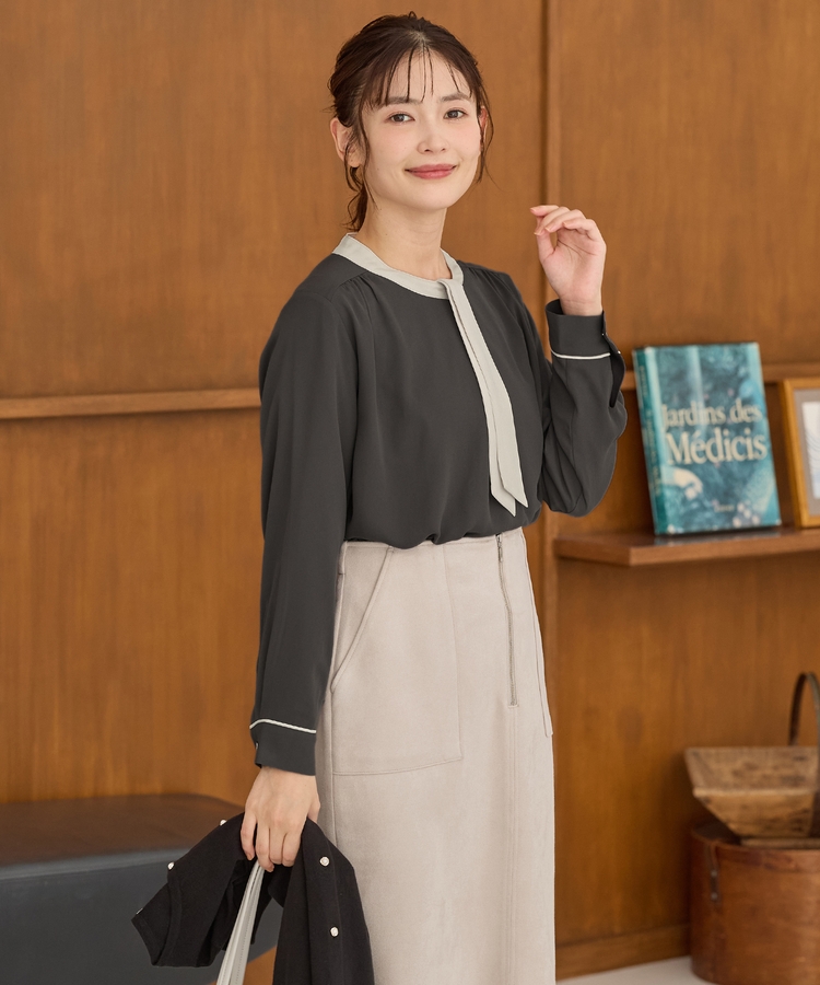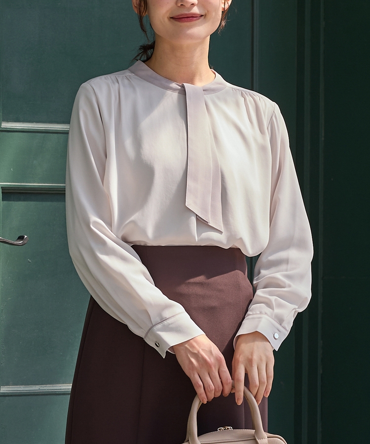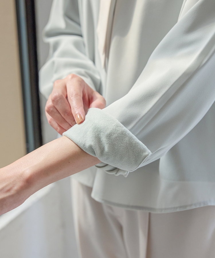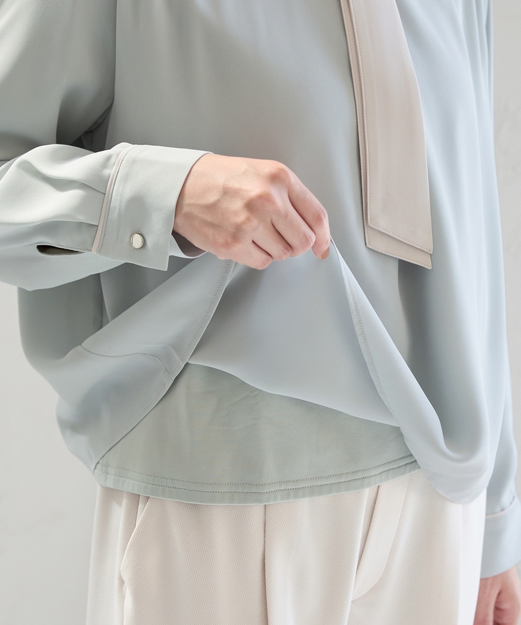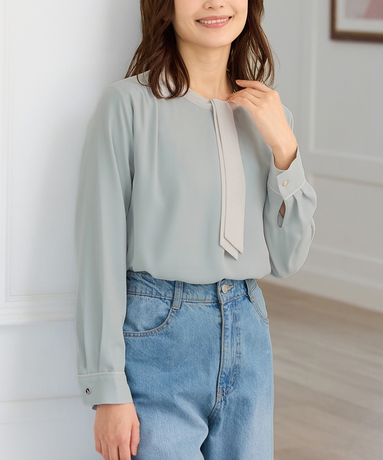 バンドカラーの衿と袖口も配色使いで、シンプルになりすぎないのも嬉しいポイント。