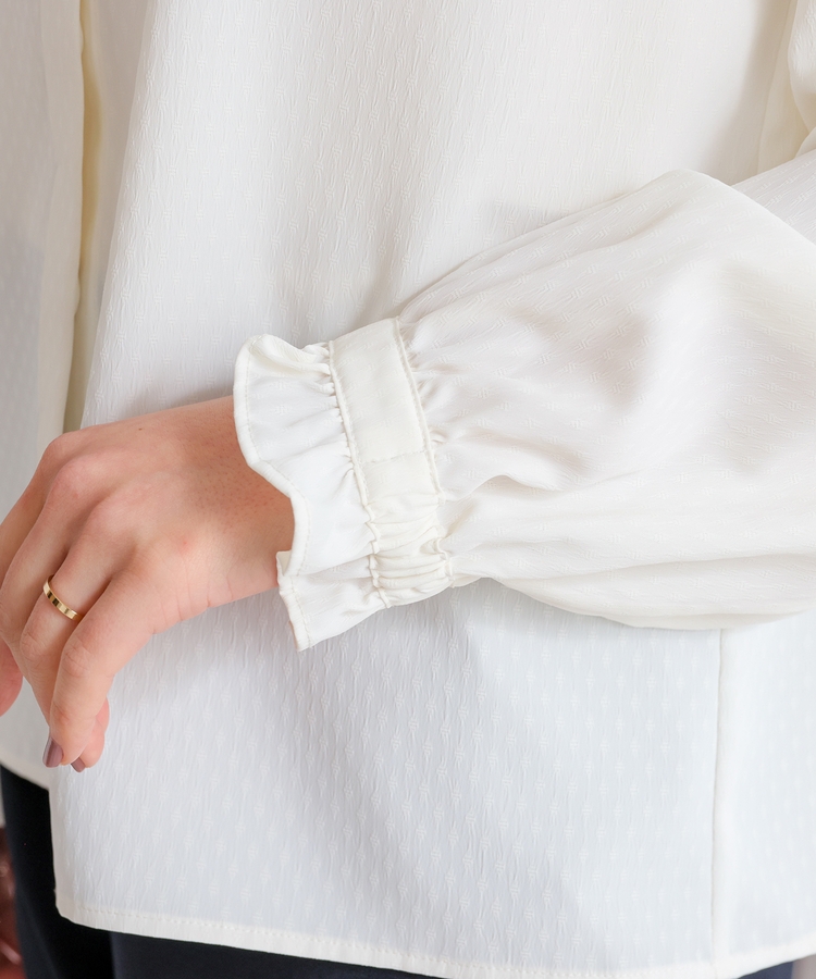 スタンドネックの衿ぐりと袖口にフリルを付けたフェミニンなデザイン。