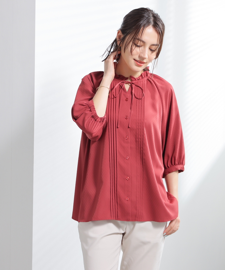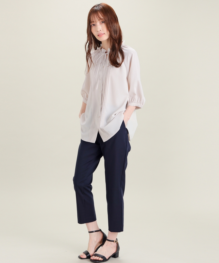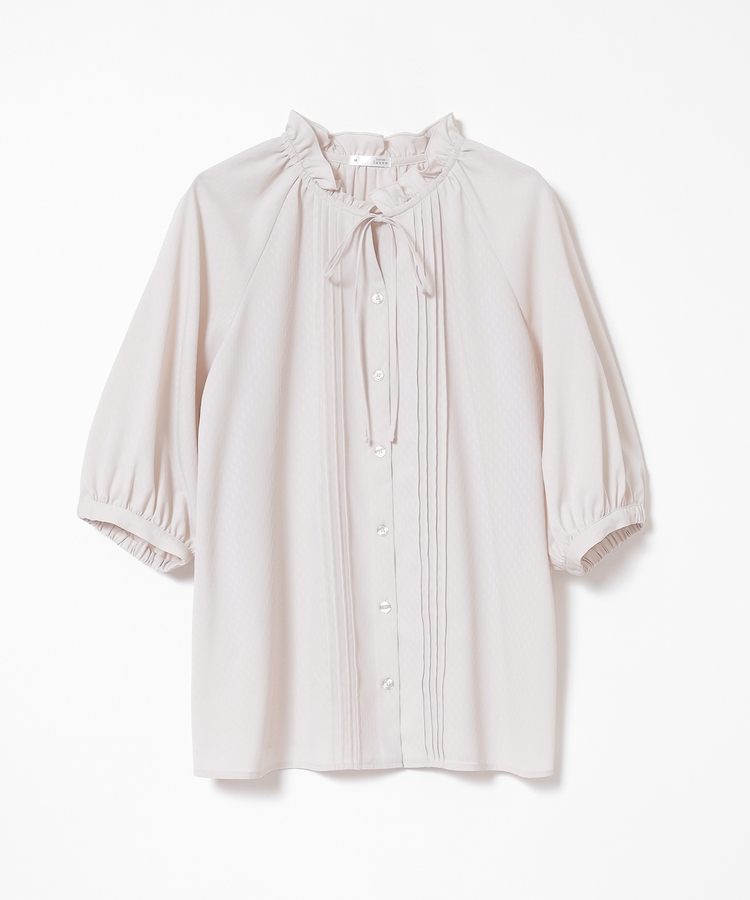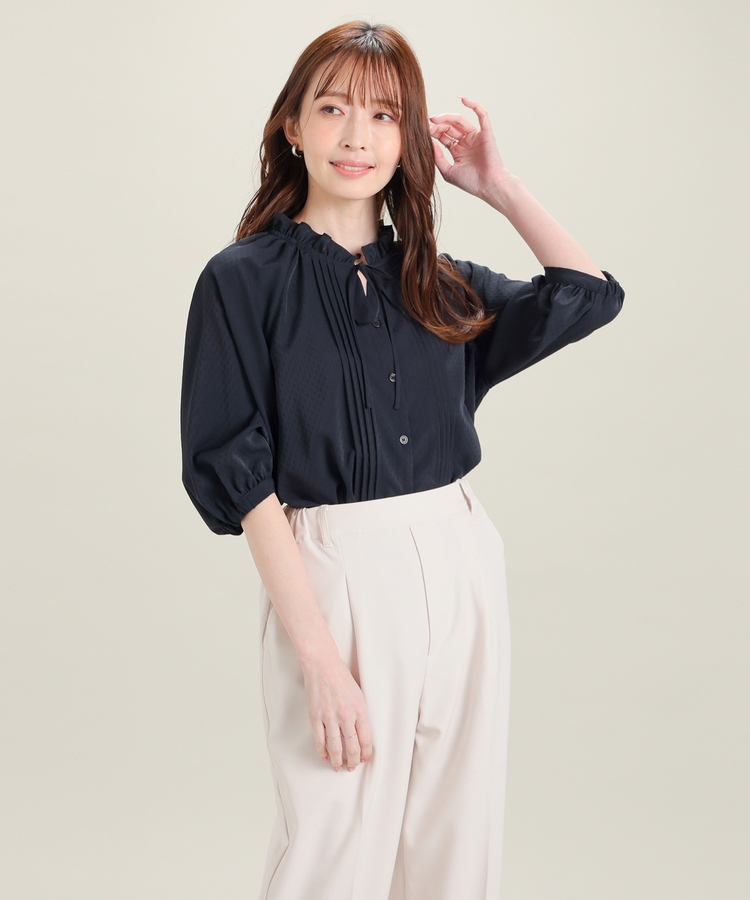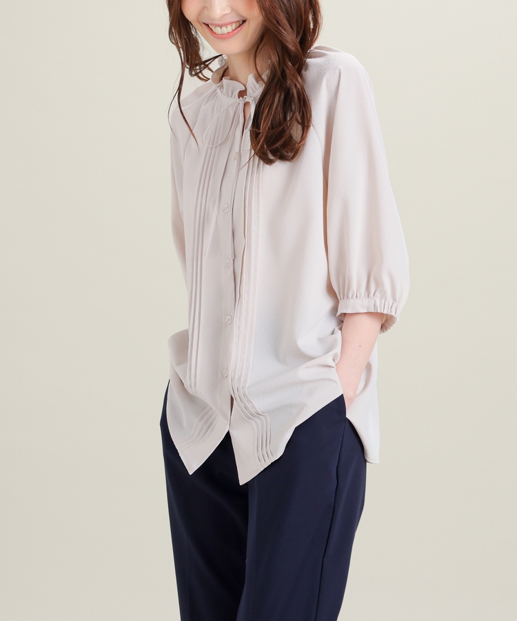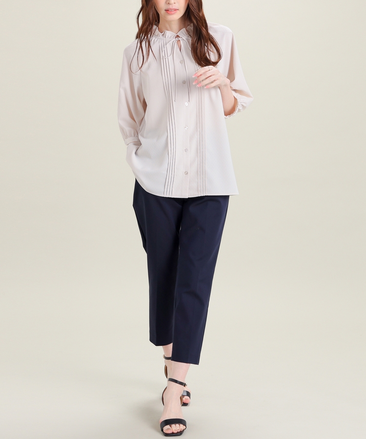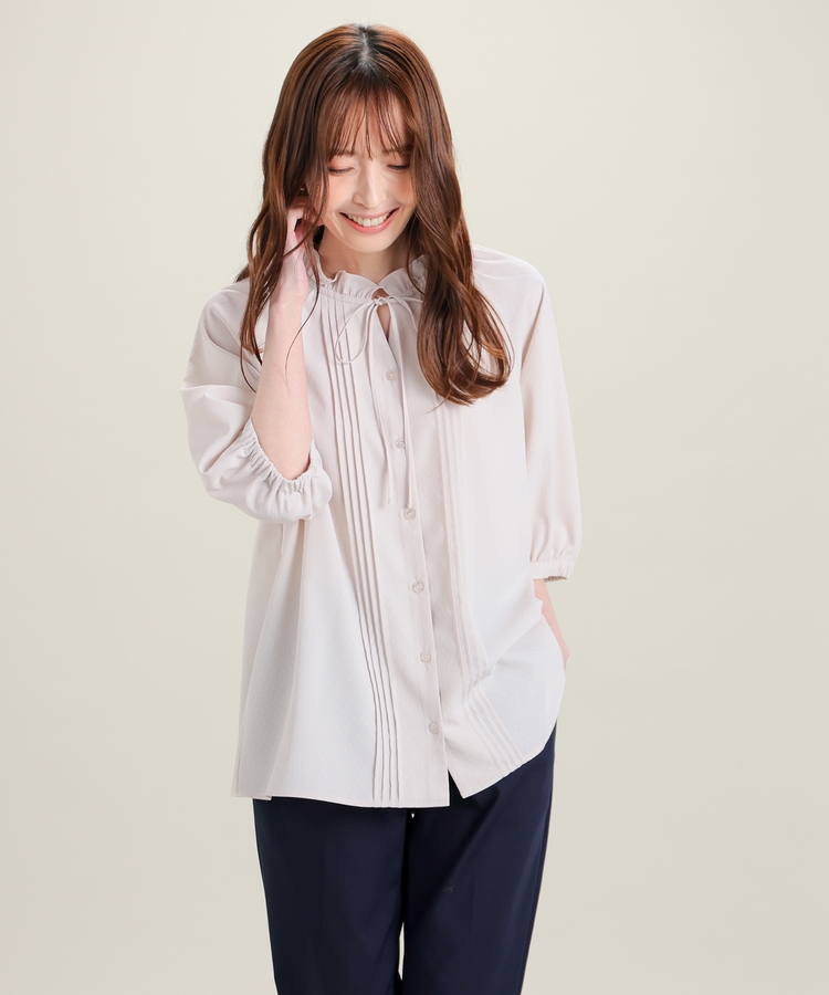 細かなピンタックと控えめなスタンドフリルに、コーデになじみやすい華奢なリボンタイが付いたフェミニンなデザイン。
