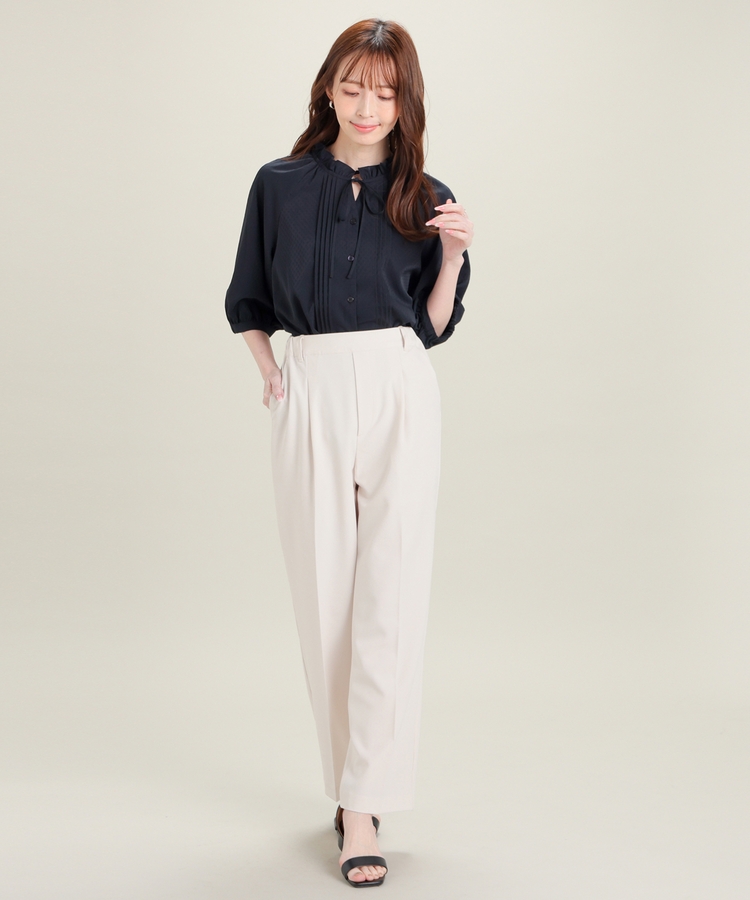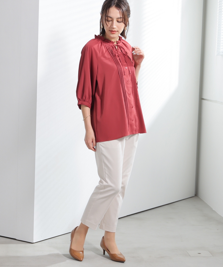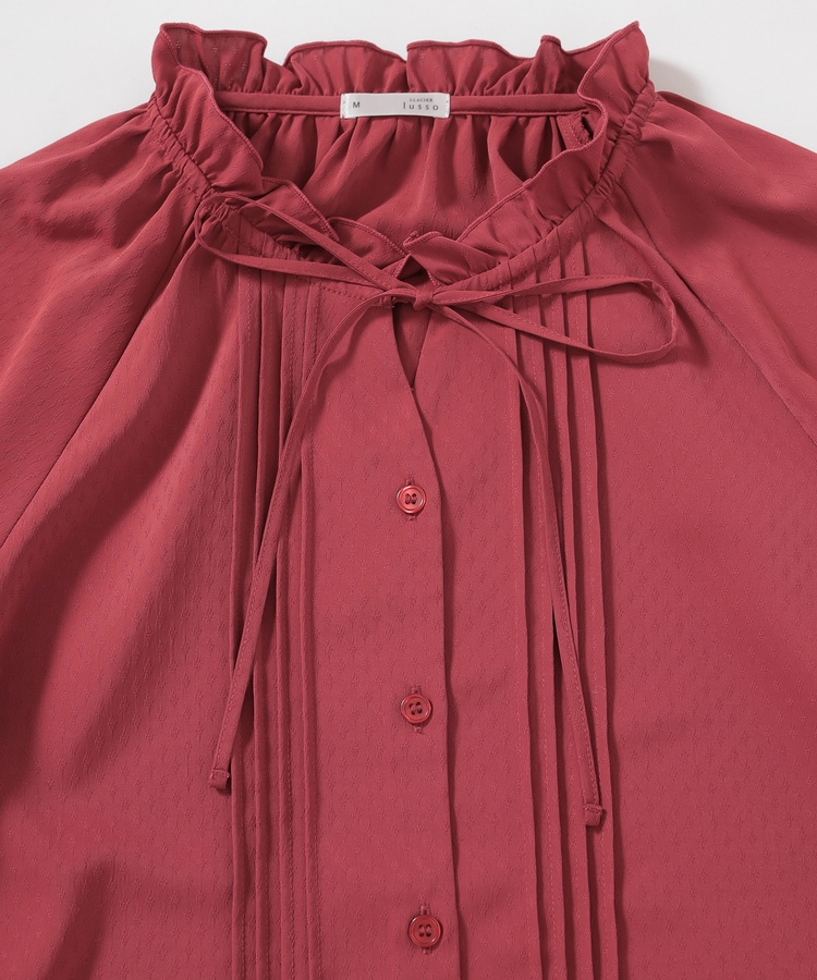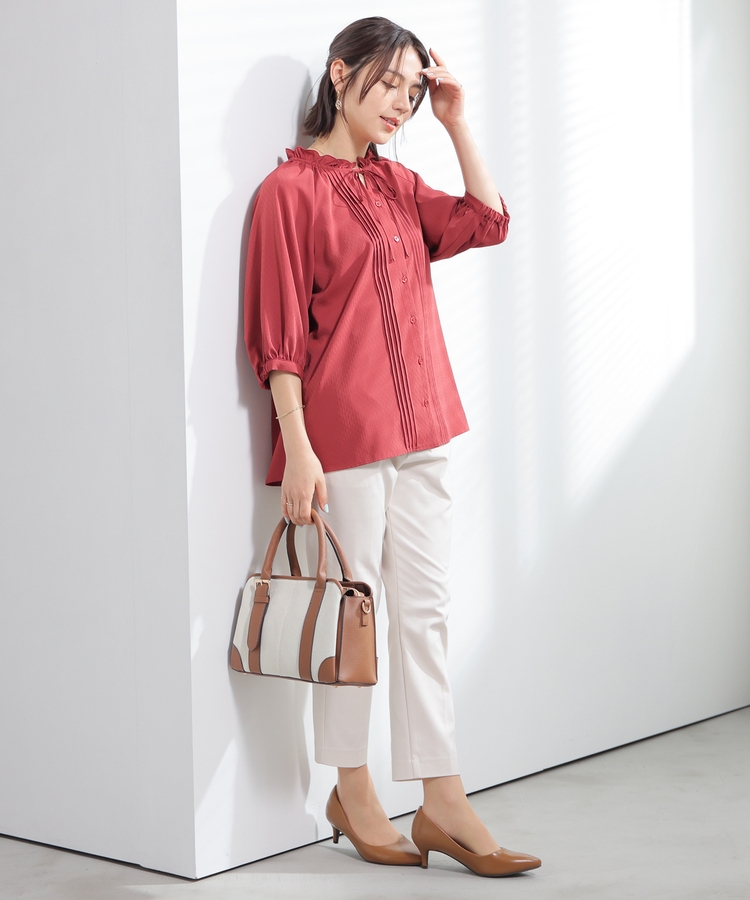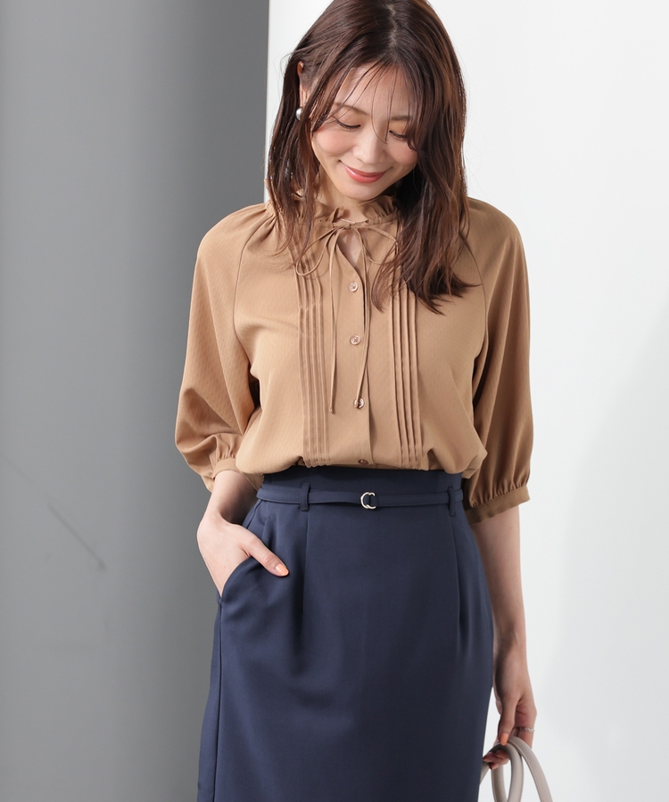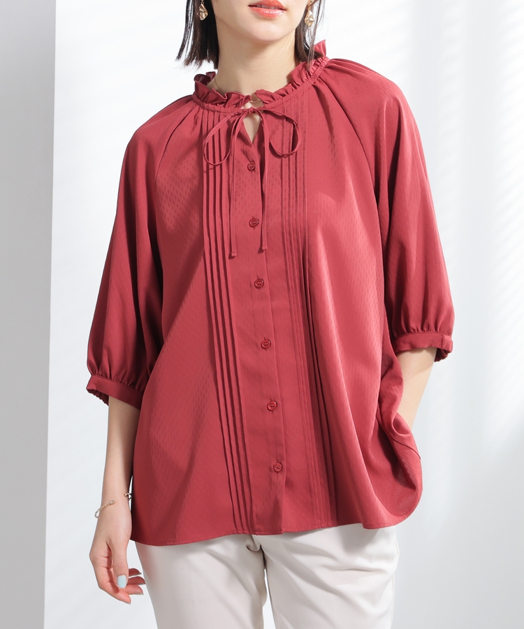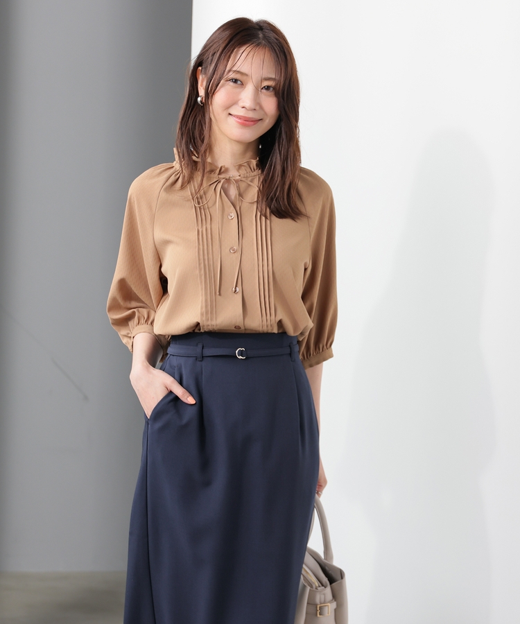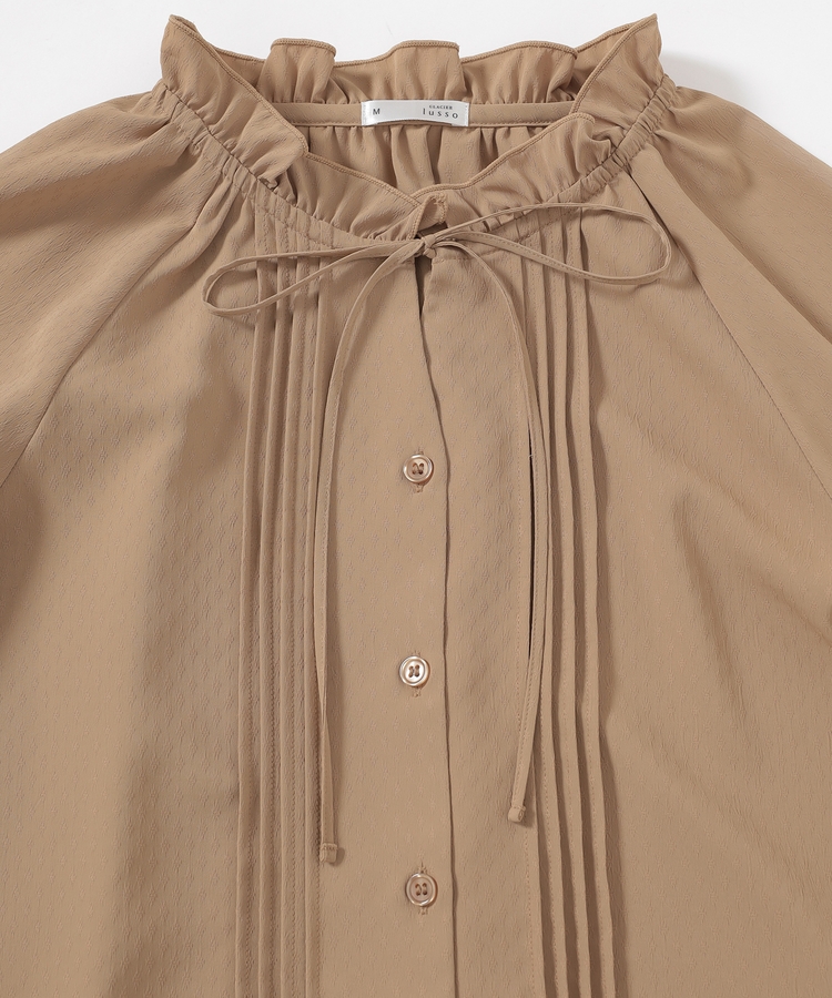 細かなピンタックと控えめなスタンドフリルに、コーデになじみやすい華奢なリボンタイが付いたフェミニンなデザイン。