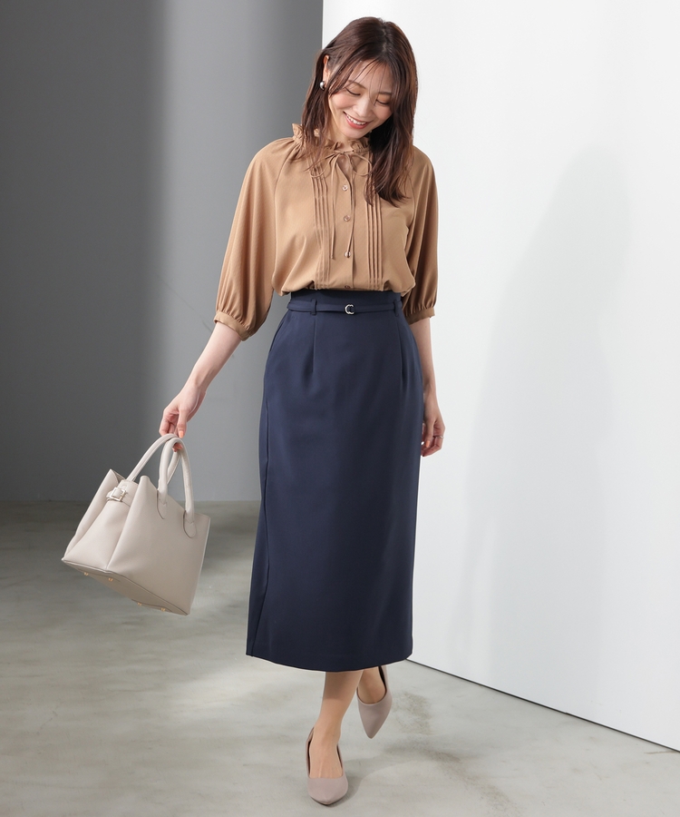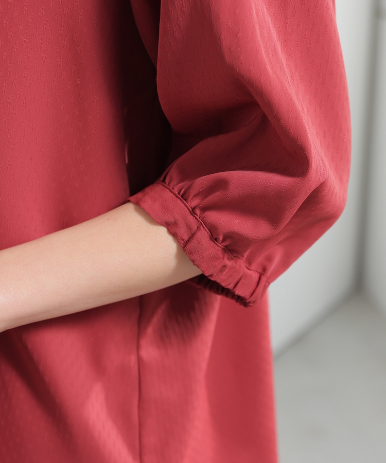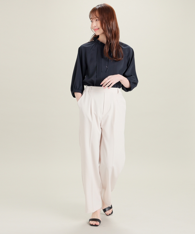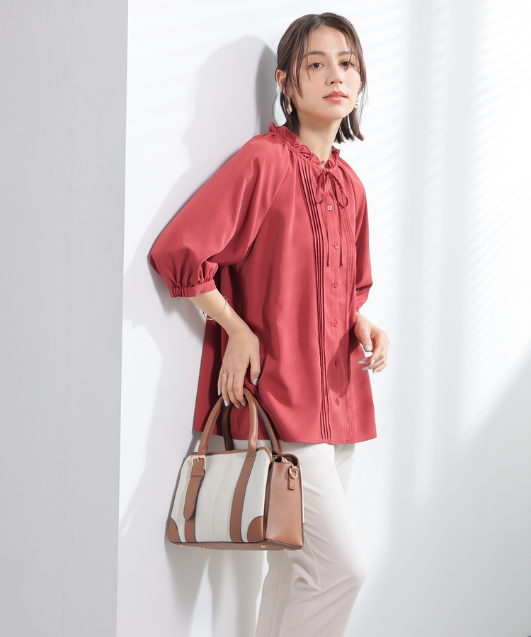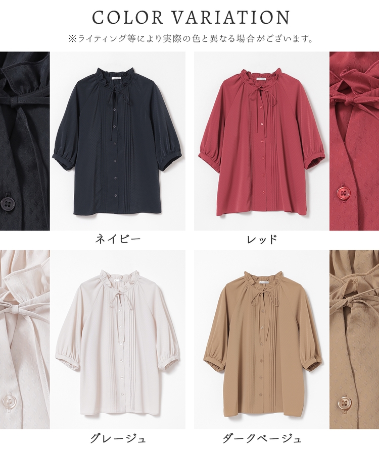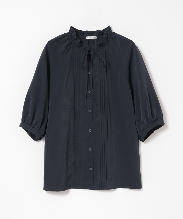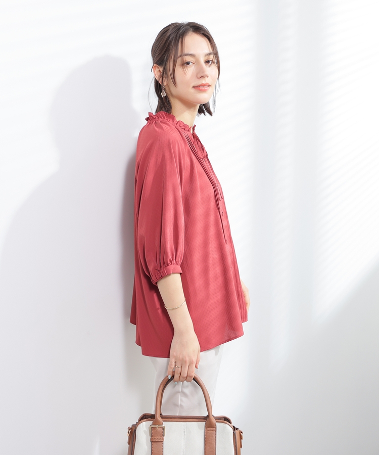 細かなピンタックと控えめなスタンドフリルに、コーデになじみやすい華奢なリボンタイが付いたフェミニンなデザイン。
